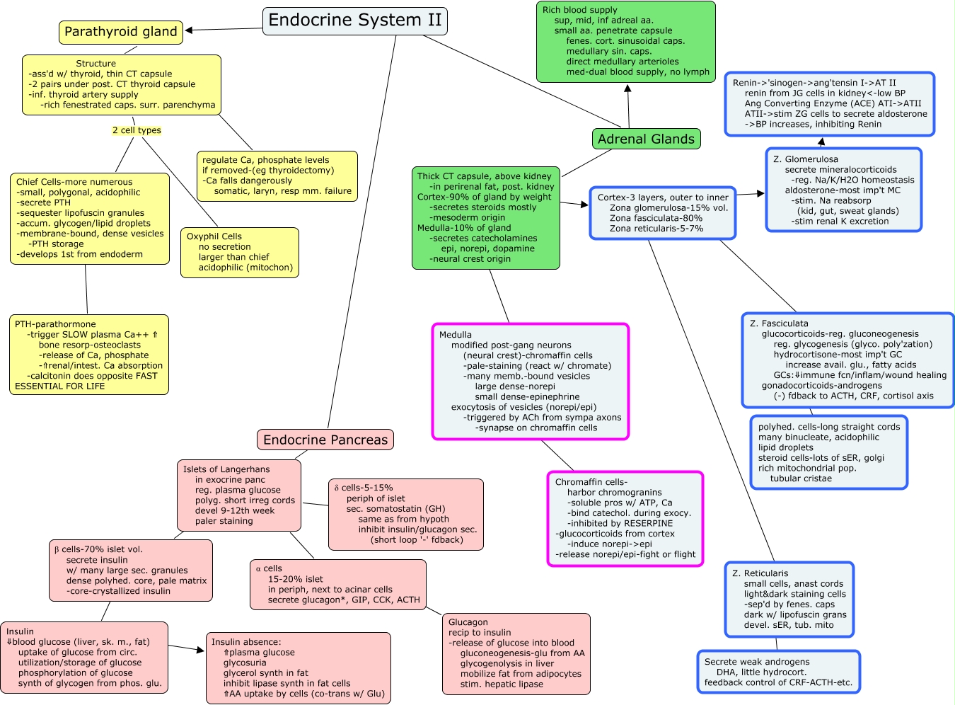 Endocrine System II, Medulla modified post-gang neurons (neural crest)-chromaffin cells -pale-staining (react w/ chromate) -many memb.-bound vesicles large dense-norepi small dense-epinephrine exocytosis of vesicles (norepi/epi) -triggered by ACh from sympa axons -synapse on chromaffin cells ???? Chromaffin cells- harbor chromogranins -soluble pros w/ ATP, Ca -bind catechol. during exocy. -inhibited by RESERPINE -glucocorticoids from cortex -induce norepi->epi -release norepi/epi-fight or flight, Cortex-3 layers, outer to inner Zona glomerulosa-15% vol. Zona fasciculata-80% Zona reticularis-5-7% ???? Z. Reticularis small cells, anast cords light&dark staining cells -sep'd by fenes. caps dark w/ lipofuscin grans devel. sER, tub. mito, Z. Glomerulosa secrete mineralocorticoids -reg. Na/K/H2O homeostasis aldosterone-most imp't MC -stim. Na reabsorp (kid, gut, sweat glands) -stim renal K excretion ???? Renin->'sinogen->ang'tensin I->AT II renin from JG cells in kidney<-low BP Ang Converting Enzyme (ACE) ATI->ATII ATII->stim ZG cells to secrete aldosterone ->BP increases, inhibiting Renin, Z. Fasciculata glucocorticoids-reg. gluconeogenesis reg. glycogenesis (glyco. poly'zation) hydrocortisone-most imp't GC increase avail. glu., fatty acids GCs:⇓immune fcn/inflam/wound healing gonadocorticoids-androgens (-) fdback to ACTH, CRF, cortisol axis ???? polyhed. cells-long straight cords many binucleate, acidophilic lipid droplets steroid cells-lots of sER, golgi rich mitochondrial pop. tubular cristae, Structure -ass'd w/ thyroid, thin CT capsule -2 pairs under post. CT thyroid capsule -inf. thyroid artery supply -rich fenestrated caps. surr. parenchyma 2 cell types Chief Cells-more numerous -small, polygonal, acidophilic -secrete PTH -sequester lipofuscin granules -accum. glycogen/lipid droplets -membrane-bound, dense vesicles -PTH storage -develops 1st from endoderm, Insulin ⇓blood glucose (liver, sk. m., fat) uptake of glucose from circ. utilization/storage of glucose phosphorylation of glucose synth of glycogen from phos. glu. ???? Insulin absence: ⇑plasma glucose glycosuria glycerol synth in fat inhibit lipase synth in fat cells ⇑AA uptake by cells (co-trans w/ Glu), Thick CT capsule, above kidney -in perirenal fat, post. kidney Cortex-90% of gland by weight -secretes steroids mostly -mesoderm origin Medulla-10% of gland -secretes catecholamines epi, norepi, dopamine -neural crest origin ???? Medulla modified post-gang neurons (neural crest)-chromaffin cells -pale-staining (react w/ chromate) -many memb.-bound vesicles large dense-norepi small dense-epinephrine exocytosis of vesicles (norepi/epi) -triggered by ACh from sympa axons -synapse on chromaffin cells, Thick CT capsule, above kidney -in perirenal fat, post. kidney Cortex-90% of gland by weight -secretes steroids mostly -mesoderm origin Medulla-10% of gland -secretes catecholamines epi, norepi, dopamine -neural crest origin ???? Cortex-3 layers, outer to inner Zona glomerulosa-15% vol. Zona fasciculata-80% Zona reticularis-5-7%, Structure -ass'd w/ thyroid, thin CT capsule -2 pairs under post. CT thyroid capsule -inf. thyroid artery supply -rich fenestrated caps. surr. parenchyma 2 cell types Oxyphil Cells no secretion larger than chief acidophilic (mitochon), α cells 15-20% islet in periph, next to acinar cells secrete glucagon*, GIP, CCK, ACTH ???? Glucagon recip to insulin -release of glucose into blood gluconeogenesis-glu from AA glycogenolysis in liver mobilize fat from adipocytes stim. hepatic lipase