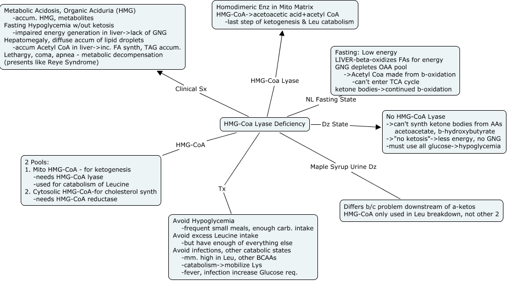 HMG-CoA Lyase Deficiency, HMG-Coa Lyase Deficiency HMG-CoA 2 Pools: 1. Mito HMG-CoA - for ketogenesis -needs HMG-CoA lyase -used for catabolism of Leucine 2. Cytosolic HMG-CoA-for cholesterol synth -needs HMG-CoA reductase, HMG-Coa Lyase Deficiency Clinical Sx Metabolic Acidosis, Organic Aciduria (HMG) -accum. HMG, metabolites Fasting Hypoglycemia w/out ketosis -impaired energy generation in liver->lack of GNG Hepatomegaly, diffuse accum of lipid droplets -accum Acetyl CoA in liver->inc. FA synth, TAG accum. Lethargy, coma, apnea - metabolic decompensation (presents like Reye Syndrome), HMG-Coa Lyase Deficiency NL Fasting State Fasting: Low energy LIVER-beta-oxidizes FAs for energy GNG depletes OAA pool ->Acetyl Coa made from b-oxidation -can't enter TCA cycle ketone bodies->continued b-oxidation, HMG-Coa Lyase Deficiency Maple Syrup Urine Dz Differs b/c problem downstream of a-ketos HMG-CoA only used in Leu breakdown, not other 2, HMG-Coa Lyase Deficiency HMG-Coa Lyase Homodimeric Enz in Mito Matrix HMG-CoA->acetoacetic acid+acetyl CoA -last step of ketogenesis & Leu catabolism, HMG-Coa Lyase Deficiency Tx Avoid Hypoglycemia -frequent small meals, enough carb. intake Avoid excess Leucine intake -but have enough of everything else Avoid infections, other catabolic states -mm. high in Leu, other BCAAs -catabolism->mobilize Lys -fever, infection increase Glucose req., HMG-Coa Lyase Deficiency Dz State No HMG-CoA Lyase ->can't synth ketone bodies from AAs acetoacetate, b-hydroxybutyrate ->"no ketosis"->less energy, no GNG -must use all glucose->hypoglycemia