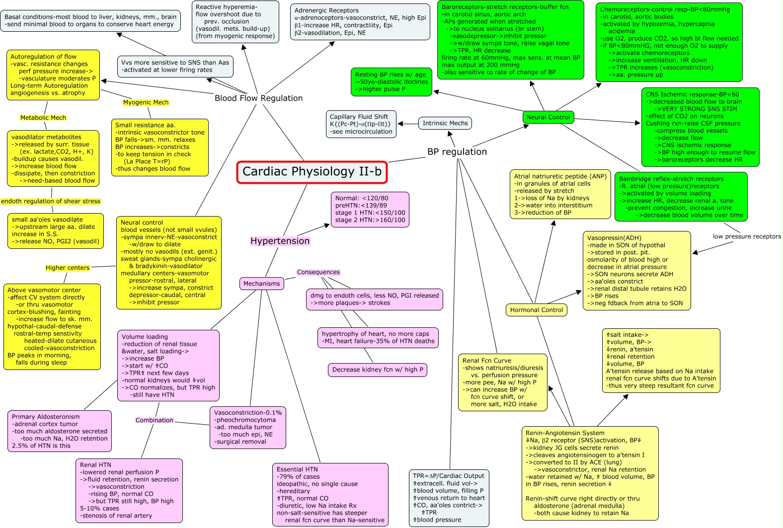Cardiac Physiology II-b, Vasoconstriction-0.1% -pheochromocytoma -ad. medulla tumor -too much epi, NE -surgical removal Combination Renal HTN -lowered renal perfusion P ->fluid retention, renin secretion ->vasoconstriction -rising BP, normal CO ->but TPR still high, BP high 5-10% cases -stenosis of renal artery, Renin-Angiotensin System ⇓Na, β2 receptor (SNS)activation, BP⇓ ->kidney JG cells secrete renin ->cleaves angiotensinogen to a'tensin I ->converted to II by ACE (lung) ->vasoconstrictor, renal Na retention -water retained w/ Na, ⇑ blood volume, BP in BP rises, renin secretion ⇓ Renin-shift curve right directly or thru aldosterone (adrenal medulla) -both cause kidney to retain Na ???? Renal Fcn Curve -shows natriuresis/diuresis vs. perfusion pressure -more pee, Na w/ high P ->can increase BP w/ fcn curve shift, or more salt, H2O intake, Mechanisms ???? Vasoconstriction-0.1% -pheochromocytoma -ad. medulla tumor -too much epi, NE -surgical removal, Mechanisms ???? Volume loading -reduction of renal tissue &water, salt loading-> ->increase BP ->start w/ ⇑CO ->TPR⇑ next few days -normal kidneys would ⇓vol ->CO normalizes, but TPR high -still have HTN, Cardiac Physiology II-b BP regulation Hormonal Control, Neural Control ???? CNS Ischemic response-BPឬ ->decreased blood flow to brain ->VERY STRONG SNS STIM -effect of CO2 on neurons Cushing rxn-raise CSF pressure -compress blood vessels ->decrease flow ->CNS ischemic response ->BP high enough to resume flow ->baroreceptors decrease HR, Hormonal Control Renen Renin-Angiotensin System ⇓Na, β2 receptor (SNS)activation, BP⇓ ->kidney JG cells secrete renin ->cleaves angiotensinogen to a'tensin I ->converted to II by ACE (lung) ->vasoconstrictor, renal Na retention -water retained w/ Na, ⇑ blood volume, BP in BP rises, renin secretion ⇓ Renin-shift curve right directly or thru aldosterone (adrenal medulla) -both cause kidney to retain Na, Autoregulation of flow -vasc. resistance changes perf pressure increase-> -vasculature moderates P Long-term Autoregulation angiogenesis vs. atrophy Myogenic Mech Small resistance aa. -intrinsic vasoconstrictor tone BP falls->sm. mm. relaxes BP increases->constricts -to keep tension in check (La Place T=rP) -thus changes blood flow, Autoregulation of flow -vasc. resistance changes perf pressure increase-> -vasculature moderates P Long-term Autoregulation angiogenesis vs. atrophy Metabolic Mech vasodilator metabolites ->released by surr. tissue (ex. lactate,CO2, H+, K) -buildup causes vasodil. ->increase blood flow -dissipate, then constriction ->need-based blood flow, Cardiac Physiology II-b BP regulation <math xmlns="http://www.w3.org/1998/Math/MathML"> <mtext> TPR=ΔP/Cardiac Output