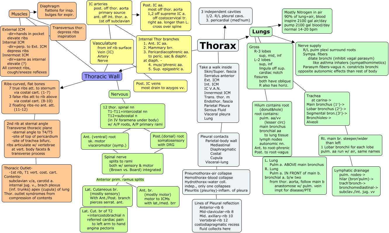 Thorax, Hilum contains root (donut&hole) root contains: pulm. aa/vv (lesser circ) main bronchus bronchial aa to lung tissue lymph nodes autonomic nn. Ant. to root-phrenic Post. to root-vagus ???? L. Lung Pulm a. ABOVE main bronchus R. Lung Pulm a. IN FRONT of main b. bronchial a. b/w two from thor. aorta, follow main b anastomose w/ pulm. vein impt for disease/PTE, 2nd rib at sternal angle Transverse thoracic plane -sternal angle to T4/T5 -site of top of pericardium -site of trachea bifurc. ribs articulate w/ vertebrae at vert. body facets & transverse process ???? Thoracic Outlet- -1st rib, T1 vert. cost. cart. Contents- subclavian v/a, carotid a. internal jug. v., brach plexus (inf. trunks) apex (cupula) of lung Thor. outlet syndromes from compression of contents, Thorax ???? Take a walk inside Skin/Super. fascia Serratus anterior Ext. ICM Int. ICM IC V.A.N. Innermost ICM Trans. thor. m Endothor. fascia Parietal Pleura Serous Fluid Visceral pleura Lung, Post.(dorsal) root somatosensory with DRG ???? Spinal nerve splits to rami both w/ sensory & motor (Brown vs. Board) integrated, Spinal nerve splits to rami both w/ sensory & motor (Brown vs. Board) integrated Anterior prim. ramus splits Ant. br. (mostly motor) motor to ICMs with lat./med. brr, Vasculature from inf rib surface Vein (IC) Artery Nerve ???? IC arteries post. off thor. aorta primary source ant. off int. thor. a. 1st off subclavian, Lungs ???? Gross R-3 lobes sup, mid, inf L-2 lobes sup, inf lingula off sup. cardiac notch fissures both have oblique R also has horiz., Lungs ???? Hilum contains root (donut&hole) root contains: pulm. aa/vv (lesser circ) main bronchus bronchial aa to lung tissue lymph nodes autonomic nn. Ant. to root-phrenic Post. to root-vagus, Ribs-curved, flat bones 7 true ribs att. to sternum via costal cart. (1-7) 3 false ribs att to rib above via costal cart. (8-10) 2 floating ribs-no ant. att. (11-12) ???? 2nd rib at sternal angle Transverse thoracic plane -sternal angle to T4/T5 -site of top of pericardium -site of trachea bifurc. ribs articulate w/ vertebrae at vert. body facets & transverse process, Lungs ???? Nerve supply R/L pulm plexi surround roots Sympa. fibers dilate bronchi (inhibit vagal parasym) like asthma inhalers (sympathomimetics) Parasym fibers-vagus n. constricts bronchi opposite autonomic effects than rest of body