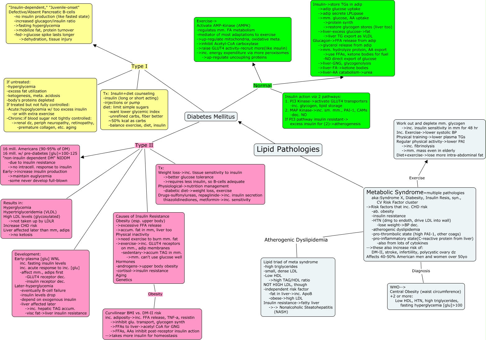 Lipid Pathologies, Causes of Insulin Resistance Obesity (esp. upper body) ->excessive FFA release ->accum. fat in mm, liver too Physical inactivity ->need exercise to burn mm. fat ->exercise->inc. GLUT4 receptors on mm., adip membranes -sedentary->accum TAG in mm. ->mm. can't use glucose well Hormones -androgens->upper body obesity -cortisol->insulin resistance Aging Genetics Obesity Curvilinear BMI vs. DM-II risk inc. adiposity->inc. FFA release, TNF-a, resistin ->inhibit glu. transport, glycogen synth ->FFAs to liver->acetyl CoA for GNG ->FFAs, AAs inhibit post-receptor insulin action -->takes more insulin for homeostasis, Lipid Pathologies ???? Diabetes Mellitus, Metabolic Syndrome=multiple pathologies aka:Syndrome X, Diabesity, Insulin Resis, syn., CV Risk Factor cluster ->Risk factors that inc. CHD risk -ab. obesity -insulin resistance -HTN (dmg to endoth, drive LDL into wall) -lose weight->BP dec. -atherogenic dyslipidemia -pro-thrombolic state (high PAI-1, other coags) -pro-inflammatory state(C-reactive protein from liver) -also from lots of cytokines -->these also increase risk of: DM-II, stroke, infertiility, polycystic ovary dz Affects 40-50% American men and women over 50yo Exercise Work out and deplete mm. glycogen ->inc. insulin sensitivity in mm for 48 hr Inc. Exercise->lower systolic BP Physical training->lower plasma TGs Regular physical activity->lower PAI ->inc. fibrinolysis ->mm. mass even in elderly Diet+exercise->lose more intra-abdominal fat, Diabetes Mellitus Type I Tx: Insulin+diet counseling -insulin (long or short acting) -injections or pump diet: limit simple sugars -want lower glycemic index -unrefined carbs, fiber better ~50% kcal as carbs -balance exercise, diet, insulin, Diabetes Mellitus Type II Causes of Insulin Resistance Obesity (esp. upper body) ->excessive FFA release ->accum. fat in mm, liver too Physical inactivity ->need exercise to burn mm. fat ->exercise->inc. GLUT4 receptors on mm., adip membranes -sedentary->accum TAG in mm. ->mm. can't use glucose well Hormones -androgens->upper body obesity -cortisol->insulin resistance Aging Genetics, Diabetes Mellitus Type I If untreated: -hyperglycemia -excess fat utilization -ketogenesis, meta. acidosis -body's proteins depleted If treated but not fully controlled: -Acute:hypoglycemia w/ too excess insulin -or with extra exercise -Chronic:if blood sugar not tightly controlled: ->renal dz, periph neuropathy, retinopathy, -premature collagen, etc. aging, Diabetes Mellitus Normal Exercise-> Activate AMP-Kinase (AMPK) -regulates mm. FA metabolism -mediator of most adaptations to exercise ->up-regulate mitochondria, oxidative meta. ->inhibit Acetyl-CoA carboxylase ->raise GLUT4 activity-recruit more(like insulin) ->inc. energy expenditure via more peroxisomes ->up-regulate uncoupling proteins, Diabetes Mellitus Normal Insulin->store TGs in adip ->adip glucose uptake ->adip secrete LPLipase ->mm. glucose, AA uptake ->protein synth ->restore glycogen stores (liver too) ->liver-excess glucose->fat ->liver TG export as VLDL Glucagon->FFA release from adip ->glycerol release from adip ->mm. hydrolyze protein, AA export ->use FFAs, ketone bodies for fuel -NO direct export of glucose ->liver-GNG, glycogenolysis ->liver-FA->ketone bodies ->liver-AA catabolism->urea, Metabolic Syndrome=multiple pathologies aka:Syndrome X, Diabesity, Insulin Resis, syn., CV Risk Factor cluster ->Risk factors that inc. CHD risk -ab. obesity -insulin resistance -HTN (dmg to endoth, drive LDL into wall) -lose weight->BP dec. -atherogenic dyslipidemia -pro-thrombolic state (high PAI-1, other coags) -pro-inflammatory state(C-reactive protein from liver) -also from lots of cytokines -->these also increase risk of: DM-II, stroke, infertiility, polycystic ovary dz Affects 40-50% American men and women over 50yo Diagnosis WHO--> Central Obesity (waist circumference) +2 or more: Low HDL, HTN, high triglycerides, fasting hyperglycemia [glu], Metabolic Syndrome=multiple pathologies aka:Syndrome X, Diabesity, Insulin Resis, syn., CV Risk Factor cluster ->Risk factors that inc. CHD risk -ab. obesity -insulin resistance -HTN (dmg to endoth, drive LDL into wall) -lose weight->BP dec. -atherogenic dyslipidemia -pro-thrombolic state (high PAI-1, other coags) -pro-inflammatory state(C-reactive protein from liver) -also from lots of cytokines -->these also increase risk of: DM-II, stroke, infertiility, polycystic ovary dz Affects 40-50% American men and women over 50yo Atherogenic Dyslipidemia Lipid triad of meta syndrome -high triglycerides -small, dense LDL -Low HDL ->high TAG/HDL ratio NOT HIGH LDL, though -independent risk factor -fat in liver->inc. ApoB -obese->high LDL Insulin resistance->fatty liver ->-> Nonalcoholic Steatohepatitis (NASH)