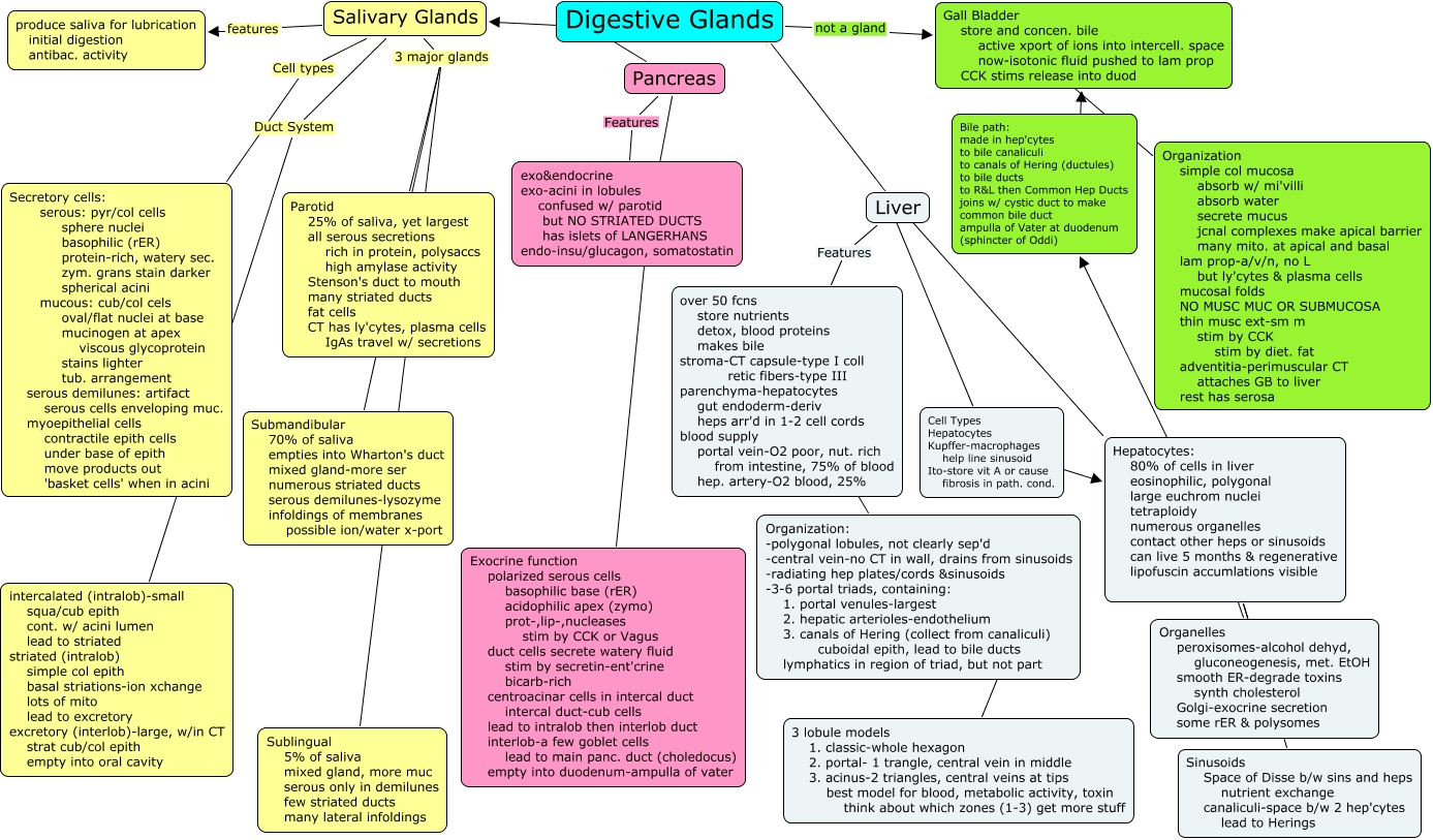 Digestive glands, Salivary Glands 3 major glands Submandibular 70% of saliva empties into Wharton's duct mixed gland-more ser numerous striated ducts serous demilunes-lysozyme infoldings of membranes possible ion/water x-port, Hepatocytes: 80% of cells in liver eosinophilic, polygonal large euchrom nuclei tetraploidy numerous organelles contact other heps or sinusoids can live 5 months & regenerative lipofuscin accumlations visible ???? Bile path: made in hep'cytes to bile canaliculi to canals of Hering (ductules) to bile ducts to R&L then Common Hep Ducts joins w/ cystic duct to make common bile duct ampulla of Vater at duodenum (sphincter of Oddi), Salivary Glands features produce saliva for lubrication initial digestion antibac. activity, Digestive Glands ???? Salivary Glands, Liver ???? Hepatocytes: 80% of cells in liver eosinophilic, polygonal large euchrom nuclei tetraploidy numerous organelles contact other heps or sinusoids can live 5 months & regenerative lipofuscin accumlations visible, Liver Features over 50 fcns store nutrients detox, blood proteins makes bile stroma-CT capsule-type I coll retic fibers-type III parenchyma-hepatocytes gut endoderm-deriv heps arr'd in 1-2 cell cords blood supply portal vein-O2 poor, nut. rich from intestine, 75% of blood hep. artery-O2 blood, 25%, Liver ???? Cell Types Hepatocytes Kupffer-macrophages help line sinusoid Ito-store vit A or cause fibrosis in path. cond., Bile path: made in hep'cytes to bile canaliculi to canals of Hering (ductules) to bile ducts to R&L then Common Hep Ducts joins w/ cystic duct to make common bile duct ampulla of Vater at duodenum (sphincter of Oddi) ???? Gall Bladder store and concen. bile active xport of ions into intercell. space now-isotonic fluid pushed to lam prop CCK stims release into duod, Salivary Glands 3 major glands Sublingual 5% of saliva mixed gland, more muc serous only in demilunes few striated ducts many lateral infoldings, Digestive Glands ???? Pancreas