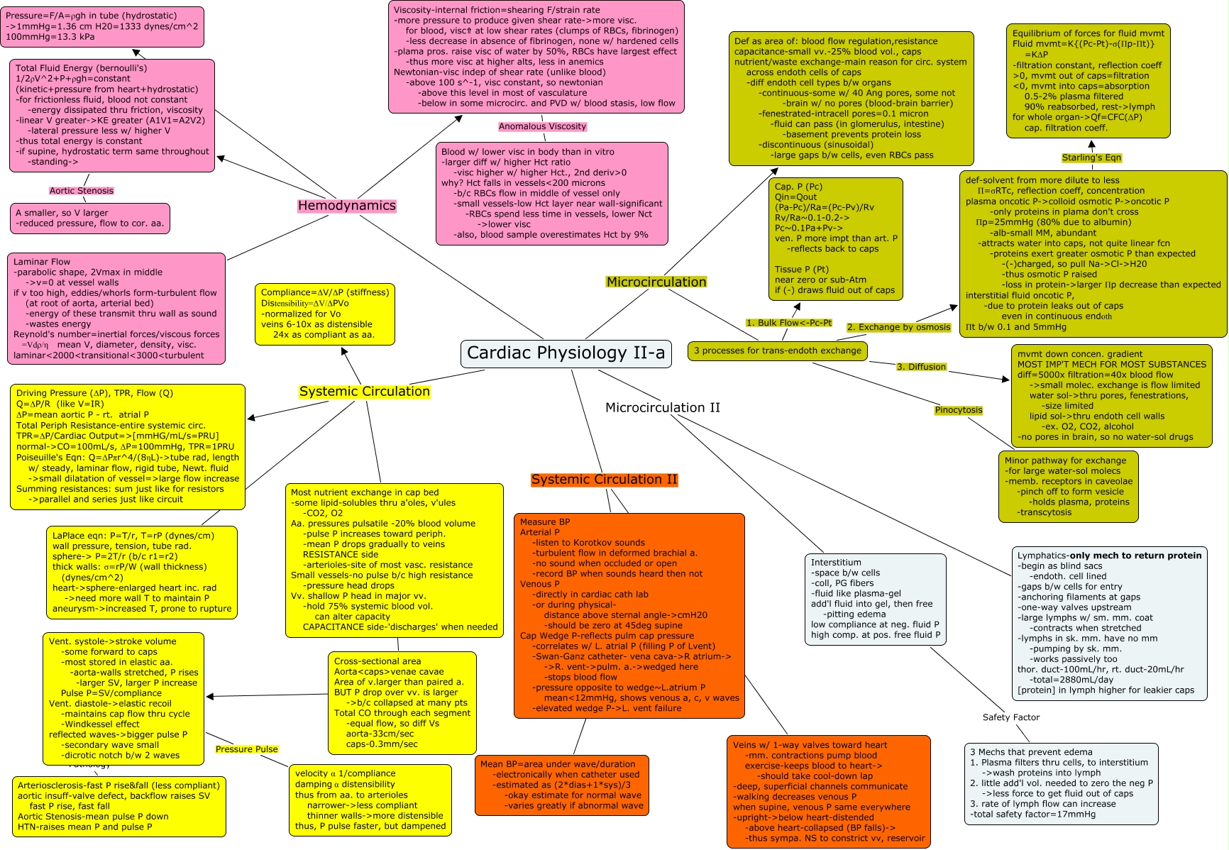 Cardiac Physiology II, Cardiac Physiology II-a Microcirculation 3 processes for trans-endoth exchange, Cardiac Physiology II-a Systemic Circulation LaPlace eqn: P=T/r, T=rP (dynes/cm) wall pressure, tension, tube rad. sphere-> P=2T/r (b/c r1=r2) thick walls: σ=rP/W (wall thickness) (dynes/cm^2) heart->sphere-enlarged heart inc. rad ->need more wall T to maintain P aneurysm->increased T, prone to rupture, <math xmlns="http://www.w3.org/1998/Math/MathML"> <mrow> <mtext> Total Fluid Energy (bernoulli's)