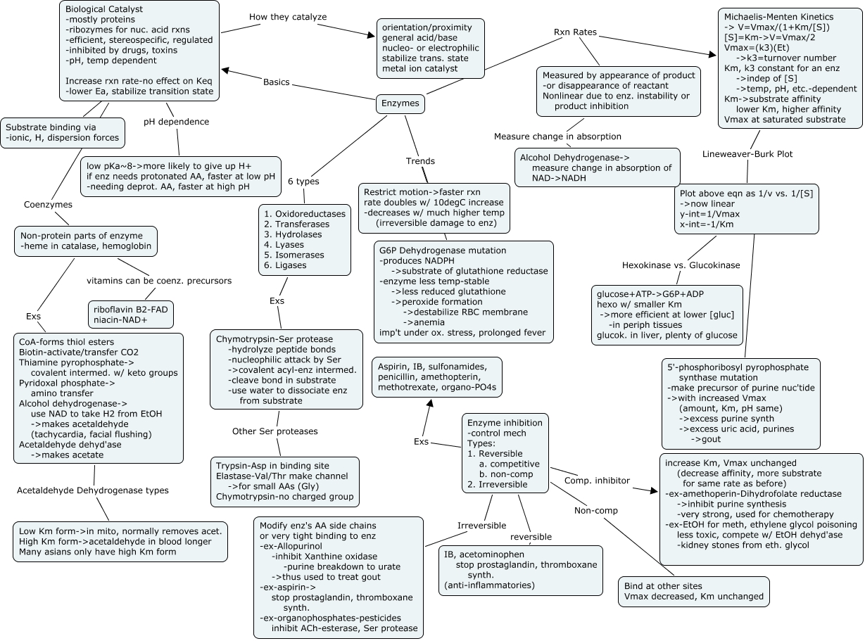 Enzymes 1-2, Enzyme inhibition -control mech Types: 1. Reversible a. competitive b. non-comp 2. Irreversible Irreversible Modify enz's AA side chains or very tight binding to enz -ex-Allopurinol -inhibit Xanthine oxidase -purine breakdown to urate ->thus used to treat gout -ex-aspirin-> stop prostaglandin, thromboxane synth. -ex-organophosphates-pesticides inhibit ACh-esterase, Ser protease, Plot above eqn as 1/v vs. 1/[S] ->now linear y-int=1/Vmax x-int=-1/Km Hexokinase vs. Glucokinase glucose+ATP->G6P+ADP hexo w/ smaller Km ->more efficient at lower [gluc] -in periph tissues glucok. in liver, plenty of glucose, Enzyme inhibition -control mech Types: 1. Reversible a. competitive b. non-comp 2. Irreversible Comp. inhibitor increase Km, Vmax unchanged (decrease affinity, more substrate for same rate as before) -ex-amethoperin-Dihydrofolate reductase ->inhibit purine synthesis -very strong, used for chemotherapy -ex-EtOH for meth, ethylene glycol poisoning less toxic, compete w/ EtOH dehyd'ase -kidney stones from eth. glycol, Enzymes Trends G6P Dehydrogenase mutation -produces NADPH ->substrate of glutathione reductase -enzyme less temp-stable ->less reduced glutathione ->peroxide formation ->destabilize RBC membrane ->anemia imp't under ox. stress, prolonged fever, Michaelis-Menten Kinetics -> V=Vmax/(1+Km/[S]) [S]=Km->V=Vmax/2 Vmax=(k3)(Et) ->k3=turnover number Km, k3 constant for an enz ->indep of [S] ->temp, pH, etc.-dependent Km->substrate affinity lower Km, higher affinity Vmax at saturated substrate Lineweaver-Burk Plot Plot above eqn as 1/v vs. 1/[S] ->now linear y-int=1/Vmax x-int=-1/Km, Non-protein parts of enzyme -heme in catalase, hemoglobin Exs CoA-forms thiol esters Biotin-activate/transfer CO2 Thiamine pyrophosphate-> covalent intermed. w/ keto groups Pyridoxal phosphate-> amino transfer Alcohol dehydrogenase-> use NAD to take H2 from EtOH ->makes acetaldehyde (tachycardia, facial flushing) Acetaldehyde dehyd'ase ->makes acetate, 1. Oxidoreductases 2. Transferases 3. Hydrolases 4. Lyases 5. Isomerases 6. Ligases Exs Chymotrypsin-Ser protease -hydrolyze peptide bonds -nucleophilic attack by Ser ->covalent acyl-enz intermed. -cleave bond in substrate -use water to dissociate enz from substrate, Enzymes Rxn Rates Michaelis-Menten Kinetics -> V=Vmax/(1+Km/[S]) [S]=Km->V=Vmax/2 Vmax=(k3)(Et) ->k3=turnover number Km, k3 constant for an enz ->indep of [S] ->temp, pH, etc.-dependent Km->substrate affinity lower Km, higher affinity Vmax at saturated substrate, Enzymes 6 types 1. Oxidoreductases 2. Transferases 3. Hydrolases 4. Lyases 5. Isomerases 6. Ligases, Enzymes Trends Restrict motion->faster rxn rate doubles w/ 10degC increase -decreases w/ much higher temp (irreversible damage to enz)