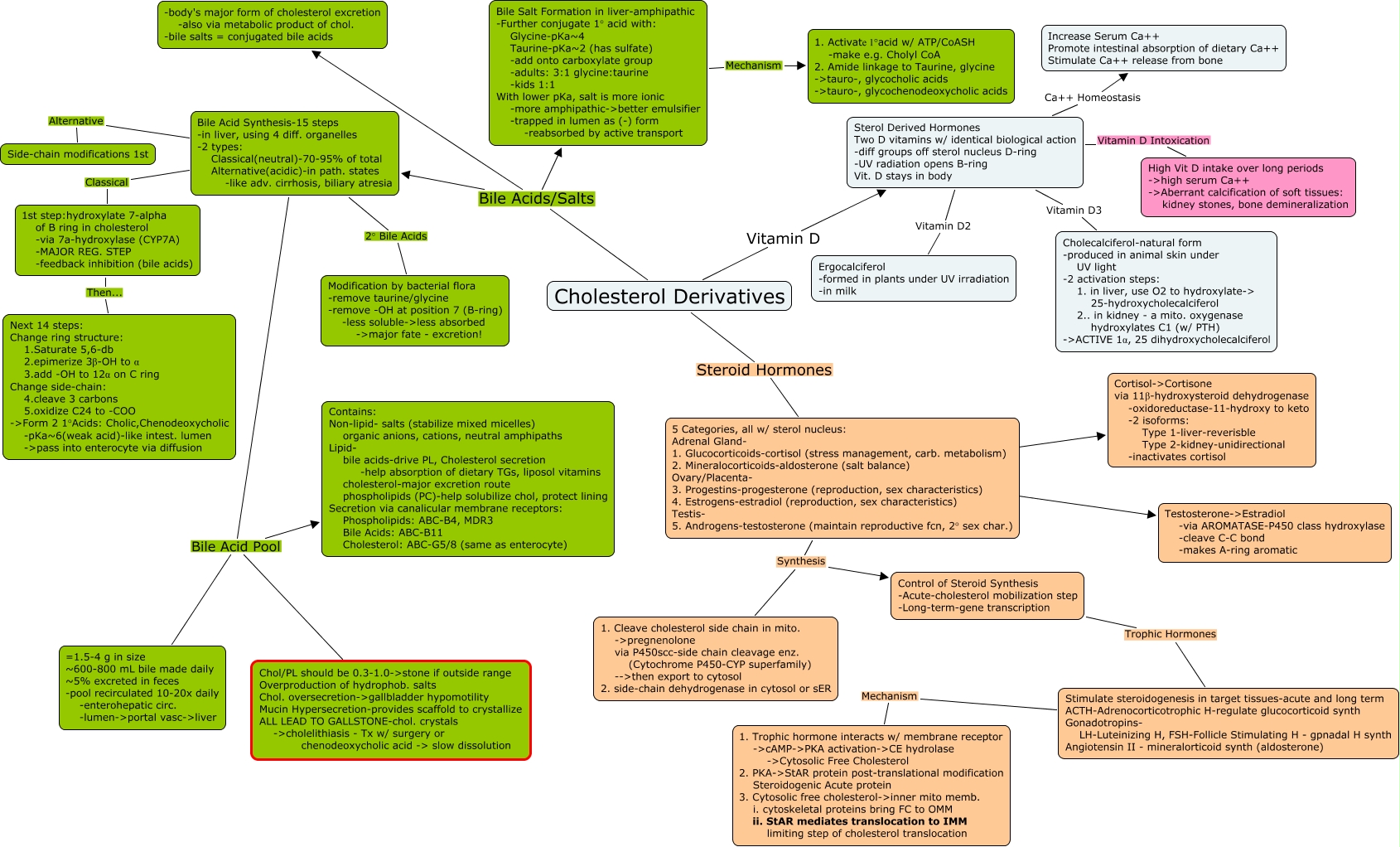 Cholesterol Derivatives, Bile Acid Synthesis-15 steps -in liver, using 4 diff. organelles -2 types: Classical(neutral)-70-95% of total Alternative(acidic)-in path. states -like adv. cirrhosis, biliary atresia Bile Acid Pool Chol/PL should be 0.3-1.0->stone if outside range Overproduction of hydrophob. salts Chol. oversecretion->gallbladder hypomotility Mucin Hypersecretion-provides scaffold to crystallize ALL LEAD TO GALLSTONE-chol. crystals ->cholelithiasis - Tx w/ surgery or chenodeoxycholic acid -> slow dissolution, Bile Acid Synthesis-15 steps -in liver, using 4 diff. organelles -2 types: Classical(neutral)-70-95% of total Alternative(acidic)-in path. states -like adv. cirrhosis, biliary atresia Bile Acid Pool Contains: Non-lipid- salts (stabilize mixed micelles) organic anions, cations, neutral amphipaths Lipid- bile acids-drive PL, Cholesterol secretion -help absorption of dietary TGs, liposol vitamins cholesterol-major excretion route phospholipids (PC)-help solubilize chol, protect lining Secretion via canalicular membrane receptors: Phospholipids: ABC-B4, MDR3 Bile Acids: ABC-B11 Cholesterol: ABC-G5/8 (same as enterocyte), 5 Categories, all w/ sterol nucleus: Adrenal Gland- 1. Glucocorticoids-cortisol (stress management, carb. metabolism) 2. Mineralocorticoids-aldosterone (salt balance) Ovary/Placenta- 3. Progestins-progesterone (reproduction, sex characteristics) 4. Estrogens-estradiol (reproduction, sex characteristics) Testis- 5. Androgens-testosterone (maintain reproductive fcn, 2° sex char.) Synthesis Control of Steroid Synthesis -Acute-cholesterol mobilization step -Long-term-gene transcription, Cholesterol Derivatives Steroid Hormones 5 Categories, all w/ sterol nucleus: Adrenal Gland- 1. Glucocorticoids-cortisol (stress management, carb. metabolism) 2. Mineralocorticoids-aldosterone (salt balance) Ovary/Placenta- 3. Progestins-progesterone (reproduction, sex characteristics) 4. Estrogens-estradiol (reproduction, sex characteristics) Testis- 5. Androgens-testosterone (maintain reproductive fcn, 2° sex char.), Cholesterol Derivatives Bile Acids/Salts Bile Acid Synthesis-15 steps -in liver, using 4 diff. organelles -2 types: Classical(neutral)-70-95% of total Alternative(acidic)-in path. states -like adv. cirrhosis, biliary atresia, Cholesterol Derivatives Vitamin D Sterol Derived Hormones Two D vitamins w/ identical biological action -diff groups off sterol nucleus D-ring -UV radiation opens B-ring Vit. D stays in body, Sterol Derived Hormones Two D vitamins w/ identical biological action -diff groups off sterol nucleus D-ring -UV radiation opens B-ring Vit. D stays in body Vitamin D Intoxication High Vit D intake over long periods ->high serum Ca++ ->Aberrant calcification of soft tissues: kidney stones, bone demineralization, Bile Acid Synthesis-15 steps -in liver, using 4 diff. organelles -2 types: Classical(neutral)-70-95% of total Alternative(acidic)-in path. states -like adv. cirrhosis, biliary atresia Classical 1st step:hydroxylate 7-alpha of B ring in cholesterol -via 7a-hydroxylase (CYP7A) -MAJOR REG. STEP -feedback inhibition (bile acids), Sterol Derived Hormones Two D vitamins w/ identical biological action -diff groups off sterol nucleus D-ring -UV radiation opens B-ring Vit. D stays in body Vitamin D2 Ergocalciferol -formed in plants under UV irradiation -in milk, Bile Salt Formation in liver-amphipathic -Further conjugate 1° acid with: Glycine-pKa~4 Taurine-pKa~2 (has sulfate) -add onto carboxylate group -adults: 3:1 glycine:taurine -kids 1:1 With lower pKa, salt is more ionic -more amphipathic->better emulsifier -trapped in lumen as (-) form -reabsorbed by active transport Mechanism 1. Activate 1°acid w/ ATP/CoASH -make e.g. Cholyl CoA 2. Amide linkage to Taurine, glycine ->tauro-, glycocholic acids ->tauro-, glycochenodeoxycholic acids