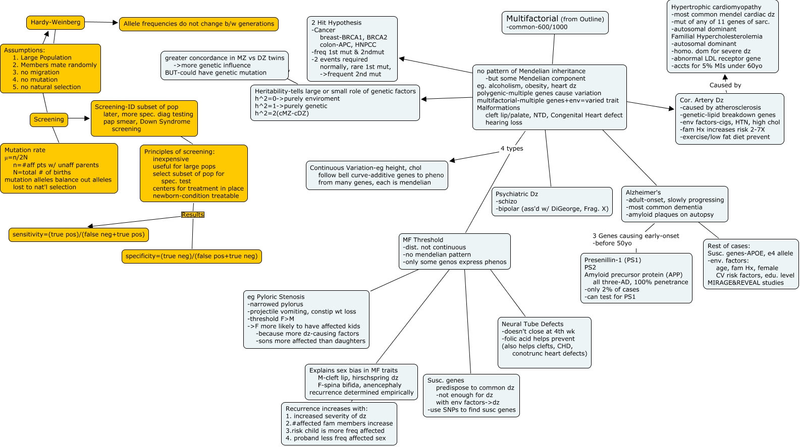 Genetics, MF Threshold -dist. not continuous -no mendelian pattern -only some genos express phenos ???? Explains sex bias in MF traits M-cleft lip, hirschspring dz F-spina bifida, anencephaly recurrence determined empirically, no pattern of Mendelian inheritance -but some Mendelian component eg. alcoholism, obesity, heart dz polygenic-multiple genes cause variation multifactorial-multiple genes+env=varied trait Malformations cleft lip/palate, NTD, Congenital Heart defect hearing loss 4 types Continuous Variation-eg height, chol follow bell curve-additive genes to pheno from many genes, each is mendelian, MF Threshold -dist. not continuous -no mendelian pattern -only some genos express phenos ???? Susc. genes predispose to common dz -not enough for dz with env factors->dz -use SNPs to find susc genes, no pattern of Mendelian inheritance -but some Mendelian component eg. alcoholism, obesity, heart dz polygenic-multiple genes cause variation multifactorial-multiple genes+env=varied trait Malformations cleft lip/palate, NTD, Congenital Heart defect hearing loss ???? Alzheimer's -adult-onset, slowly progressing -most common dementia -amyloid plaques on autopsy, MF Threshold -dist. not continuous -no mendelian pattern -only some genos express phenos ???? eg Pyloric Stenosis -narrowed pylorus -projectile vomiting, constip wt loss -threshold F>M ->F more likely to have affected kids -because more dz-causing factors -sons more affected than daughters, no pattern of Mendelian inheritance -but some Mendelian component eg. alcoholism, obesity, heart dz polygenic-multiple genes cause variation multifactorial-multiple genes+env=varied trait Malformations cleft lip/palate, NTD, Congenital Heart defect hearing loss ???? 2 Hit Hypothesis -Cancer breast-BRCA1, BRCA2 colon-APC, HNPCC -freq 1st mut & 2ndmut -2 events required normally, rare 1st mut, ->frequent 2nd mut, MF Threshold -dist. not continuous -no mendelian pattern -only some genos express phenos ???? Neural Tube Defects -doesn't close at 4th wk -folic acid helps prevent (also helps clefts, CHD, conotrunc heart defects), no pattern of Mendelian inheritance -but some Mendelian component eg. alcoholism, obesity, heart dz polygenic-multiple genes cause variation multifactorial-multiple genes+env=varied trait Malformations cleft lip/palate, NTD, Congenital Heart defect hearing loss ???? Cor. Artery Dz -caused by atherosclerosis -genetic-lipid breakdown genes -env factors-cigs, HTN, high chol -fam Hx increases risk 2-7X -exercise/low fat diet prevent, Multifactorial (from Outline) -common-600/1000 ???? no pattern of Mendelian inheritance -but some Mendelian component eg. alcoholism, obesity, heart dz polygenic-multiple genes cause variation multifactorial-multiple genes+env=varied trait Malformations cleft lip/palate, NTD, Congenital Heart defect hearing loss, Principles of screening: inexpensive useful for large pops select subset of pop for spec. test centers for treatment in place newborn-condition treatable Results sensitivity=(true pos)/(false neg+true pos)