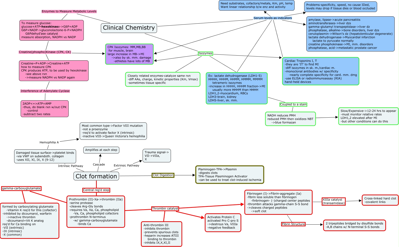 Clinical, Clots, Fibrinogen (I)->Fibrin-aggregate (Ia) -fibrin less soluble than fibrinogen -finbrinogen- (-)charged center peptides -thrombin attacks gamma-chain S-S bond ->cleaves charged peptides ->soft clot XIIIa catalyst (transamidase) Cross-linked hard clot -covalent links, Fibrinogen (I)->Fibrin-aggregate (Ia) -fibrin less soluble than fibrinogen -finbrinogen- (-)charged center peptides -thrombin attacks gamma-chain S-S bond ->cleaves charged peptides ->soft clot Fibrin Structure 2 tripeptides bridged by disulfide bonds -A,B chains w/ N-terminal S-S bonds, Clinical Chemistry Isozymes Ex: lactate dehydrogenase (LDH1-5) HHHH, HHHM, HHMM, HMMM, MMMM tetrameric isozymes -increase in HHHH, HHHM fraction->MI usually more HHHM than HHHH LDH1,2-myocardium, RBCs LDH3-brain, kidney LDH5-liver, sk. mm., Clinical Chemistry Serum levels as indicators Problems-specificity, speed, no cause IDed, levels may drop if tissue dies or blood occluded, Clinical Chemistry Isozymes CPK Isozymes: MM,MB,BB for muscle, brain large increase in MB->MI ->also by sk. mm. damage -athletes have lots of MB, Clot formation Intrinsic Pathway Damaged tissue surface->platelet binds -via VWF on subendoth. collagen -uses XII, XI, IX, X (9-12), Ex: lactate dehydrogenase (LDH1-5) HHHH, HHHM, HHMM, HMMM, MMMM tetrameric isozymes -increase in HHHH, HHHM fraction->MI usually more HHHM than HHHH LDH1,2-myocardium, RBCs LDH3-brain, kidney LDH5-liver, sk. mm. Coupled to a stain NADH reduces PMH reduced PMH then oxidizes NBT ->blue formazan, Prothrombin (II)-Xa->thrombin (IIa) -serine protease -cleaves Arg-Gly bonds -requires Va, Xa, Ca, phospholipid -Va, Ca, phospholipid cofactors -prothrombin N-terminus -w/ gamma-carboxyglutamate -binds Ca Thrombin catalyst Anti-thrombin III -inhibits thrombin -prevents spurious clots -heparin increases ATIII binding to thrombin -inhibits IX,X,XI,II, Clinical Chemistry Serum levels as indicators Cardiac Troponins I, T -they are 'IT' to find MI -diff isozymes in sk. m./cardiac m. -monoclonal antibodies w/ specificity -nearly complete specificity for card. mm. dmg -use ELISA or radioimmunoassay (RIA) hand-held devices, Clot formation Extrinsic Pathway Trauma signal-> VII->VIIa, X