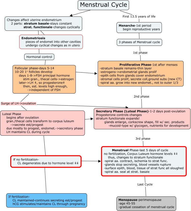 Menstrual Cycle, Secretory Phase (Luteal Phase)-1-2 days post-ovulation Progesterone controls changes stratum functionale expands! glands enlarge, corkscrew shape, fill w/ sec. products -mucoid-type w/ glycogen, nutrients for development 3rd phase Menstrual Phase-last 5 days of cycle no fertilization, Corpus Luteum hormone levels ⇓⇓ thus, changes to stratum functionale -spiral aa. contract, ischemia to strat func. -glands stop secreting, blood vessels rupture -surface epith, blood, tissue of strat func all sloughed -spiral aa. seal at strat. basale, Proliferative Phase-1st after menses -stratum basale remains-thin layer -estrogens->endometrial glands prolif -epith cells from glands cover endometrium -stromal cells prolif, secrete coll,ground subs (new CT) -spiral aa. grow into new endomet., not to outer 1/3 2nd phase Secretory Phase (Luteal Phase)-1-2 days post-ovulation Progesterone controls changes stratum functionale expands! glands enlarge, corkscrew shape, fill w/ sec. products -mucoid-type w/ glycogen, nutrients for development, Menstrual Phase-last 5 days of cycle no fertilization, Corpus Luteum hormone levels ⇓⇓ thus, changes to stratum functionale -spiral aa. contract, ischemia to strat func. -glands stop secreting, blood vessels rupture -surface epith, blood, tissue of strat func all sloughed -spiral aa. seal at strat. basale Last Cycle Menopause-perimenopause -age 45-55 -gradual cessation of menstrual cycle, Follicular phase-days 5-14 10-20 1° follicles develop days 1-8->FSH principal hormone stim gran., thecal cells->estrogen later->LH ⇑, so progesterone⇑ then, est. levels high enough, ->independent of FSH Surge of LH->ovulation Secretory Phase (Luteal Phase)-1-2 days post-ovulation Progesterone controls changes stratum functionale expands! glands enlarge, corkscrew shape, fill w/ sec. products -mucoid-type w/ glycogen, nutrients for development, Changes affect uterine endometrium 2 parts: stratum basale-stays constant strat. functionale-changes cyclically ???? Hormonal control, Menarche-1st period begin reproductive years ???? 3 phases of Menstrual cycle, If no fertilization- CL degenerates due to hormone level ⇓⇓ ???? If fertilization- CL maintained-continues secreting est/progest hCG stimulates/maintains CL through pregnancy, Changes affect uterine endometrium 2 parts: stratum basale-stays constant strat. functionale-changes cyclically ???? Endometriosis pieces of endomet into other cavities undergo cyclical changes as in utero, Menstrual Cycle First 13.5 years of life Menarche-1st period begin reproductive years, Luteal Phase begins after ovulation gran./thecal cells transform to corpus luteum ->secrete est/progest due mostly to progest, endomet.->secretory phase LH maintains CL during cycle ???? If no fertilization- CL degenerates due to hormone level ⇓⇓
