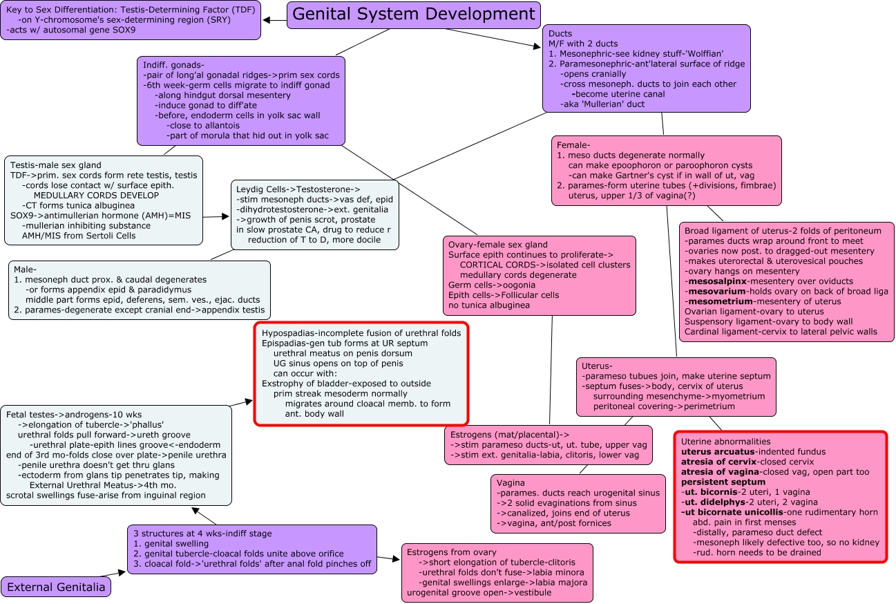 Genital System Development, Indiff. gonads- -pair of long'al gonadal ridges->prim sex cords -6th week-germ cells migrate to indiff gonad -along hindgut dorsal mesentery -induce gonad to diff'ate -before, endoderm cells in yolk sac wall -close to allantois -part of morula that hid out in yolk sac ???? Testis-male sex gland TDF->prim. sex cords form rete testis, testis -cords lose contact w/ surface epith. MEDULLARY CORDS DEVELOP -CT forms tunica albuginea SOX9->antimullerian hormone (AMH)=MIS -mullerian inhibiting substance AMH/MIS from Sertoli Cells, Ovary-female sex gland Surface epith continues to proliferate-> CORTICAL CORDS->isolated cell clusters medullary cords degenerate Germ cells->oogonia Epith cells->Follicular cells no tunica albuginea ???? Estrogens (mat/placental)-> ->stim parameso ducts-ut, ut. tube, upper vag ->stim ext. genitalia-labia, clitoris, lower vag, 3 structures at 4 wks-indiff stage 1. genital swelling 2. genital tubercle-cloacal folds unite above orifice 3. cloacal fold->'urethral folds' after anal fold pinches off ???? Estrogens from ovary ->short elongation of tubercle-clitoris -urethral folds don't fuse->labia minora -genital swellings enlarge->labia majora urogenital groove open->vestibule, Female- 1. meso ducts degenerate normally can make epoophoron or paroophoron cysts -can make Gartner's cyst if in wall of ut, vag 2. parames-form uterine tubes (+divisions, fimbrae) uterus, upper 1/3 of vagina(?) ???? Uterus- -parameso tubues join, make uterine septum -septum fuses->body, cervix of uterus surrounding mesenchyme->myometrium peritoneal covering->perimetrium, Female- 1. meso ducts degenerate normally can make epoophoron or paroophoron cysts -can make Gartner's cyst if in wall of ut, vag 2. parames-form uterine tubes (+divisions, fimbrae) uterus, upper 1/3 of vagina(?) ???? Broad ligament of uterus-2 folds of peritoneum -parames ducts wrap around front to meet -ovaries now post. to dragged-out mesentery -makes uterorectal & uterovesical pouches -ovary hangs on mesentery -mesosalpinx-mesentery over oviducts -mesovarium-holds ovary on back of broad liga -mesometrium-mesentery of uterus Ovarian ligament-ovary to uterus Suspensory ligament-ovary to body wall Cardinal ligament-cervix to lateral pelvic walls, 3 structures at 4 wks-indiff stage 1. genital swelling 2. genital tubercle-cloacal folds unite above orifice 3. cloacal fold->'urethral folds' after anal fold pinches off ???? Fetal testes->androgens-10 wks ->elongation of tubercle->'phallus' urethral folds pull forward->ureth groove -urethral plate-epith lines groove<-endoderm end of 3rd mo-folds close over plate->penile urethra -penile urethra doesn't get thru glans -ectoderm from glans tip penetrates tip, making External Urethral Meatus-ɰth mo. scrotal swellings fuse-arise from inguinal region, Genital System Development ???? Key to Sex Differentiation: Testis-Determining Factor (TDF) -on Y-chromosome's sex-determining region (SRY) -acts w/ autosomal gene SOX9, Fetal testes->androgens-10 wks ->elongation of tubercle->'phallus' urethral folds pull forward->ureth groove -urethral plate-epith lines groove<-endoderm end of 3rd mo-folds close over plate->penile urethra -penile urethra doesn't get thru glans -ectoderm from glans tip penetrates tip, making External Urethral Meatus-ɰth mo. scrotal swellings fuse-arise from inguinal region ???? Hypospadias-incomplete fusion of urethral folds Epispadias-gen tub forms at UR septum urethral meatus on penis dorsum UG sinus opens on top of penis can occur with: Exstrophy of bladder-exposed to outside prim streak mesoderm normally migrates around cloacal memb. to form ant. body wall, Uterus- -parameso tubues join, make uterine septum -septum fuses->body, cervix of uterus surrounding mesenchyme->myometrium peritoneal covering->perimetrium ???? Vagina -parames. ducts reach urogenital sinus -ɮ solid evaginations from sinus ->canalized, joins end of uterus ->vagina, ant/post fornices, Ducts M/F with 2 ducts 1. Mesonephric-see kidney stuff-'Wolffian' 2. Paramesonephric-ant'lateral surface of ridge -opens cranially -cross mesoneph. ducts to join each other -become uterine canal -aka 'Mullerian' duct ???? Female- 1. meso ducts degenerate normally can make epoophoron or paroophoron cysts -can make Gartner's cyst if in wall of ut, vag 2. parames-form uterine tubes (+divisions, fimbrae) uterus, upper 1/3 of vagina(?)
