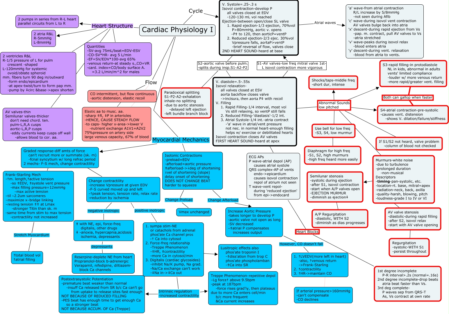 Cardiac Physiology I, V. Systole=.25-.3 s Isovol contraction-develop P all valves closed at EDV -120-130 mL vol reached Ejection-between open/close SL valve 1. Rapid ejection-1/3 ejection, 70%vol PᢈmmHg, aortic v. opens -P⇑ to 120, then aorticP=ventP 2. Reduced ejection-2/3 ejec. 30%vol Vpressure falls, aortaP>ventP -brief reversal of flow, valves close 2ND HEART SOUND-heard at base S2-aortic valve before pulm. -splits during insp.S1-A2-P2 V. diastole=.5-.55s Isovol relaxation- all valves closed at ESV aorta backflow closes valve ->incisura, then aorta P⇓ with recoil V. Filling 1. Rapid Filling-1/4 interval, most vol Vs still relaxing, so ventP still falls 2. Reduced Filling-'diastasis'-1/2 int. 3. Atrial Systole-1/4 int.-atria contract -'a' wave in atrial/vent pressure not nec. in normal heart-enough filling helps w/ exercise or debilitated hearts Isovol contraction closes AV valves FIRST HEART SOUND-heard at apex, Change contractility -increase Vpressure at given EDV -F-S curved moved up and left -↑peak tension, tension rate, relax rate -reduction by ischemia negative inotropic ⇑ with NE, epi, force-freq digitalis, other drugs ⇓ -anoxia, hypercapnia,acidosis ischemia, depressants, Murmurs-white noise -due to turbulence -prolonged duration -non-musical Descriptors -timing-pan-systolic, etc. -location-rt. base, mitral=apex -radiation-neck, back, axilla -quality-harsh, blowing, pitch -loudness-grade I to IV or VI ???? AV valve stenosis -diastolic-during rapid filling -after S2, isovol relax -start with AV valve opening, Frank-Starling Mech -↑m. length,↑active tension -so ⇑EDV, ⇑systole vent pressure -max filling pressure=12mmHg -max active tension -til ~2.2um sarcomeres -maximize x-bridge linking -resting tension ⇑⇑ at Lmax -stronger Titin than sk. m -same time from stim to max tension -contractility not increased Stretch Myocardium ↑total blood vol ↑atrial filling, 1. sympa stim-NE or catachols from adrenal phos'ate Ca channel pros -↑ Ca into cytosol 2. Force-freq relationship -Treppe Phenomenon -⇑HR, ⇑contractility -more Ca in cytosol/min 3. Digitalis (cardiac glycosides) -inhibit Na/K pump, Na grad. -Na/Ca exchange can't work -⇓Na in->⇓Ca out Intrinsic regulation -increased contractility Postextrasystolic Potentiation -premature beat weaker than normal -insuff Ca released from SR b/c Ca can't go from uptake to release sites fast enough NOT BECAUSE OF REDUCED FILLING -PES beat has enough time to get enough Ca so a stronger beat NOT BECAUSE ACCUM. OF Ca (Treppe), ECG APs P wave-atrial depol (AP) causes atrial systole QRS complex-AP of vents endo->epicardium causes isovol contraction repol of atrium not seen T wave-vent repol- during 'reduced ejection' from epi->endocard Heart Blocks 1st degree incomplete P-R interval>.2s (normal=.16s) 2nd degree incomplete-drop beats atria beat faster than Vs. 3rd deg complete- P waves sep from QRS-T As, Vs contract at own rate, Cardiac Physiology I Cycle V. Systole=.25-.3 s Isovol contraction-develop P all valves closed at EDV -120-130 mL vol reached Ejection-between open/close SL valve 1. Rapid ejection-1/3 ejection, 70%vol PᢈmmHg, aortic v. opens -P⇑ to 120, then aorticP=ventP 2. Reduced ejection-2/3 ejec. 30%vol Vpressure falls, aortaP>ventP -brief reversal of flow, valves close 2ND HEART SOUND-heard at base, AV valve stenosis -diastolic-during rapid filling -after S2, isovol relax -start with AV valve opening ???? Regurgitation -systolic-WITH S1 -persist throughout, Use bell for low freq -S3, S4, low murmur ???? Diaphragm for high freq -S1, S2, high murmurs -high freq heard more easily, Cardiac Physiology I Flow Elastic aa to musc. aa. -sharp ⇑R, ⇓P in arterioles -HENCE, CAUSE STEADY FLOW -to caps- higher x-area->lower V -nutrient exchange A1V1=A2V2 75%pressure on artery side large venous capacity, 67% of blood