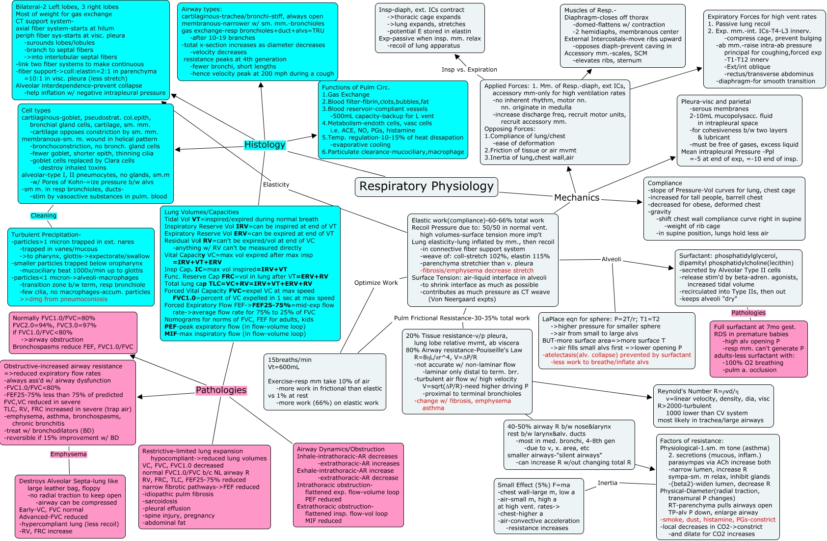 asthma </mtext> </mrow> </math> ???? Reynold's Number R=ρvd/η v=linear velocity, density, dia, visc R-turbulent 1000 lower than CV system most likely in trachea/large airways, Respiratory Physiology Mechanics Applied Forces: 1. Mm. of Resp.-diaph, ext ICs, accessory mm-only for high ventilation rates -no inherent rhythm, motor nn. nn. originate in medulla -increase discharge freq, recruit motor units, recruit accessory mm. Opposing Forces: 1.Compliance of lung/chest -ease of deformation 2.Friction of tissue or air mvmt 3.Inertia of lung,chest wall,air, Factors of resistance: Physiological-1.sm. m tone (asthma) 2. secretions (mucous, inflam.) parasympas via ACh increase both -narrow lumen, increase R sympa-sm. m relax, inhibit glands -(beta2)-widen lumen, decrease R Physical-Diameter(radial traction, transmural P changes) RT-parenchyma pulls airways open TP-alv P down, enlarge airway -smoke, dust, histamine, PGs-constrict -local decreases in CO2->constrict -and dilate for CO2 increases Inertia Small Effect (5%) F=ma -chest wall-large m, low a -air-small m, high a at high vent. rates-> -chest-higher a -air-convective acceleration -resistance increases, Elastic work(compliance)-60-66% total work Recoil Pressure due to: 50/50 in normal vent. high volumes-surface tension more imp't Lung elasticity-lung inflated by mm., then recoil -in connective fiber support system -weave of: coll-stretch 102%, elastin 115% -parenchyma stretchier than v. pleura -fibrosis/emphysema decrease stretch Surface Tension: air-liquid interface in alveoli -to shrink interface as much as possible -contributes as much pressure as CT weave (Von Neergaard expts) Optimize Work 15breaths/min Vt=600mL Exercise-resp mm take 10% of air -more work in frictional than elastic vs 1% at rest -more work (66%) on elastic work, Obstructive-increased airway resistance =>reduced expiratory flow rates -always ass'd w/ airway dysfunction -FVC1.0/FVCៀ% -FEF25-75% less than 75% of predicted FVC,VC reduced in severe TLC, RV, FRC increased in severe (trap air) -emphysema, asthma, bronchospasms, chronic bronchitis -treat w/ bronchodilators (BD) -reversible if 15% improvement w/ BD Emphysema Destroys Alveolar Septa-lung like large leather bag, floppy -no radial traction to keep open -airway can be compressed Early-VC, FVC normal Advanced-FVC reduced -hypercompliant lung (less recoil) -RV, FRC increase, Applied Forces: 1. Mm. of Resp.-diaph, ext ICs, accessory mm-only for high ventilation rates -no inherent rhythm, motor nn. nn. originate in medulla -increase discharge freq, recruit motor units, recruit accessory mm. Opposing Forces: 1.Compliance of lung/chest -ease of deformation 2.Friction of tissue or air mvmt 3.Inertia of lung,chest wall,air Insp vs. Expiration Insp-diaph, ext. ICs contract ->thoracic cage expands ->lung expands, stretches -potential E stored in elastin Exp-passive when insp. mm. relax -recoil of lung apparatus, 40-50% airway R b/w nose&larynx rest b/w larynx&alv. ducts -most in med. bronchi, 4-8th gen -due to v, x. area, etc smaller airways-"silent airways" -can increase R w/out changing total R ???? Factors of resistance: Physiological-1.sm. m tone (asthma) 2. secretions (mucous, inflam.) parasympas via ACh increase both -narrow lumen, increase R sympa-sm. m relax, inhibit glands -(beta2)-widen lumen, decrease R Physical-Diameter(radial traction, transmural P changes) RT-parenchyma pulls airways open TP-alv P down, enlarge airway -smoke, dust, histamine, PGs-constrict -local decreases in CO2->constrict -and dilate for CO2 increases