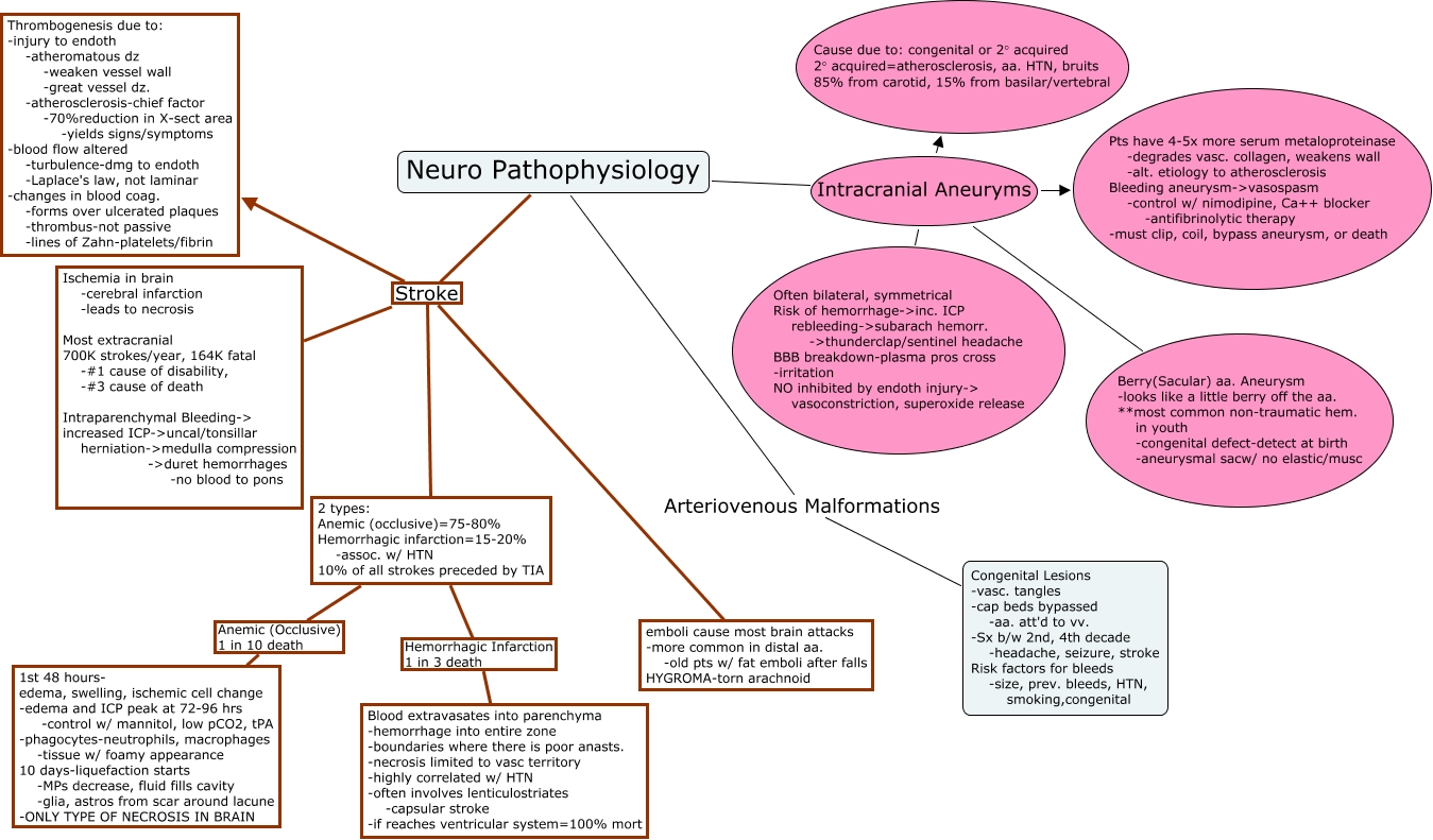 Neuro Pathophysiology, 2 types: Anemic (occlusive)=75-80% Hemorrhagic infarction=15-20% -assoc. w/ HTN 10% of all strokes preceded by TIA Anemic (Occlusive) 1 in 10 death 1st 48 hours- edema, swelling, ischemic cell change -edema and ICP peak at 72-96 hrs -control w/ mannitol, low pCO2, tPA -phagocytes-neutrophils, macrophages -tissue w/ foamy appearance 10 days-liquefaction starts -MPs decrease, fluid fills cavity -glia, astros from scar around lacune -ONLY TYPE OF NECROSIS IN BRAIN, 2 types: Anemic (occlusive)=75-80% Hemorrhagic infarction=15-20% -assoc. w/ HTN 10% of all strokes preceded by TIA Hemorrhagic Infarction 1 in 3 death Blood extravasates into parenchyma -hemorrhage into entire zone -boundaries where there is poor anasts. -necrosis limited to vasc territory -highly correlated w/ HTN -often involves lenticulostriates -capsular stroke -if reaches ventricular system=100% mort, Neuro Pathophysiology Intracranial Aneuryms Cause due to: congenital or 2° acquired 2° acquired=atherosclerosis, aa. HTN, bruits 85% from carotid, 15% from basilar/vertebral, Neuro Pathophysiology Arteriovenous Malformations Congenital Lesions -vasc. tangles -cap beds bypassed -aa. att'd to vv. -Sx b/w 2nd, 4th decade -headache, seizure, stroke Risk factors for bleeds -size, prev. bleeds, HTN, smoking,congenital, Neuro Pathophysiology Stroke 2 types: Anemic (occlusive)=75-80% Hemorrhagic infarction=15-20% -assoc. w/ HTN 10% of all strokes preceded by TIA, Neuro Pathophysiology Intracranial Aneuryms Often bilateral, symmetrical Risk of hemorrhage->inc. ICP rebleeding->subarach hemorr. ->thunderclap/sentinel headache BBB breakdown-plasma pros cross -irritation NO inhibited by endoth injury-> vasoconstriction, superoxide release, Neuro Pathophysiology Stroke Thrombogenesis due to: -injury to endoth -atheromatous dz -weaken vessel wall -great vessel dz. -atherosclerosis-chief factor -70%reduction in X-sect area -yields signs/symptoms -blood flow altered -turbulence-dmg to endoth -Laplace's law, not laminar -changes in blood coag. -forms over ulcerated plaques -thrombus-not passive -lines of Zahn-platelets/fibrin, Neuro Pathophysiology Intracranial Aneuryms Pts have 4-5x more serum metaloproteinase -degrades vasc. collagen, weakens wall -alt. etiology to atherosclerosis Bleeding aneurysm->vasospasm -control w/ nimodipine, Ca++ blocker -antifibrinolytic therapy -must clip, coil, bypass aneurysm, or death, Neuro Pathophysiology Stroke Ischemia in brain -cerebral infarction -leads to necrosis Most extracranial 700K strokes/year, 164K fatal -#1 cause of disability, -#3 cause of death Intraparenchymal Bleeding-> increased ICP->uncal/tonsillar herniation->medulla compression ->duret hemorrhages -no blood to pons, Neuro Pathophysiology Stroke emboli cause most brain attacks -more common in distal aa. -old pts w/ fat emboli after falls HYGROMA-torn arachnoid