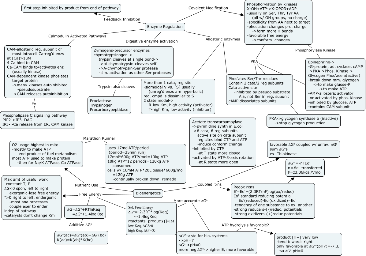 Enzymes 3, Bioenergetics Free Energy Std. Free Energy ΔG°=-2.3RT*log(Keq) ~-1.4logKeq reactants, products []=1M low Keq, ΔG°ɬ high Keq, ΔG°ɘ, Enzyme Regulation Covalent Modification Phosphorylation by kinases X-OH+ATP->X-OPO3+ADP -usually on Ser, Thr, Tyr AA (all w/ OH groups, no charge) -specificity from AA next to target -phos'ation changes pro. charge ->form more H bonds -favorable free energy ->conform. changes, Enzyme Regulation Allosteric enzymes Phos'ates Ser/Thr residues Contain 2 cata/2 reg subunits Cata active site -inhibited by pseudo substrate Ala, not Ser in reg. subunit cAMP dissociates subunits, Phosphorylation by kinases X-OH+ATP->X-OPO3+ADP -usually on Ser, Thr, Tyr AA (all w/ OH groups, no charge) -specificity from AA next to target -phos'ation changes pro. charge ->form more H bonds -favorable free energy ->conform. changes PKA Epinephrine-> -G-protein, ad. cyclase, cAMP ->PKA->Phos. Kinase-> Glycogen Phos'ase a(active) -break down mm. glycogen ->to make gluose-P ->to make ATP -AMP-allosteric activator -or activated by phos. kinase -inhibited by glucose, ATP -contains CAM subunit, O2 usage highest in mito. -mostly to make ATP -end product of fuel metabolism most ATP used to make protein -then for Na/K ATPase, Ca ATPase Marathon Runner uses 17molATP/period (period=25min run) 17mol*600g ATP/mol=10kg ATP 10kg ATP*12 periods=120kg ATP consumed cells w/ 10mM ATP*20L tissue*600g/mol =120g ATP -continually broken down, remade, Redox rxns E'=Eo'+(2.3RT/nF)log(ox/reduc) Eo'-standard reducing potential Eo'(reduced)-Eo'(oxidized)=Eo' -tendency of one substance to ox. another -strong reducers-(-)reduc. potentials -strong oxidizers-(+)reduc potentials ΔG°'=-nFEo' n=#e- transferred F=23.06kcal/Vmol, Phosphorylation by kinases X-OH+ATP->X-OPO3+ADP -usually on Ser, Thr, Tyr AA (all w/ OH groups, no charge) -specificity from AA next to target -phos'ation changes pro. charge ->form more H bonds -favorable free energy ->conform. changes PKA Phos'ates Ser/Thr residues Contain 2 cata/2 reg subunits Cata active site -inhibited by pseudo substrate Ala, not Ser in reg. subunit cAMP dissociates subunits, Std. Free Energy ΔG°=-2.3RT*log(Keq) ~-1.4logKeq reactants, products []=1M low Keq, ΔG°ɬ high Keq, ΔG°ɘ More accurate ΔG° ΔG°'->std for bio. systems ->pH=7 ΔG°->pH=0 more neg ΔG°->higher E, more favorable, Bioenergetics Coupled rxns favorable ΔG° coupled w/ unfav. ΔG° sum ΔG°s ex. Thiokinase, Enzyme Regulation Allosteric enzymes More than 1 cata, reg site -sigmoidal V vs. [S] usually (unreg'd enzs are hyperbolic) reg. cmpd is dissimilar to S 2 state model-> R-low Km, high activity (activator) T-high Km, low activity (inhibitor)