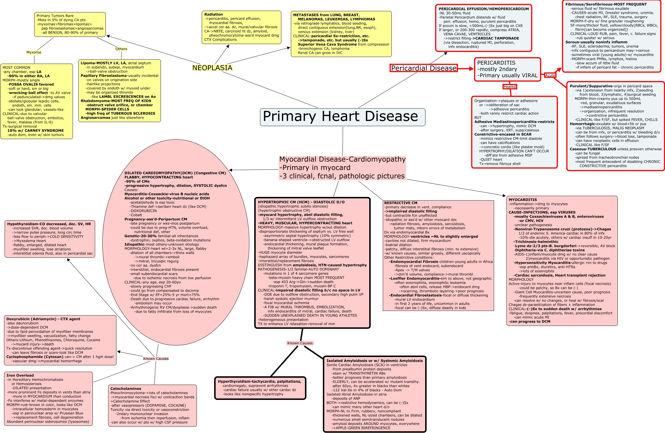 Primary Heart Disease, PERICARDITIS -mostly 2ndary -Primary usually VIRAL Healed Organization->plaques or adhesions or ->obliteration of sac ->adhesive pericarditis -both rarely restrict cardiac action BUT Adhesive Mediastinopericarditis-restricts -can ->hypertrophy, mimic DCM -after surgery, XRT, supp/caseous Constrictive-encased in SCAR -mimics restrictive CM-limit diastole -can have calcifications ->concretio cordis (like plaster mold) HYPERTROPHY/DILATION CAN'T OCCUR -diff'ate from adhesive MSP -QUIET heart Tx-remove fibrous shell, Primary Heart Disease NEOPLASIA Primary Tumors Rare -Mets in 5% of dying CA pts -myxomas>fibromas>lipomas> pap fibroelastomas>angiosarcomas -all BENIGN, 80-90% of primary, HYPERTROPHIC CM (HCM) - DIASTOLIC D/O (idiopathic hypertrophic subAo stenosis) (hypertrophic obstructive CM) -myocard hypertrophy, abnl diastolic filling, 1/3 w/ intermittent LV outflow obstruction -HEAVY, MUSCULAR, HYPERCONTRACTING heart MORPHOLOGY-massive hypertrophy w/out dilation -disproportionate thickening of septum vs. LV free wall -asymmetric septal hypertrophy (10% symmetric) -banana-shaped ventricle->obstructed LV outflow -endocardial thickening, mural plaque formation, thickening of mitral valve leaflet -HUGE myocyte diameter -haphazard array of bundles, myocytes, sarcomeres -interstitial/replacement fibrosis DISTINGUISH from amyloidosis, HTN-caused hypertrophy PATHOGENESIS-1/2 familial-AUTO DOMINANT -mutations in 1 of 4 sarcomere genes -beta-myosin heavy chain MOST FREQUENT -esp 403 Arg->Gln->sudden death -troponin T, tropomyosin, myosin-BP C CLINICAL-impaired diastolic filling b/c no space in LV -DOE due to outflow obstruction, secondary high pulm VP -harsh systolic ejection murmur -focal myocardial ischemia -A FIB w/ MURAL THROMBUS, EMBOLIZATION, infx endocarditis of mitral, cardiac failure, death -SUDDEN UNEXPLAINED DEATH IN YOUNG ATHLETES -heterogeneous presentation TX to enhance LV relaxation-removal of mm Known Causes Hyperthyroidism-tachycardia, palpitations, cardiomegaly, supravent arrhythmias -cardiac failure usually w/ other cardac dz -looks like nonspecific hypertrophy, Primary Tumors Rare -Mets in 5% of dying CA pts -myxomas>fibromas>lipomas> pap fibroelastomas>angiosarcomas -all BENIGN, 80-90% of primary Others Lipoma-MOSTLY LV, LA, atrial septum -in subendo, subepi, myocardium ->ball-valve obstruction Papillary Fibroelastoma-usually incidental -on valves on origination side -hairlike projections -covered by endoth w/ myxoid under -may be organized thrombi -like LAMBL EXCRESCENCES on Ao Rhabdomyoma-MOST FREQ OF KIDS -obstruct valve orifice, or chamber MORPH-SPIDER CELLS -high freq of TUBEROUS SCLEROSIS Angiosarcomas just like elsewhere, DILATED CARDIOMYOPATHY(DCM) (Congestive CM) FLABBY, HYPOCONTRACTING heart -90% of CMs -progressive hypertrophy, dilation, SYSTOLIC dysfcn Causes: Myocarditis-Coxsackie-virus B nucleic acids Alcohol or other toxicity-nutritional or EtOH -acetaldehyde is esp toxic -Thiamine def->beriberi heart dz (like DCM) -DOXORUBICIN -Cobalt Pregnancy-ass'd-Peripartum CM -late pregnancy or wks-mos postpartum -could be due to preg-HTN, volume overload, nutritional def, other Genetic-20-30% familial-all inheritances -dystrophin, oxphos, beta-oxidation mutations Idiopathic-most others-unknown etiology MORPHOLOGY-heart wt=2-3x NL, large, flabby -dilation of all chambers->thins walls ->mural thrombi->emboli ->mitral, tricuspic regurg -no cor aa. dysfcn -interstitial, endocardial fibrosis present -small subendocardial scars -due to ischemic necrosis from low perfusion CLINICAL-any age, esp 20-60yo -slowly progressing CHF -could go from compensated to decomp -End Stage w/ EF=25%-5 yr mort=75% -Death due to progressive cardiac failure, arrhythm -embolism may occur -Arrhythmogenic RV CM/dysplasia->sudden death -due to fatty infiltrate from loss of myocytes Known Causes Doxyrubicin (Adriamycin) - CTX agent -also daunorubicin ->dose-dependent DCM -due to lipid peroxidation of myofiber membranes ->myofiber swelling, vacuolization, fatty change Others:Lithium, Phenothiazines, Chloroquine, Cocaine ->mycard injury->death Tx-discontinue offending agent->quick resolution -can leave fibrosis or scars-look like DCM Cyclophosphamide (Cytoxan) can-> CM after 1 hgih dose! -vascular dmg->myocardial hemorrhage, PERICARDITIS -mostly 2ndary -Primary usually VIRAL Acute Fibrinous/Serofibrinous-MOST FREQUENT -serous fluid w/ fibrinous exudate -CAUSES-acute MI, Dressler syndrome, uremia, chest radiation, RF, SLE, trauma, surgery MORPH-F-dry w/ fine granular roughening SF-more/thicker fluid, yellow/cloudy(RBCs, WBCs, fibrin[can become organized]) CLINICAL-LOUD RUB, pain, fever, c. failure signs -rub quieter w/ serous Serous-usually noninfx inflamm -RF, SLE, scleroderma, tumors, uremia -infx contiguous to pericardium may->serous -sometimes viral (young adults)-w/ myocarditis -MORPH-scant PMNs, lymphos, histios -slow accum of little fluid -if inflam of pericard fat - chronic pericarditis, Primary Heart Disease NEOPLASIA Radiation ->pericarditis, pericard effusion, myocardial fibrosis, ->accel cor aa. dz, mural/valvular fibrosis CA->NBTE, carcinoid ht dz, amyloid, pheochromocytoma-ass'd myocard dmg CTX Complications, Primary Heart Disease Myocardial Disease-Cardiomyopathy -Primary in myocard -3 clinical, fcnal, pathologic pictures DILATED CARDIOMYOPATHY(DCM) (Congestive CM) FLABBY, HYPOCONTRACTING heart -90% of CMs -progressive hypertrophy, dilation, SYSTOLIC dysfcn Causes: Myocarditis-Coxsackie-virus B nucleic acids Alcohol or other toxicity-nutritional or EtOH -acetaldehyde is esp toxic -Thiamine def->beriberi heart dz (like DCM) -DOXORUBICIN -Cobalt Pregnancy-ass'd-Peripartum CM -late pregnancy or wks-mos postpartum -could be due to preg-HTN, volume overload, nutritional def, other Genetic-20-30% familial-all inheritances -dystrophin, oxphos, beta-oxidation mutations Idiopathic-most others-unknown etiology MORPHOLOGY-heart wt=2-3x NL, large, flabby -dilation of all chambers->