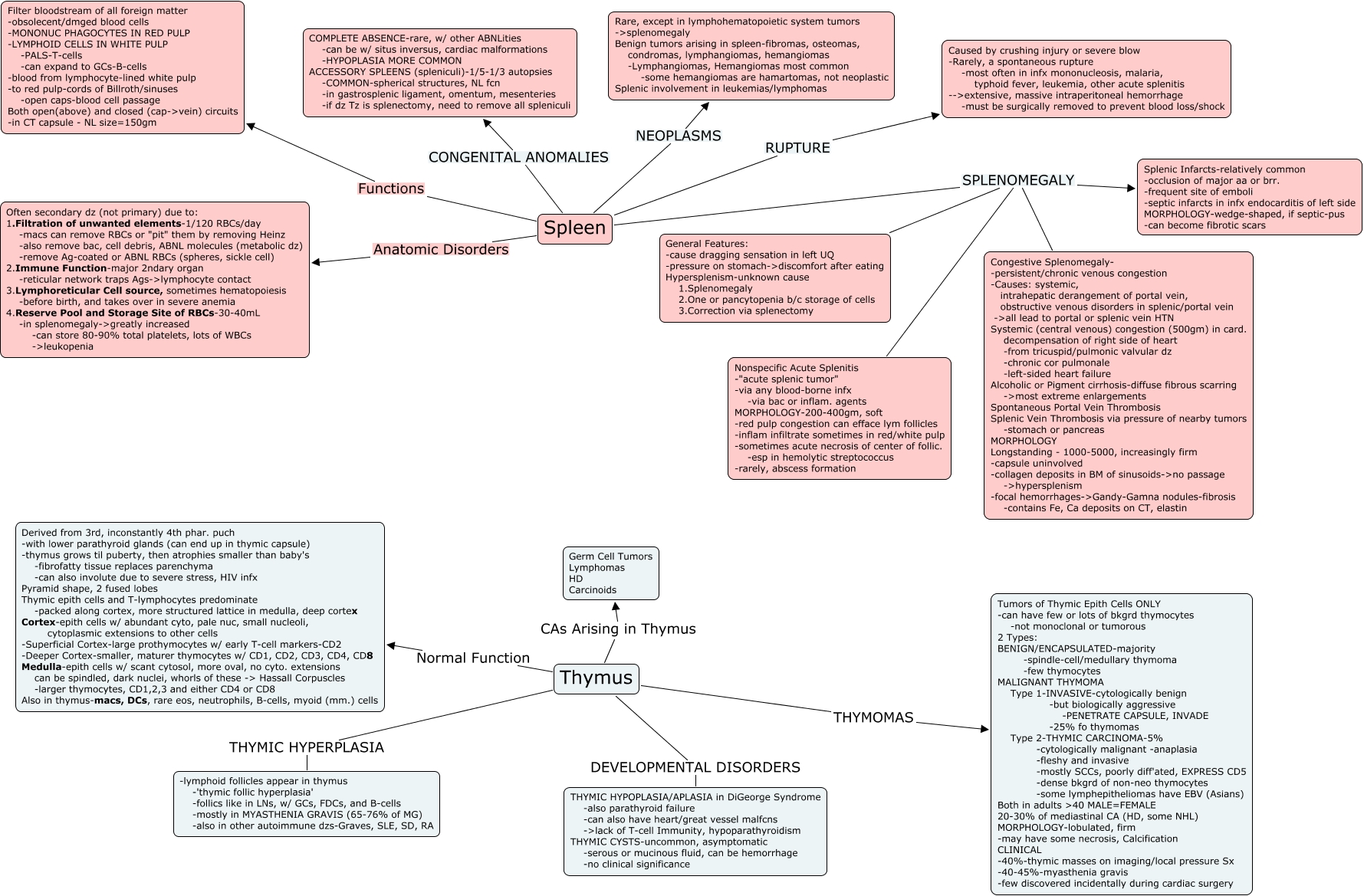 Spleen, Thymus, Thymus DEVELOPMENTAL DISORDERS THYMIC HYPOPLASIA/APLASIA in DiGeorge Syndrome -also parathyroid failure -can also have heart/great vessel malfcns ->lack of T-cell Immunity, hypoparathyroidism THYMIC CYSTS-uncommon, asymptomatic -serous or mucinous fluid, can be hemorrhage -no clinical significance, Spleen SPLENOMEGALY Congestive Splenomegaly- -persistent/chronic venous congestion -Causes: systemic, intrahepatic derangement of portal vein, obstructive venous disorders in splenic/portal vein ->all lead to portal or splenic vein HTN Systemic (central venous) congestion (500gm) in card. decompensation of right side of heart -from tricuspid/pulmonic valvular dz -chronic cor pulmonale -left-sided heart failure Alcoholic or Pigment cirrhosis-diffuse fibrous scarring ->most extreme enlargements Spontaneous Portal Vein Thrombosis Splenic Vein Thrombosis via pressure of nearby tumors -stomach or pancreas MORPHOLOGY Longstanding - 1000-5000, increasingly firm -capsule uninvolved -collagen deposits in BM of sinusoids->no passage ->hypersplenism -focal hemorrhages->Gandy-Gamna nodules-fibrosis -contains Fe, Ca deposits on CT, elastin, Thymus CAs Arising in Thymus Germ Cell Tumors Lymphomas HD Carcinoids, Thymus Normal Function Derived from 3rd, inconstantly 4th phar. puch -with lower parathyroid glands (can end up in thymic capsule) -thymus grows til puberty, then atrophies smaller than baby's -fibrofatty tissue replaces parenchyma -can also involute due to severe stress, HIV infx Pyramid shape, 2 fused lobes Thymic epith cells and T-lymphocytes predominate -packed along cortex, more structured lattice in medulla, deep cortex Cortex-epith cells w/ abundant cyto, pale nuc, small nucleoli, cytoplasmic extensions to other cells -Superficial Cortex-large prothymocytes w/ early T-cell markers-CD2 -Deeper Cortex-smaller, maturer thymocytes w/ CD1, CD2, CD3, CD4, CD8 Medulla-epith cells w/ scant cytosol, more oval, no cyto. extensions can be spindled, dark nuclei, whorls of these -> Hassall Corpuscles -larger thymocytes, CD1,2,3 and either CD4 or CD8 Also in thymus-macs, DCs, rare eos, neutrophils, B-cells, myoid (mm.) cells, Spleen RUPTURE Caused by crushing injury or severe blow -Rarely, a spontaneous rupture -most often in infx mononucleosis, malaria, typhoid fever, leukemia, other acute splenitis -->extensive, massive intraperitoneal hemorrhage -must be surgically removed to prevent blood loss/shock, Spleen SPLENOMEGALY General Features: -cause dragging sensation in left UQ -pressure on stomach->discomfort after eating Hypersplenism-unknown cause 1.Splenomegaly 2.One or pancytopenia b/c storage of cells 3.Correction via splenectomy, Spleen Anatomic Disorders Often secondary dz (not primary) due to: 1.Filtration of unwanted elements-1/120 RBCs/day -macs can remove RBCs or "pit" them by removing Heinz -also remove bac, cell debris, ABNL molecules (metabolic dz) -remove Ag-coated or ABNL RBCs (spheres, sickle cell) 2.Immune Function-major 2ndary organ -reticular network traps Ags->lymphocyte contact 3.Lymphoreticular Cell source, sometimes hematopoiesis -before birth, and takes over in severe anemia 4.Reserve Pool and Storage Site of RBCs-30-40mL -in splenomegaly->greatly increased -can store 80-90% total platelets, lots of WBCs ->leukopenia, Thymus THYMIC HYPERPLASIA -lymphoid follicles appear in thymus -'thymic follic hyperplasia' -follics like in LNs, w/ GCs, FDCs, and B-cells -mostly in MYASTHENIA GRAVIS (65-76% of MG) -also in other autoimmune dzs-Graves, SLE, SD, RA, Spleen SPLENOMEGALY Nonspecific Acute Splenitis -"acute splenic tumor" -via any blood-borne infx -via bac or inflam. agents MORPHOLOGY-200-400gm, soft -red pulp congestion can efface lym follicles -inflam infiltrate sometimes in red/white pulp -sometimes acute necrosis of center of follic. -esp in hemolytic streptococcus -rarely, abscess formation, Thymus THYMOMAS Tumors of Thymic Epith Cells ONLY -can have few or lots of bkgrd thymocytes -not monoclonal or tumorous 2 Types: BENIGN/ENCAPSULATED-majority -spindle-cell/medullary thymoma -few thymocytes MALIGNANT THYMOMA Type 1-INVASIVE-cytologically benign -but biologically aggressive -PENETRATE CAPSULE, INVADE -25% fo thymomas Type 2-THYMIC CARCINOMA-5% -cytologically malignant -anaplasia -fleshy and invasive -mostly SCCs, poorly diff'ated, EXPRESS CD5 -dense bkgrd of non-neo thymocytes -some lymphepitheliomas have EBV (Asians) Both in adults ᡠ MALE=FEMALE 20-30% of mediastinal CA (HD, some NHL) MORPHOLOGY-lobulated, firm -may have some necrosis, Calcification CLINICAL -40%-thymic masses on imaging/local pressure Sx -40-45%-myasthenia gravis -few discovered incidentally during cardiac surgery