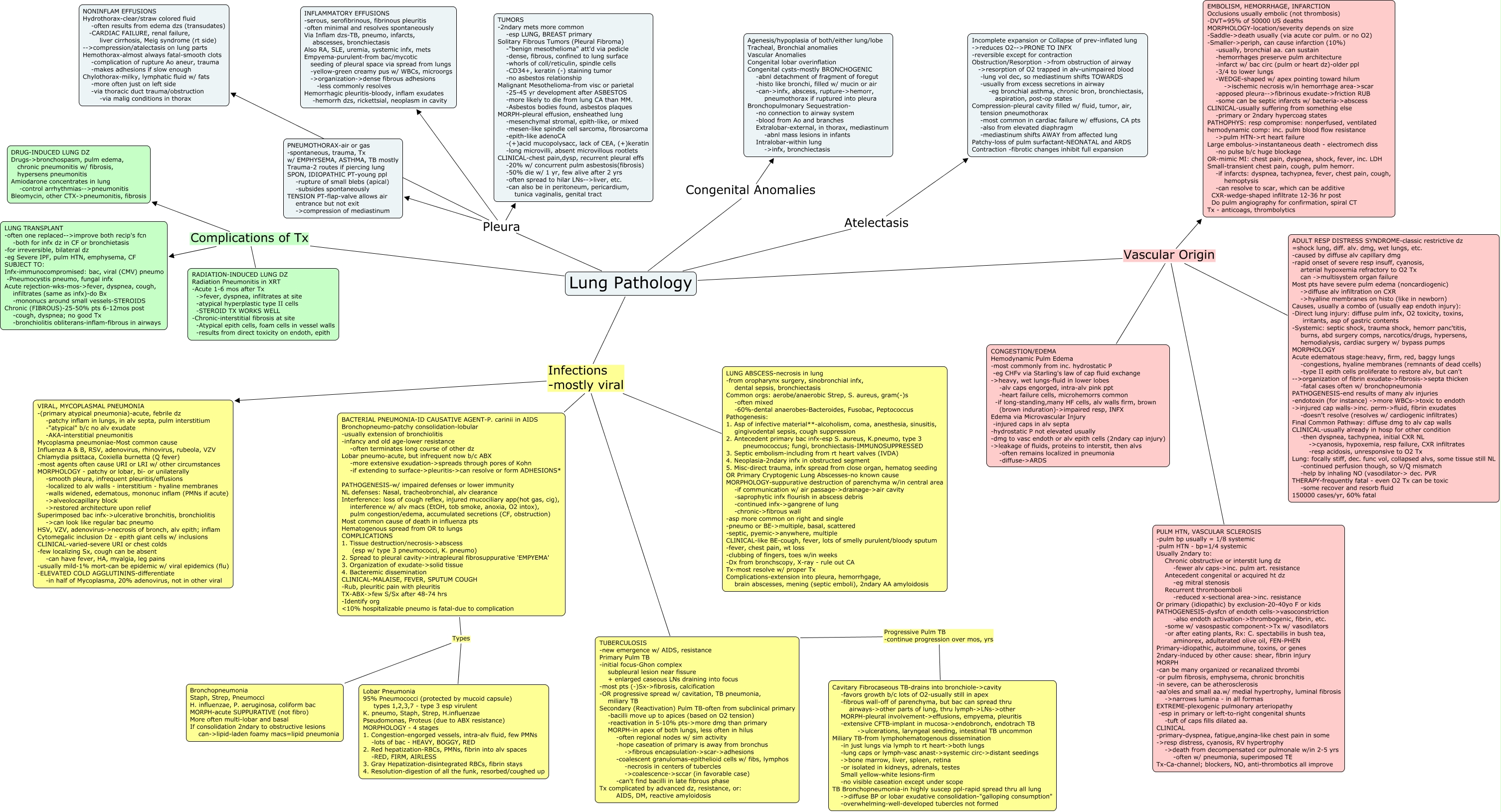 Pulmonary Pathology I, BACTERIAL PNEUMONIA-ID CAUSATIVE AGENT-P. carinii in AIDS Bronchopneumo-patchy consolidation-lobular -usually extension of bronchiolitis -infancy and old age-lower resistance -often terminates long course of other dz Lobar pneumo-acute, but infrequent now b/c ABX -more extensive exudation->spreads through pores of Kohn -if extending to surface->pleuritis->can resolve or form ADHESIONS* PATHOGENESIS-w/ impaired defenses or lower immunity NL defenses: Nasal, tracheobronchial, alv clearance Interference: loss of cough reflex, injured mucociliary app(hot gas, cig), interference w/ alv macs (EtOH, tob smoke, anoxia, O2 intox), pulm congestion/edema, accumulated secretions (CF, obstruction) Most common cause of death in influenza pts Hematogenous spread from OR to lungs COMPLICATIONS 1. Tissue destruction/necrosis->abscess (esp w/ type 3 pneumococci, K. pneumo) 2. Spread to pleural cavity->intrapleural fibrosuppurative 'EMPYEMA' 3. Organization of exudate->solid tissue 4. Bacteremic dissemination CLINICAL-MALAISE, FEVER, SPUTUM COUGH -Rub, pleuritic pain with pleuritis TX-ABX->few S/Sx after 48-74 hrs -Identify org % hospitalizable pneumo is fatal-due to complication Infections -mostly viral TUBERCULOSIS -new emergence w/ AIDS, resistance Primary Pulm TB -initial focus-Ghon complex subpleural lesion near fissure + enlarged caseous LNs draining into focus -most pts (-)Sx->fibrosis, calcification -OR progressive spread w/ cavitation, TB pneumonia, miliary TB Secondary (Reactivation) Pulm TB-often from subclinical primary -bacilli move up to apices (based on O2 tension) -reactivation in 5-10% pts->more dmg than primary MORPH-in apex of both lungs, less often in hilus -often regional nodes w/ sim activity -hope caseation of primary is away from bronchus ->fibrous encapsulation->scar->adhesions -coalescent granulomas-epithelioid cells w/ fibs, lymphos -necrosis in centers of tubercles ->coalescence->sccar (in favorable case) -can't find bacilli in late fibrous phase Tx complicated by advanced dz, resistance, or: AIDS, DM, reactive amyloidosis, BACTERIAL PNEUMONIA-ID CAUSATIVE AGENT-P. carinii in AIDS Bronchopneumo-patchy consolidation-lobular -usually extension of bronchiolitis -infancy and old age-lower resistance -often terminates long course of other dz Lobar pneumo-acute, but infrequent now b/c ABX -more extensive exudation->spreads through pores of Kohn -if extending to surface->pleuritis->can resolve or form ADHESIONS* PATHOGENESIS-w/ impaired defenses or lower immunity NL defenses: Nasal, tracheobronchial, alv clearance Interference: loss of cough reflex, injured mucociliary app(hot gas, cig), interference w/ alv macs (EtOH, tob smoke, anoxia, O2 intox), pulm congestion/edema, accumulated secretions (CF, obstruction) Most common cause of death in influenza pts Hematogenous spread from OR to lungs COMPLICATIONS 1. Tissue destruction/necrosis->abscess (esp w/ type 3 pneumococci, K. pneumo) 2. Spread to pleural cavity->intrapleural fibrosuppurative 'EMPYEMA' 3. Organization of exudate->solid tissue 4. Bacteremic dissemination CLINICAL-MALAISE, FEVER, SPUTUM COUGH -Rub, pleuritic pain with pleuritis TX-ABX->few S/Sx after 48-74 hrs -Identify org % hospitalizable pneumo is fatal-due to complication Types Lobar Pneumonia 95% Pneumococci (protected by mucoid capsule) types 1,2,3,7 - type 3 esp virulent K. pneumo, Staph, Strep, H.influenzae Pseudomonas, Proteus (due to ABX resistance) MORPHOLOGY - 4 stages 1. Congestion-engorged vessels, intra-alv fluid, few PMNs -lots of bac - HEAVY, BOGGY, RED 2. Red hepatization-RBCs, PMNs, fibrin into alv spaces -RED, FIRM, AIRLESS 3. Gray Hepatization-disintegrated RBCs, fibrin stays 4. Resolution-digestion of all the funk, resorbed/coughed up, Lung Pathology Pleura NONINFLAM EFFUSIONS Hydrothorax-clear/straw colored fluid -often results from edema dzs (transudates) -CARDIAC FAILURE, renal failure, liver cirrhosis, Meig syndrome (rt side) -->compression/atalectasis on lung parts Hemothorax-almost always fatal-smooth clots -complication of rupture Ao aneur, trauma -makes adhesions if slow enough Chylothorax-milky, lymphatic fluid w/ fats -more often just on left side -via thoracic duct trauma/obstruction -via malig conditions in thorax, Lung Pathology Vascular Origin ADULT RESP DISTRESS SYNDROME-classic restrictive dz =shock lung, diff. alv. dmg, wet lungs, etc. -caused by diffuse alv capillary dmg -rapid onset of severe resp insuff, cyanosis, arterial hypoxemia refractory to O2 Tx can ->multisystem organ failure Most pts have severe pulm edema (noncardiogenic) ->diffuse alv infiltration on CXR ->hyaline membranes on histo (like in newborn) Causes, usually a combo of (usually eap endoth injury): -Direct lung injury: diffuse pulm infx, O2 toxicity, toxins, irritants, asp of gastric contents -Systemic: septic shock, trauma shock, hemorr panc'titis, burns, abd surgery comps, narcotics/drugs, hypersens, hemodialysis, cardiac surgery w/ bypass pumps MORPHOLOGY Acute edematous stage:heavy, firm, red, baggy lungs -congestions, hyaline membranes (remnants of dead ccells) -type II epith cells proliferate to restore alv, but can't -->organization of fibrin exudate->fibrosis->septa thicken -fatal cases often w/ bronchopneumonia PATHOGENESIS-end results of many alv injuries -endotoxin (for instance) ->more WBCs->toxic to endoth ->injured cap walls->inc. perm->fluid, fibrin exudates -doesn't resolve (resolves w/ cardiogenic infiltrates) Final Common Pathway: diffuse dmg to alv cap walls CLINICAL-usually already in hosp for other condition -then dyspnea, tachypnea, initial CXR NL ->cyanosis, hypoxemia, resp failure, CXR infiltrates -resp acidosis, unresponsive to O2 Tx Lung: focally stiff, dec. func vol, collapsed alvs, some tissue still NL -continued perfusion though, so V/Q mismatch -help by inhaling NO (vasodilator-> dec. PVR THERAPY-frequently fatal - even O2 Tx can be toxic -some recover and resorb fluid 150000 cases/yr, 60% fatal, Lung Pathology I