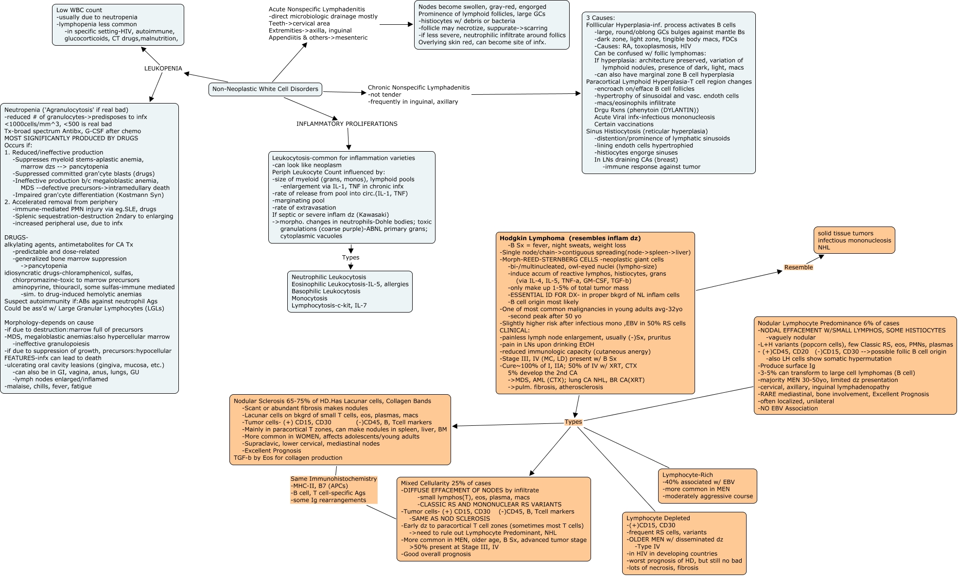 WBC Disorders (Non-Neoplastic), Non-Neoplastic White Cell Disorders Acute Nonspecific Lymphadenitis -direct microbiologic drainage mostly Teeth->cervical area Extremities->axilla, inguinal Appendiitis & others->mesenteric Nodes become swollen, gray-red, engorged Prominence of lymphoid follicles, large GCs -histiocytes w/ debris or bacteria -follicle may necrotize, suppurate->scarring -if less severe, neutrophilic infiltrate around follics Overlying skin red, can become site of infx., Leukocytosis-common for inflammation varieties -can look like neoplasm Periph Leukocyte Count influenced by: -size of myeloid (grans, monos), lymphoid pools -enlargement via IL-1, TNF in chronic infx -rate of release from pool into circ.(IL-1, TNF) -marginating pool -rate of extravasation If septic or severe inflam dz (Kawasaki) ->morpho. changes in neutrophils-Dohle bodies; toxic granulations (coarse purple)-ABNL primary grans; cytoplasmic vacuoles Types Neutrophilic Leukocytosis Eosinophilic Leukocytosis-IL-5, allergies Basophilic Leukocytosis Monocytosis Lymphocytosis-c-kit, IL-7, Non-Neoplastic White Cell Disorders LEUKOPENIA Neutropenia ('Agranulocytosis' if real bad) -reduced # of granulocytes->predisposes to infx cells/mm^3, is real bad Tx-broad spectrum Antibx, G-CSF after chemo MOST SIGNIFICANTLY PRODUCED BY DRUGS Occurs if: 1. Reduced/ineffective production -Suppresses myeloid stems-aplastic anemia, marrow dzs --> pancytopenia -Suppressed committed gran'cyte blasts (drugs) -Ineffective production b/c megaloblastic anemia, MDS --defective precursors->intramedullary death -Impaired gran'cyte differentiation (Kostmann Syn) 2. Accelerated removal from periphery -immune-mediated PMN injury via eg.SLE, drugs -Splenic sequestration-destruction 2ndary to enlarging -increased peripheral use, due to infx DRUGS- alkylating agents, antimetabolites for CA Tx -predictable and dose-related -generalized bone marrow suppression ->pancytopenia idiosyncratic drugs-chloramphenicol, sulfas, chlorpromazine-toxic to marrow precursors aminopyrine, thiouracil, some sulfas-immune mediated -sim. to drug-induced hemolytic anemias Suspect autoimmunity if:ABs against neutrophil Ags Could be ass'd w/ Large Granular Lymphocytes (LGLs) Morphology-depends on cause -if due to destruction:marrow full of precursors -MDS, megaloblastic anemias:also hypercellular marrow -ineffective granulopoiesis -if due to suppression of growth, precursors:hypocellular FEATURES-infx can lead to death -ulcerating oral cavity leasions (gingiva, mucosa, etc.) -can also be in GI, vagina, anus, lungs, GU -lymph nodes enlarged/inflamed -malaise, chills, fever, fatigue, Hodgkin Lymphoma (resembles inflam dz) -B Sx = fever, night sweats, weight loss -Single node/chain->contiguous spreading(node->spleen->liver) -Morph-REED-STERNBERG CELLS -neoplastic giant cells -bi-/multinucleated, owl-eyed nuclei (lympho-size) -induce accum of reactive lymphos, histiocytes, grans (via IL-4, IL-5, TNF-a, GM-CSF, TGF-b) -only make up 1-5% of total tumor mass -ESSENTIAL ID FOR DX- in proper bkgrd of NL inflam cells -B cell origin most likely -One of most common malignancies in young adults avg-32yo -second peak after 50 yo -Slightly higher risk after infectious mono ,EBV in 50% RS cells CLINICAL: -painless lymph node enlargement, usually (-)Sx, pruritus -pain in LNs upon drinking EtOH -reduced immunologic capacity (cutaneous anergy) -Stage III, IV (MC, LD) present w/ B Sx -Cure~100% of I, IIA; 50% of IV w/ XRT, CTX 5% develop the 2nd CA ->MDS, AML (CTX); lung CA NHL, BR CA(XRT) ->pulm. fibrosis, atherosclerosis Resemble solid tissue tumors infectious mononucleosis NHL, Non-Neoplastic White Cell Disorders INFLAMMATORY PROLIFERATIONS Leukocytosis-common for inflammation varieties -can look like neoplasm Periph Leukocyte Count influenced by: -size of myeloid (grans, monos), lymphoid pools -enlargement via IL-1, TNF in chronic infx -rate of release from pool into circ.(IL-1, TNF) -marginating pool -rate of extravasation If septic or severe inflam dz (Kawasaki) ->morpho. changes in neutrophils-Dohle bodies; toxic granulations (coarse purple)-ABNL primary grans; cytoplasmic vacuoles, Non-Neoplastic White Cell Disorders Chronic Nonspecific Lymphadenitis -not tender -frequently in inguinal, axillary 3 Causes: Folllicular Hyperplasia-inf. process activates B cells -large, round/oblong GCs bulges against mantle Bs -dark zone, light zone, tingible body macs, FDCs -Causes: RA, toxoplasmosis, HIV Can be confused w/ follic lymphomas: If hyperplasia: architecture preserved, variation of lymphoid nodules, presence of dark, light, macs -can also have marginal zone B cell hyperplasia Paracortical Lymphoid Hyperplasia-T cell region changes -encroach on/efface B cell follicles -hypertrophy of sinusoidal and vasc. endoth cells -macs/eosinophils infilitrate Drgu Rxns (phenytoin (DYLANTIN)) Acute Viral infx-infectious mononucleosis Certain vaccinations Sinus Histiocytosis (reticular hyperplasia) -distention/prominence of lymphatic sinusoids -lining endoth cells hypertrophied -histiocytes engorge sinuses In LNs draining CAs (breast) -immune response against tumor, Hodgkin Lymphoma (resembles inflam dz) -B Sx = fever, night sweats, weight loss -Single node/chain->contiguous spreading(node->spleen->liver) -Morph-REED-STERNBERG CELLS -neoplastic giant cells -bi-/multinucleated, owl-eyed nuclei (lympho-size) -induce accum of reactive lymphos, histiocytes, grans (via IL-4, IL-5, TNF-a, GM-CSF, TGF-b) -only make up 1-5% of total tumor mass -ESSENTIAL ID FOR DX- in proper bkgrd of NL inflam cells -B cell origin most likely -One of most common malignancies in young adults avg-32yo -second peak after 50 yo -Slightly higher risk after infectious mono ,EBV in 50% RS cells CLINICAL: -painless lymph node enlargement, usually (-)Sx, pruritus -pain in LNs upon drinking EtOH -reduced immunologic capacity (cutaneous anergy) -Stage III, IV (MC, LD) present w/ B Sx -Cure~100% of I, IIA; 50% of IV w/ XRT, CTX 5% develop 
