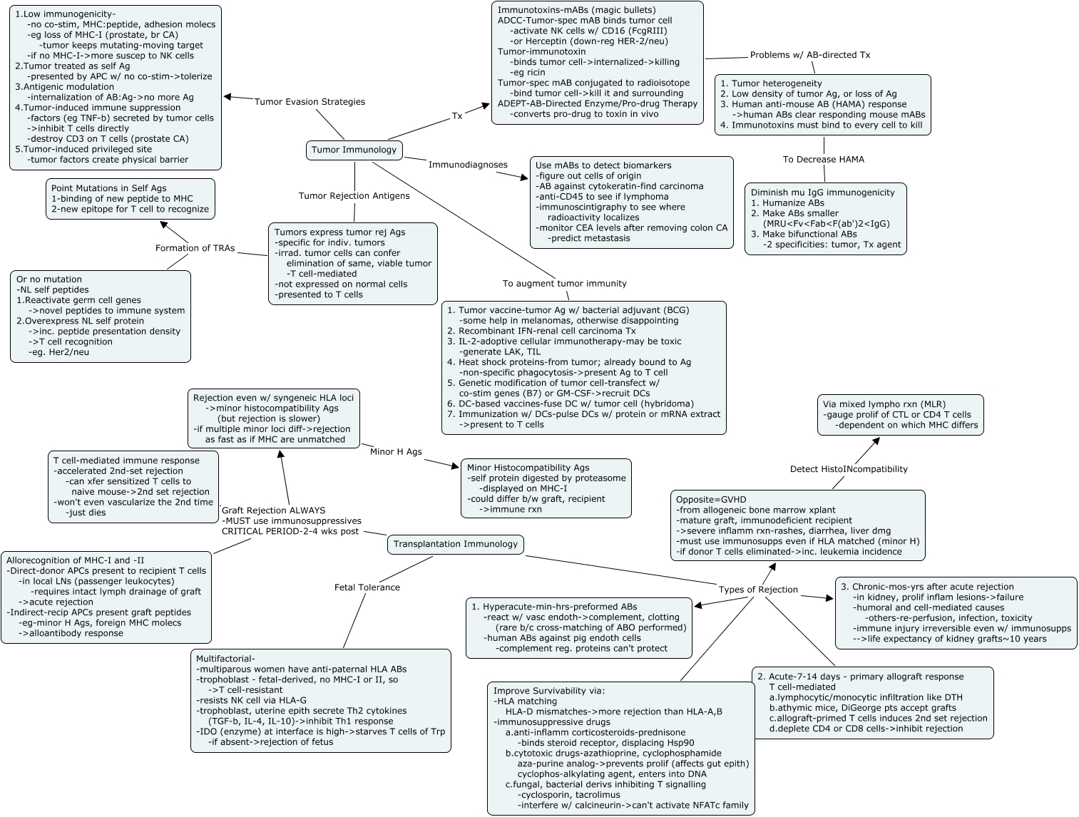 Tumor Immunology, Tumors express tumor rej Ags -specific for indiv. tumors -irrad. tumor cells can confer elimination of same, viable tumor -T cell-mediated -not expressed on normal cells -presented to T cells Formation of TRAs Or no mutation -NL self peptides 1.Reactivate germ cell genes ->novel peptides to immune system 2.Overexpress NL self protein ->inc. peptide presentation density ->T cell recognition -eg. Her2/neu, Tumor Immunology To augment tumor immunity 1. Tumor vaccine-tumor Ag w/ bacterial adjuvant (BCG) -some help in melanomas, otherwise disappointing 2. Recombinant IFN-renal cell carcinoma Tx 3. IL-2-adoptive cellular immunotherapy-may be toxic -generate LAK, TIL 4. Heat shock proteins-from tumor; already bound to Ag -non-specific phagocytosis->present Ag to T cell 5. Genetic modification of tumor cell-transfect w/ co-stim genes (B7) or GM-CSF->recruit DCs 6. DC-based vaccines-fuse DC w/ tumor cell (hybridoma) 7. Immunization w/ DCs-pulse DCs w/ protein or mRNA extract ->present to T cells, Tumors express tumor rej Ags -specific for indiv. tumors -irrad. tumor cells can confer elimination of same, viable tumor -T cell-mediated -not expressed on normal cells -presented to T cells Formation of TRAs Point Mutations in Self Ags 1-binding of new peptide to MHC 2-new epitope for T cell to recognize, Transplantation Immunology Types of Rejection Opposite=GVHD -from allogeneic bone marrow xplant -mature graft, immunodeficient recipient ->severe inflamm rxn-rashes, diarrhea, liver dmg -must use immunosupps even if HLA matched (minor H) -if donor T cells eliminated->inc. leukemia incidence, Rejection even w/ syngeneic HLA loci ->minor histocompatibility Ags (but rejection is slower) -if multiple minor loci diff->rejection as fast as if MHC are unmatched Minor H Ags Minor Histocompatibility Ags -self protein digested by proteasome -displayed on MHC-I -could differ b/w graft, recipient ->immune rxn, Transplantation Immunology Graft Rejection ALWAYS -MUST use immunosuppressives CRITICAL PERIOD-2-4 wks post T cell-mediated immune response -accelerated 2nd-set rejection -can xfer sensitized T cells to naive mouse-ɮnd set rejection -won't even vascularize the 2nd time -just dies, Tumor Immunology Immunodiagnoses Use mABs to detect biomarkers -figure out cells of origin -AB against cytokeratin-find carcinoma -anti-CD45 to see if lymphoma -immunoscintigraphy to see where radioactivity localizes -monitor CEA levels after removing colon CA -predict metastasis, Transplantation Immunology Types of Rejection Improve Survivability via: -HLA matching HLA-D mismatches->more rejection than HLA-A,B -immunosuppressive drugs a.anti-inflamm corticosteroids-prednisone -binds steroid receptor, displacing Hsp90 b.cytotoxic drugs-azathioprine, cyclophosphamide aza-purine analog->prevents prolif (affects gut epith) cyclophos-alkylating agent, enters into DNA c.fungal, bacterial derivs inhibiting T signalling -cyclosporin, tacrolimus -interfere w/ calcineurin->can't activate NFATc family, Transplantation Immunology Types of Rejection 2. Acute-7-14 days - primary allograft response T cell-mediated a.lymphocytic/monocytic infiltration like DTH b.athymic mice, DiGeorge pts accept grafts c.allograft-primed T cells induces 2nd set rejection d.deplete CD4 or CD8 cells->inhibit rejection, 1. Tumor heterogeneity 2. Low density of tumor Ag, or loss of Ag 3. Human anti-mouse AB (HAMA) response ->human ABs clear responding mouse mABs 4. Immunotoxins must bind to every cell to kill To Decrease HAMA Diminish mu IgG immunogenicity 1. Humanize ABs 2. Make ABs smaller (MRU<Fv<Fab<F(ab')2<IgG) 3. Make bifunctional ABs -2 specificities: tumor, Tx agent