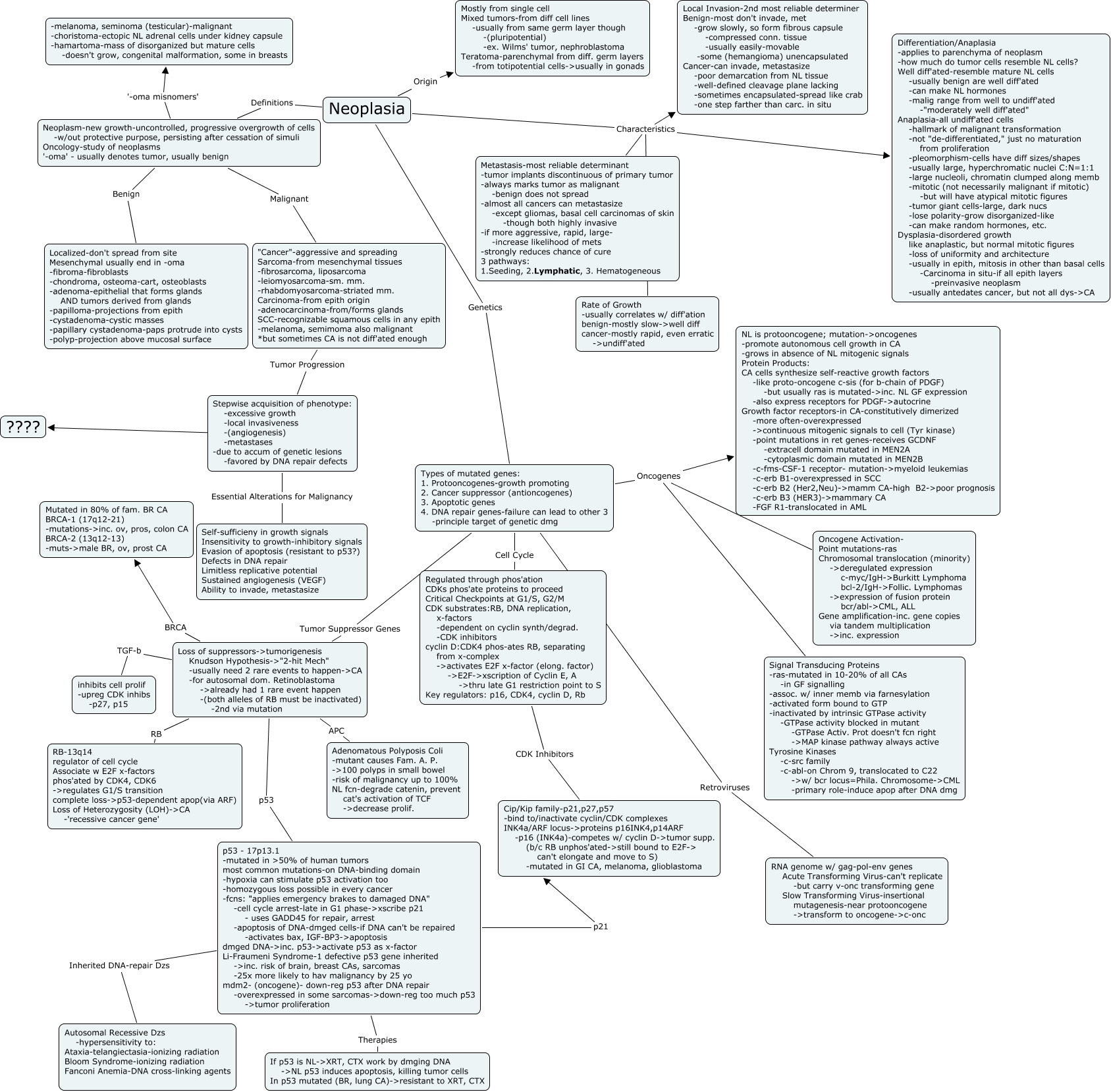 Neoplasia, Regulated through phos'ation CDKs phos'ate proteins to proceed Critical Checkpoints at G1/S, G2/M CDK substrates:RB, DNA replication, x-factors -dependent on cyclin synth/degrad. -CDK inhibitors cyclin D:CDK4 phos-ates RB, separating from x-complex ->activates E2F x-factor (elong. factor) ->E2F->xscription of Cyclin E, A ->thru late G1 restriction point to S Key regulators: p16, CDK4, cyclin D, Rb CDK Inhibitors Cip/Kip family-p21,p27,p57 -bind to/inactivate cyclin/CDK complexes INK4a/ARF locus->proteins p16INK4,p14ARF -p16 (INK4a)-competes w/ cyclin D->tumor supp. (b/c RB unphos'ated->still bound to E2F-> can't elongate and move to S) -mutated in GI CA, melanoma, glioblastoma, Loss of suppressors->tumorigenesis Knudson Hypothesis->"2-hit Mech" -usually need 2 rare events to happen->CA -for autosomal dom. Retinoblastoma ->already had 1 rare event happen -(both alleles of RB must be inactivated) -2nd via mutation p53 p53 - 17p13.1 -mutated in ᡪ% of human tumors most common mutations-on DNA-binding domain -hypoxia can stimulate p53 activation too -homozygous loss possible in every cancer -fcns: "applies emergency brakes to damaged DNA" -cell cycle arrest-late in G1 phase->xscribe p21 - uses GADD45 for repair, arrest -apoptosis of DNA-dmged cells-if DNA can't be repaired -activates bax, IGF-BP3->apoptosis dmged DNA->inc. p53->activate p53 as x-factor Li-Fraumeni Syndrome-1 defective p53 gene inherited ->inc. risk of brain, breast CAs, sarcomas -25x more likely to hav malignancy by 25 yo mdm2- (oncogene)- down-reg p53 after DNA repair -overexpressed in some sarcomas->down-reg too much p53 ->tumor proliferation, Neoplasm-new growth-uncontrolled, progressive overgrowth of cells -w/out protective purpose, persisting after cessation of simuli Oncology-study of neoplasms '-oma' - usually denotes tumor, usually benign '-oma misnomers' -melanoma, seminoma (testicular)-malignant -choristoma-ectopic NL adrenal cells under kidney capsule -hamartoma-mass of disorganized but mature cells -doesn't grow, congenital malformation, some in breasts, Types of mutated genes: 1. Protooncogenes-growth promoting 2. Cancer suppressor (antioncogenes) 3. Apoptotic genes 4. DNA repair genes-failure can lead to other 3 -principle target of genetic dmg Oncogenes Signal Transducing Proteins -ras-mutated in 10-20% of all CAs -in GF signalling -assoc. w/ inner memb via farnesylation -activated form bound to GTP -inactivated by intrinsic GTPase activity -GTPase activity blocked in mutant -GTPase Activ. Prot doesn't fcn right ->MAP kinase pathway always active Tyrosine Kinases -c-src family -c-abl-on Chrom 9, translocated to C22 ->w/ bcr locus=Phila. Chromosome->CML -primary role-induce apop after DNA dmg, "Cancer"-aggressive and spreading Sarcoma-from mesenchymal tissues -fibrosarcoma, liposarcoma -leiomyosarcoma-sm. mm. -rhabdomyosarcoma-striated mm. Carcinoma-from epith origin -adenocarcinoma-from/forms glands SCC-recognizable squamous cells in any epith -melanoma, semimoma also malignant *but sometimes CA is not diff'ated enough Tumor Progression Stepwise acquisition of phenotype: -excessive growth -local invasiveness -(angiogenesis) -metastases -due to accum of genetic lesions -favored by DNA repair defects, Neoplasia Origin Mostly from single cell Mixed tumors-from diff cell lines -usually from same germ layer though -(pluripotential) -ex. Wilms' tumor, nephroblastoma Teratoma-parenchymal from diff. germ layers -from totipotential cells->usually in gonads, Neoplasia Characteristics Metastasis-most reliable determinant -tumor implants discontinuous of primary tumor -always marks tumor as malignant -benign does not spread -almost all cancers can metastasize -except gliomas, basal cell carcinomas of skin -though both highly invasive -if more aggressive, rapid, large- -increase likelihood of mets -strongly reduces chance of cure 3 pathways: 1.Seeding, 2.Lymphatic, 3. Hematogeneous, Loss of suppressors->tumorigenesis Knudson Hypothesis->"2-hit Mech" -usually need 2 rare events to happen->CA -for autosomal dom. Retinoblastoma ->already had 1 rare event happen -(both alleles of RB must be inactivated) -2nd via mutation BRCA Mutated in 80% of fam. BR CA BRCA-1 (17q12-21) -mutations->inc. ov, pros, colon CA BRCA-2 (13q12-13) -muts->male BR, ov, prost CA, Neoplasia Characteristics Differentiation/Anaplasia -applies to parenchyma of neoplasm -how much do tumor cells resemble NL cells? Well diff'ated-resemble mature NL cells -usually benign are well diff'ated -can make NL hormones -malig range from well to undiff'ated -"moderately well diff'ated" Anaplasia-all undiff'ated cells -hallmark of malignant transformation -not "de-differentiated," just no maturation from proliferation -pleomorphism-cells have diff sizes/shapes -usually large, hyperchromatic nuclei C:N=1:1 -large nucleoli, chromatin clumped along memb -mitotic (not necessarily malignant if mitotic) -but will have atypical mitotic figures -tumor giant cells-large, dark nucs -lose polarity-grow disorganized-like -can make random hormones, etc. Dysplasia-disordered growth like anaplastic, but normal mitotic figures -loss of uniformity and architecture -usually in epith, mitosis in other than basal cells -Carcinoma in situ-if all epith layers -preinvasive neoplasm -usually antedates cancer, but not all dys->CA, Types of mutated genes: 1. Protooncogenes-growth promoting 2. Cancer suppressor (antioncogenes) 3. Apoptotic genes 4. DNA repair genes-failure can lead to other 3 -principle target of genetic dmg Retroviruses RNA genome w/ gag-pol-env genes Acute Transforming Virus-can't replicate -but carry v-onc transforming gene Slow Transforming Virus-insertional mutagenesis-near protooncogene ->transform to oncogene->c-onc