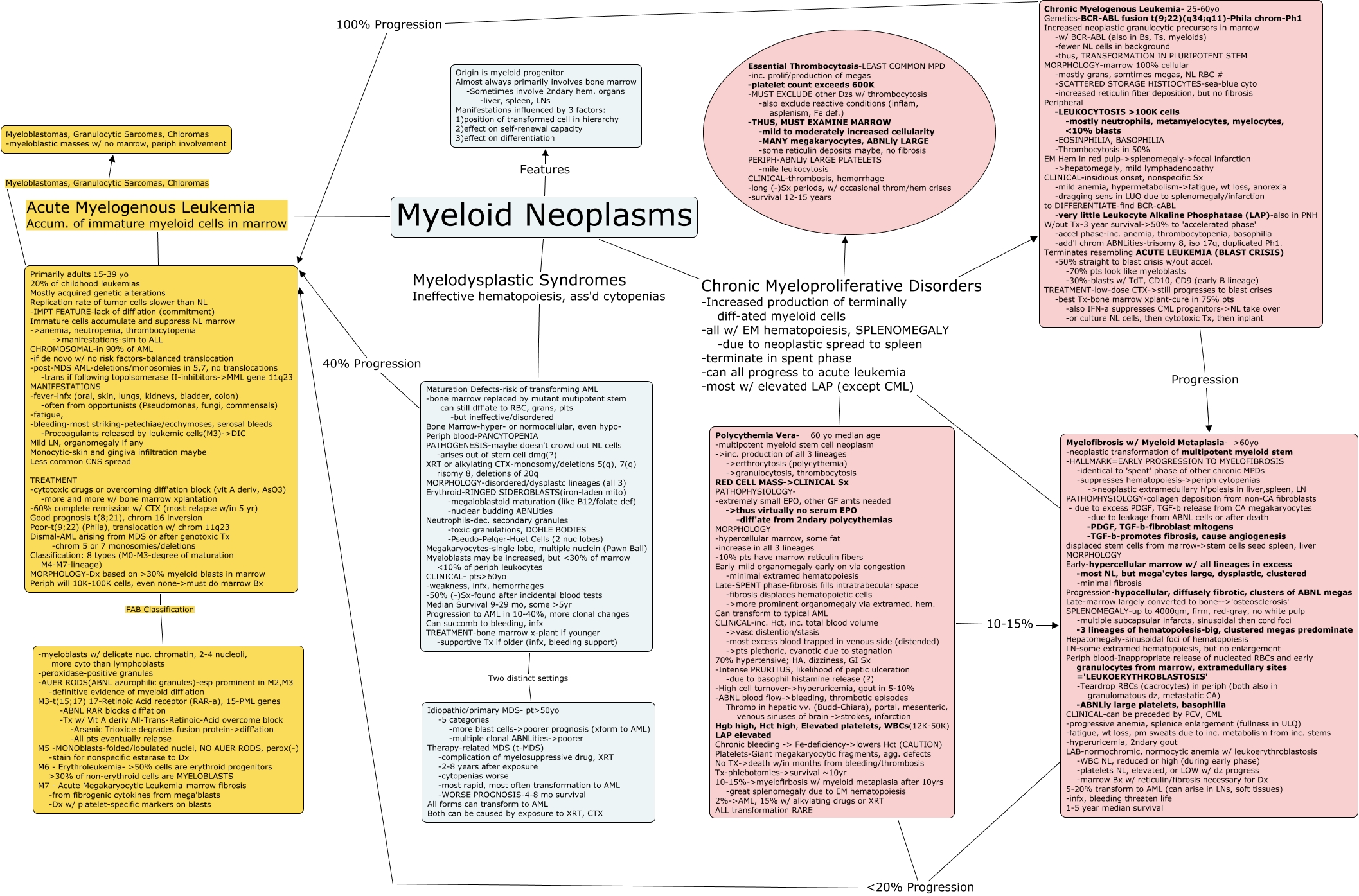 Myeloid Neoplasms, Myeloid Neoplasms Chronic Myeloproliferative Disorders -Increased production of terminally diff-ated myeloid cells -all w/ EM hematopoiesis, SPLENOMEGALY -due to neoplastic spread to spleen -terminate in spent phase -can all progress to acute leukemia -most w/ elevated LAP (except CML) Essential Thrombocytosis-LEAST COMMON MPD -inc. prolif/production of megas -platelet count exceeds 600K -MUST EXCLUDE other Dzs w/ thrombocytosis -also exclude reactive conditions (inflam, asplenism, Fe def.) -THUS, MUST EXAMINE MARROW -mild to moderately increased cellularity -MANY megakaryocytes, ABNLly LARGE -some reticulin deposits maybe, no fibrosis PERIPH-ABNLly LARGE PLATELETS -mile leukocytosis CLINICAL-thrombosis, hemorrhage -long (-)Sx periods, w/ occasional throm/hem crises -survival 12-15 years, Myeloid Neoplasms Myelodysplastic Syndromes Ineffective hematopoiesis, ass'd cytopenias Maturation Defects-risk of transforming AML -bone marrow replaced by mutant mutipotent stem -can still dff'ate to RBC, grans, plts -but ineffective/disordered Bone Marrow-hyper- or normocellular, even hypo- Periph blood-PANCYTOPENIA PATHOGENESIS-maybe doesn't crowd out NL cells -arises out of stem cell dmg(?) XRT or alkylating CTX-monosomy/deletions 5(q), 7(q) risomy 8, deletions of 20q MORPHOLOGY-disordered/dysplastc lineages (all 3) Erythroid-RINGED SIDEROBLASTS(iron-laden mito) -megaloblastoid maturation (like B12/folate def) -nuclear budding ABNLities Neutrophils-dec. secondary granules -toxic granulations, DOHLE BODIES -Pseudo-Pelger-Huet Cells (2 nuc lobes) Megakaryocytes-single lobe, multiple nuclein (Pawn Ball) Myeloblasts may be increased, but ណ% of marrow % of periph leukocytes CLINICAL- ptsᡴyo -weakness, infx, hemorrhages -50% (-)Sx-found after incidental blood tests Median Survival 9-29 mo, some ɱyr Progression to AML in 10-40%, more clonal changes Can succomb to bleeding, infx TREATMENT-bone marrow x-plant if younger -supportive Tx if older (infx, bleeding support), Myeloid Neoplasms Acute Myelogenous Leukemia Accum. of immature myeloid cells in marrow Primarily adults 15-39 yo 20% of childhood leukemias Mostly acquired genetic alterations Replication rate of tumor cells slower than NL -IMPT FEATURE-lack of diff'ation (commitment) Immature cells accumulate and suppress NL marrow ->anemia, neutropenia, thrombocytopenia ->manifestations-sim to ALL CHROMOSOMAL-in 90% of AML -if de novo w/ no risk factors-balanced translocation -post-MDS AML-deletions/monosomies in 5,7, no translocations -trans if following topoisomerase II-inhibitors->MML gene 11q23 MANIFESTATIONS -fever-infx (oral, skin, lungs, kidneys, bladder, colon) -often from opportunists (Pseudomonas, fungi, commensals) -fatigue, -bleeding-most striking-petechiae/ecchymoses, serosal bleeds -Procoagulants released by leukemic cells(M3)->DIC Mild LN, organomegaly if any Monocytic-skin and gingiva infiltration maybe Less common CNS spread TREATMENT -cytotoxic drugs or overcoming diff'ation block (vit A deriv, AsO3) -more and more w/ bone marrow xplantation -60% complete remission w/ CTX (most relapse w/in 5 yr) Good prognosis-t(8;21), chrom 16 inversion Poor-t(9;22) (Phila), translocation w/ chrom 11q23 Dismal-AML arising from MDS or after genotoxic Tx -chrom 5 or 7 monosomies/deletions Classification: 8 types (M0-M3-degree of maturation M4-M7-lineage) MORPHOLOGY-Dx based on ᡖ% myeloid blasts in marrow Periph will 10K-100K cells, even none->must do marrow Bx, Chronic Myelogenous Leukemia- 25-60yo Genetics-BCR-ABL fusion t(9;22)(q34;q11)-Phila chrom-Ph1 Increased neoplastic granulocytic precursors in marrow -w/ BCR-ABL (also in Bs, Ts, myeloids) -fewer NL cells in background -thus, TRANSFORMATION IN PLURIPOTENT STEM MORPHOLOGY-marrow 100% cellular -mostly grans, somtimes megas, NL RBC # -SCATTERED STORAGE HISTIOCYTES-sea-blue cyto -increased reticulin fiber deposition, but no fibrosis Peripheral -LEUKOCYTOSIS K cells -mostly neutrophils, metamyelocytes, myelocytes, % blasts -EOSINPHILIA, BASOPHILIA -Thrombocytosis in 50% EM Hem in red pulp->splenomegaly->focal infarction ->hepatomegaly, mild lymphadenopathy CLINICAL-insidious onset, nonspecific Sx -mild anemia, hypermetabolism->fatigue, wt loss, anorexia -dragging sens in LUQ due to splenomegaly/infarction to DIFFERENTIATE-find BCR-cABL -very little Leukocyte Alkaline Phosphatase (LAP)-also in PNH W/out Tx-3 year survival-ᡪ% to 'accelerated phase' -accel phase-inc. anemia, thrombocytopenia, basophilia -add'l chrom ABNLities-trisomy 8, iso 17q, duplicated Ph1. Terminates resembling ACUTE LEUKEMIA (BLAST CRISIS) -50% straight to blast crisis w/out accel. -70% pts look like myeloblasts -30%-blasts w/ TdT, CD10, CD9 (early B lineage) TREATMENT-low-dose CTX->still progresses to blast crises -best Tx-bone marrow xplant-cure in 75% pts -also IFN-a suppresses CML progenitors->NL take over -or culture NL cells, then cytotoxic Tx, then inplant 100% Progression Primarily adults 15-39 yo 20% of childhood leukemias Mostly acquired genetic alterations Replication rate of tumor cells slower than NL -IMPT FEATURE-lack of diff'ation (commitment) Immature cells accumulate and suppress NL marrow ->anemia, neutropenia, thrombocytopenia ->manifestations-sim to ALL CHROMOSOMAL-in 90% of AML -if de novo w/ no risk factors-balanced translocation -post-MDS AML-deletions/monosomies in 5,7, no translocations -trans if following topoisomerase II-inhibitors->MML gene 11q23 MANIFESTATIONS -fever-infx (oral, skin, lungs, kidneys, bladder, colon) -often from opportunists (Pseudomonas, fungi, commensals) -fatigue, -bleeding-most striking-petechiae/ecchymoses, serosal bleeds -Procoagulants released by leukemic cells(M3)->DIC Mild LN, organomegaly if any Monocytic-skin and gingiva infiltration maybe Less common CNS spread TREATMENT -cytotoxic drugs or overcoming diff'ation block (vit A deriv, AsO3) -more and more w/ bone marrow xplantation -60% complete remission w/ CTX (most relapse w/in 5 yr) Good prognosis-t