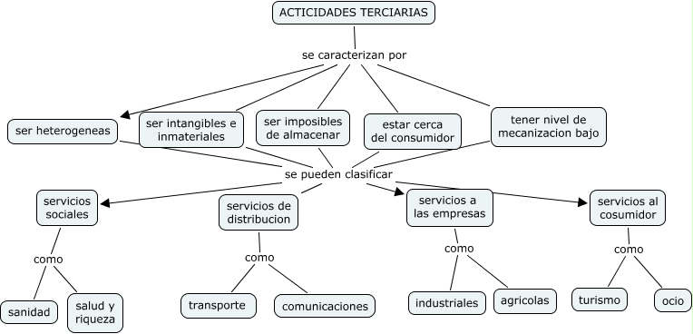 Este mapa conceptual tiene información relacionada a: chantal flores izquierdo UN 6, estar cerca del consumidor se pueden clasificar servicios sociales, ser intangibles e inmateriales se pueden clasificar servicios al cosumidor, servicios a las empresas como agricolas, ser intangibles e inmateriales se pueden clasificar servicios de distribucion, ser heterogeneas se pueden clasificar servicios a las empresas, ACTICIDADES TERCIARIAS se caracterizan por tener nivel de mecanizacion bajo, servicios de distribucion como comunicaciones, ser intangibles e inmateriales se pueden clasificar servicios a las empresas, ACTICIDADES TERCIARIAS se caracterizan por ser imposibles de almacenar, tener nivel de mecanizacion bajo se pueden clasificar servicios a las empresas