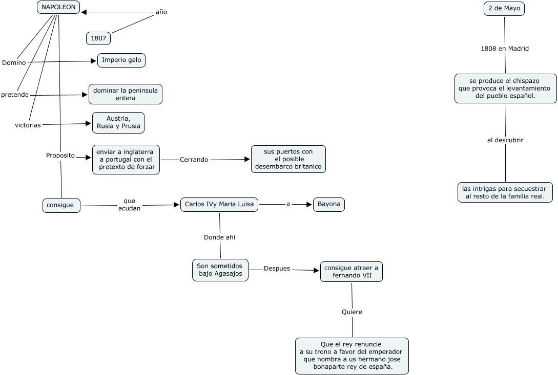 Este mapa conceptual tiene información relacionada a: 13.Daniela Morán Olvera- batalla de chiclana, enviar a inglaterra a portugal con el pretexto de forzar Cerrando sus puertos con el posible desembarco britanico, 2 de Mayo 1808 en Madrid se produce el chispazo que provoca el levantamiento del pueblo español., Carlos IVy Maria Luisa a Bayona, NAPOLEON Domino Imperio galo, consigue atraer a fernando VII Quiere Que el rey renuncie a su trono a favor del emperador que nombra a us hermano jose bonaparte rey de españa., consigue que acudan Carlos IVy Maria Luisa, NAPOLEON pretende dominar la peninsula entera, NAPOLEON Proposito consigue, se produce el chispazo que provoca el levantamiento del pueblo español. al descubrir las intrigas para secuestrar al resto de la familia real., Carlos IVy Maria Luisa Donde ahi Son sometidos bajo Agasajos