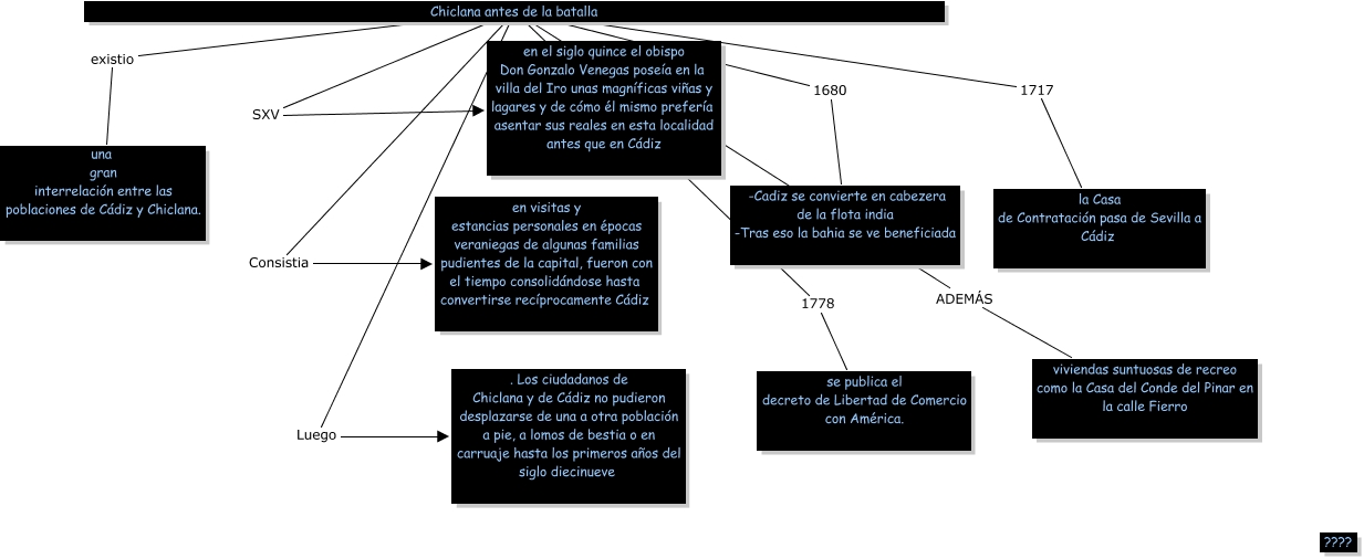 Este mapa conceptual tiene información relacionada a: 13.Daniela Morán Olvera, Chiclana antes de la batalla SXV en el siglo quince el obispo Don Gonzalo Venegas poseía en la villa del Iro unas magníficas viñas y lagares y de cómo él mismo prefería asentar sus reales en esta localidad antes que en Cádiz, Chiclana antes de la batalla 1778 se publica el decreto de Libertad de Comercio con América., Chiclana antes de la batalla 1680 -Cadiz se convierte en cabezera de la flota india -Tras eso la bahia se ve beneficiada, Chiclana antes de la batalla existio una gran interrelación entre las poblaciones de Cádiz y Chiclana., Chiclana antes de la batalla ADEMÁS viviendas suntuosas de recreo como la Casa del Conde del Pinar en la calle Fierro, Chiclana antes de la batalla 1717 la Casa de Contratación pasa de Sevilla a Cádiz, Chiclana antes de la batalla Luego . Los ciudadanos de Chiclana y de Cádiz no pudieron desplazarse de una a otra población a pie, a lomos de bestia o en carruaje hasta los primeros años del siglo diecinueve, Chiclana antes de la batalla Consistia en visitas y estancias personales en épocas veraniegas de algunas familias pudientes de la capital, fueron con el tiempo consolidándose hasta convertirse recíprocamente Cádiz