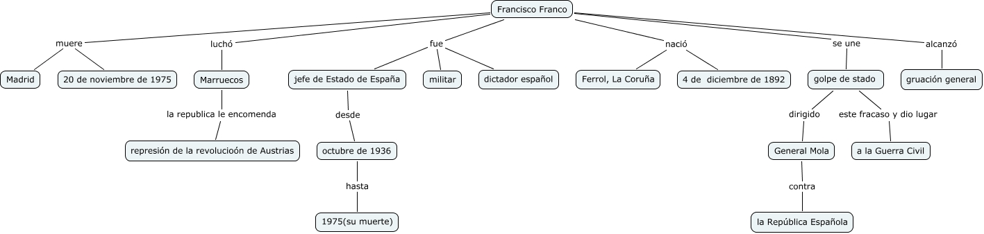 Este mapa conceptual tiene información relacionada a: 15.Ana Muñoz Rivera. Franco, Francisco Franco muere Madrid, Francisco Franco nació Ferrol, La Coruña, golpe de stado dirigido General Mola, golpe de stado este fracaso y dio lugar a la Guerra Civil, Francisco Franco luchó Marruecos, Marruecos la republica le encomenda represión de la revolucioón de Austrias, octubre de 1936 hasta 1975(su muerte), Francisco Franco nació 4 de diciembre de 1892, Francisco Franco fue jefe de Estado de España, General Mola contra la República Española
