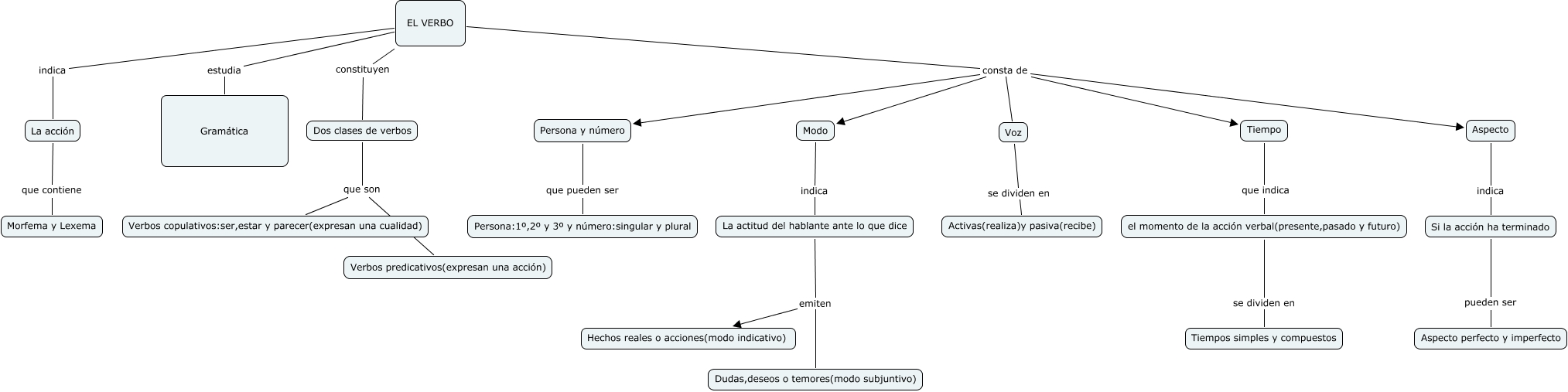 Este mapa conceptual tiene información relacionada a: Mª josé Gutiérrez Butrón(gramática tema3), Persona y número que pueden ser Persona:1º,2º y 3º y número:singular y plural, Voz se dividen en Activas(realiza)y pasiva(recibe), EL VERBO consta de Tiempo, Tiempo que indica el momento de la acción verbal(presente,pasado y futuro), Dos clases de verbos que son Verbos predicativos(expresan una acción), EL VERBO consta de Persona y número, Si la acción ha terminado pueden ser Aspecto perfecto y imperfecto, EL VERBO consta de Modo, Modo indica La actitud del hablante ante lo que dice, La actitud del hablante ante lo que dice emiten Dudas,deseos o temores(modo subjuntivo)