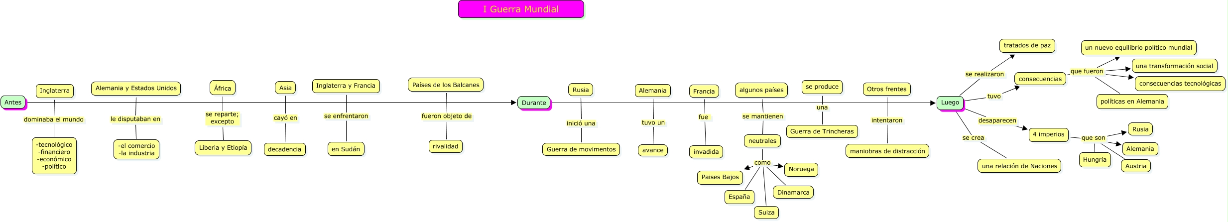 Este mapa conceptual tiene información relacionada a: 15.Patricia López Fuentes-I Guerra Mundial, consecuencias que fueron un nuevo equilibrio político mundial, Otros frentes intentaron maniobras de distracción, 4 imperios que son Hungría, algunos países se mantienen neutrales, Asia cayó en decadencia, Rusia inició una Guerra de movimentos, se produce una Guerra de Trincheras, Inglaterra dominaba el mundo -tecnológico -financiero -económico -político, África se reparte; excepto Liberia y Etiopía, neutrales como Dinamarca