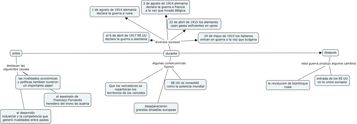 Este mapa conceptual tiene información relacionada a: 24.Mario Vázquez Pérez -1ª guerra mundial, durante diversos sucesos 24 de mayo de 1915 los italianos entran en guerra a la vez que bulgaria, durante diversos sucesos el 6 de abril de 1917 EE.UU declara la guerra a alemania, antes destacan las siguientes causas el desarrollo industrial y la competencia que generó rivalidades entre paises, despues esta guerra produjo algunos cambios la revolucion de bolchicque rusia, durante diversos sucesos 1 de agosto de 1914 alemania declara la guerra a rusia, antes despues, durante diversos sucesos 3 de agosto de 1914 alemania declara la guerra a francia a la vez que invade Bélgica, durante algunas consecuencias fueron Que los vencedores se repartieran los territorios de los vencidos, durante algunas consecuencias fueron desaparecieron grandes dinastías europeas, antes destacan las siguientes causas las rivalidades económicas y políticas tambien tuvieron un importante papel