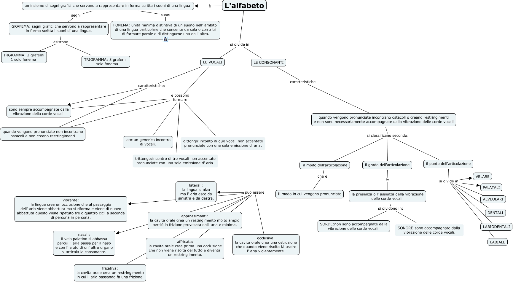 Questa Cmap, creata con IHMC CmapTools, contiene informazioni relative a: lavoro di gruppo di grammatica Agresta, Mattozzi, Panaroni, Petrucci, LE VOCALI e possono formare trittongo:incontro di tre vocali non accentate pronunciate con una sola emissione d' aria., Il modo in cui vengono pronunciate può essere affricata: la cavita orale crea prima una occlusione che non viene risolta del tutto e diventa un restringiimento., il punto dell'articolazione si divide in LABIALE, Il modo in cui vengono pronunciate può essere occlusiva: la cavita orale crea una ostruzione che quando viene risolta fà uscire l' aria violentemente., un insieme di segni grafici che servono a rappresentare in forma scritta i suoni di una lingua segni GRAFEMA: segni grafici che servono a rappresentare in forma scritta i suoni di una lingua., sono sempre accompagnate dalla vibrazione della corde vocali. e possono formare trittongo:incontro di tre vocali non accentate pronunciate con una sola emissione d' aria., quando vengono pronunciate incontrano ostacoli o creano restringimenti e non sono necessariamente accompagnate dalla vibrazione delle corde vocali si classificano secondo: il grado dell'articolazione, LE VOCALI caratteristiche: quando vengono pronunciate non incontrano ostacoli e non creano restringimenti., la presenza o l' assenza della vibrazione delle corde vocali. si dividono in: SONORE:sono accompagnate dalla vibrazione delle corde vocali., affricata: la cavita orale crea prima una occlusione che non viene risolta del tutto e diventa un restringiimento. può essere approssimanti: la cavita orale crea un restingimento molto ampio perciò la frizione provocata dall' aria è minima., il grado dell'articolazione è: la presenza o l' assenza della vibrazione delle corde vocali., il punto dell'articolazione si divide in VELARE, L'alfabeto si divide in LE CONSONANTI, Il modo in cui vengono pronunciate può essere nasali: il velo palatino si abbassa percui l' aria passa per il naso e con l' aiuto di un' altro organo si articola la consonante., la presenza o l' assenza della vibrazione delle corde vocali. si dividono in: SORDE:non sono accompagnate dalla vibrazione delle corde vocali., LE VOCALI caratteristiche: sono sempre accompagnate dalla vibrazione della corde vocali., affricata: la cavita orale crea prima una occlusione che non viene risolta del tutto e diventa un restringiimento. può essere laterali: la lingua si alza ma l' aria esce da sinistra e da destra., LE VOCALI e possono formare dittongo:inconto di due vocali non accentate pronunciate con una sola emissione d' aria., L'alfabeto è un insieme di segni grafici che servono a rappresentare in forma scritta i suoni di una lingua, GRAFEMA: segni grafici che servono a rappresentare in forma scritta i suoni di una lingua. esistono DIGRAMMA: 2 grafemi 1 solo fonema