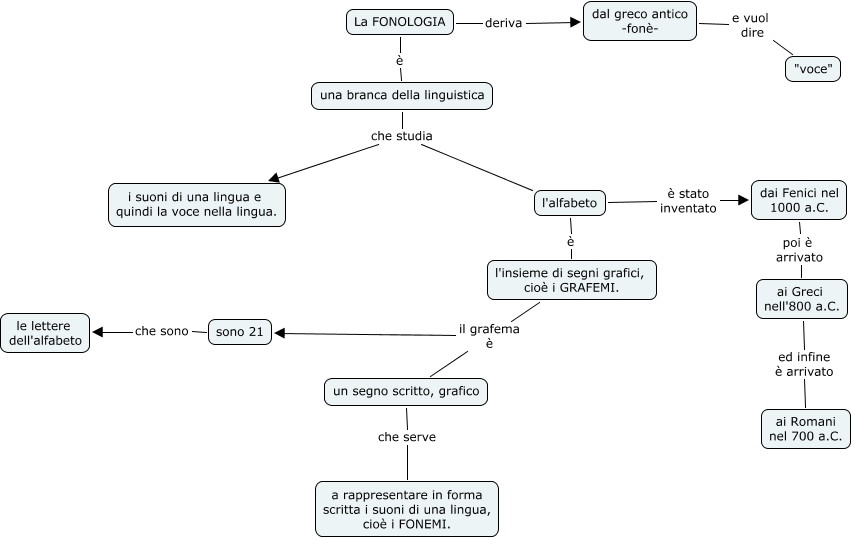 Questa Mappa Concettuale ha informazioni correlate a: La fonologia, un segno scritto, grafico che serve a rappresentare in forma scritta i suoni di una lingua, cioè i FONEMI., sono 21 che sono le lettere dell'alfabeto, l'alfabeto è l'insieme di segni grafici, cioè i GRAFEMI., dai Fenici nel 1000 a.C. poi è arrivato ai Greci nell'800 a.C., una branca della linguistica che studia i suoni di una lingua e quindi la voce nella lingua., La FONOLOGIA deriva dal greco antico -fonè-, l'insieme di segni grafici, cioè i GRAFEMI. il grafema è un segno scritto, grafico, La FONOLOGIA è una branca della linguistica, l'insieme di segni grafici, cioè i GRAFEMI. il grafema è sono 21, l'alfabeto è stato inventato dai Fenici nel 1000 a.C.
