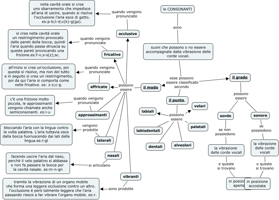 Questa Mappa Concettuale ha informazioni correlate a: le consonanti, occlusive quando vengono pronunciate nella cavità orale si crea uno sbarramento che impedisce all'aria di uscire, quando si risolve l'occlusione l'aria esce di getto. es:p-b;t-d;c(k)-g(ga)., il grado possono essere sorde, il modo possono essere vibranti, il modo possono essere approssimanti, il modo possono essere fricative, il punto possono essere labiodentali, il modo possono essere affricate, suoni che possono o no essere accompagnate dalla vibrazione delle corde vocali. esse possono essere classificate secondo il grado, il modo possono essere laterali, sorde se non possiedono la vibrazione delle corde vocali, la vibrazione delle corde vocali e queste si trovano in posizione accostata, il modo possono essere nasali, affricate quando vengono pronunciate all'inizio si crea un'occlusione, poi questa si risolve, ma non del tutto e in seguito si crea un restringimento, poi da qui l'aria si comporta come nelle fricative. es: z-z;c-g., il punto possono essere palatali, il punto possono essere alveolari, fricative quando vengono pronunciate si crea nella cavità orale un restringimento provocato dalle pareti della bocca, quindi l'aria quando passa struscia su queste pareti provocando una frizione.es:f-v;s-s(z);sc., laterali vengono prodotte bloccando l'aria con la lingua contro la volta palatina. L'aria tuttavia esce dalla bocca fuoriuscendo dai lati della lingua.es:l-gl, suoni che possono o no essere accompagnate dalla vibrazione delle corde vocali. esse possono essere classificate secondo il modo, il punto possono essere dentali, il modo possono essere occlusive
