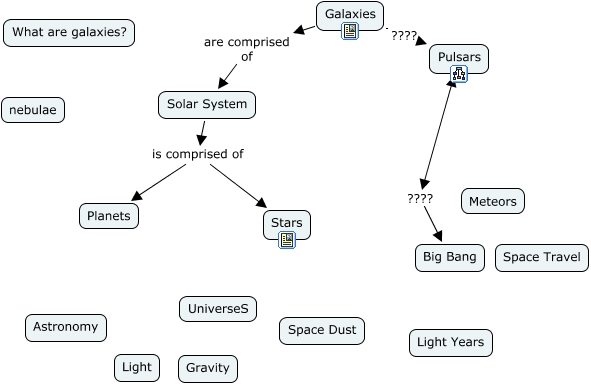 This Concept Map, created with IHMC CmapTools, has information related to: Galaxies group, Solar System is comprised of Stars, Pulsars ???? Big Bang, Galaxies ???? Pulsars, Galaxies are comprised of Solar System, Solar System is comprised of Planets