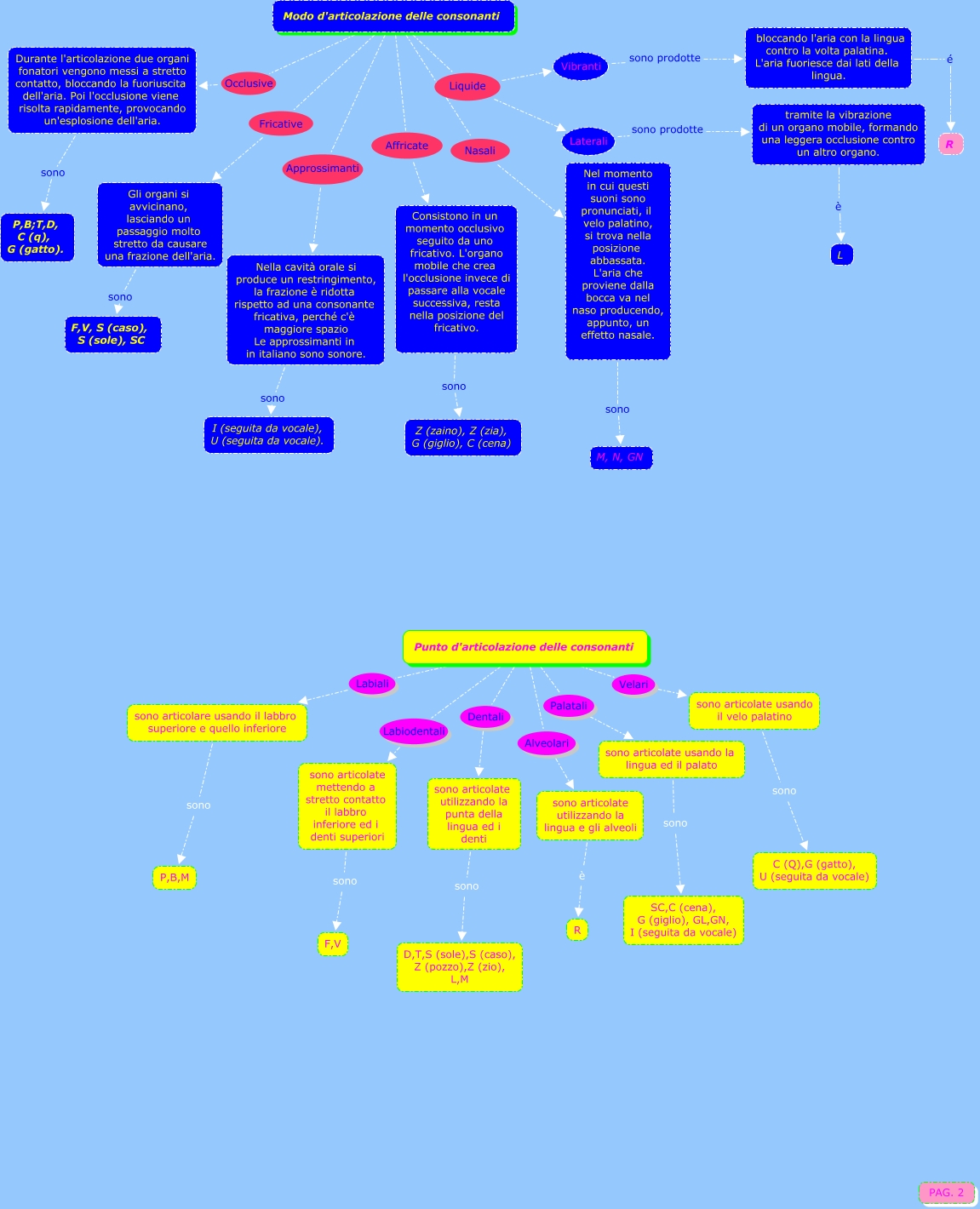 Questa Cmap, creata con IHMC CmapTools, contiene informazioni relative a: la fonologiadell'italiano Pag.2, Modo d'articolazione delle consonanti Occlusive Durante l'articolazione due organi fonatori vengono messi a stretto contatto, bloccando la fuoriuscita dell'aria. Poi l'occlusione viene risolta rapidamente, provocando un'esplosione dell'aria., Consistono in un momento occlusivo seguito da uno fricativo. L'organo mobile che crea l'occlusione invece di passare alla vocale successiva, resta nella posizione del fricativo. sono Z (zaino), Z (zia), G (giglio), C (cena), Punto d'articolazione delle consonanti Labiali sono articolare usando il labbro superiore e quello inferiore, bloccando l'aria con la lingua contro la volta palatina. L'aria fuoriesce dai lati della lingua. é R, Modo d'articolazione delle consonanti Approssimanti Nella cavità orale si produce un restringimento, la frazione è ridotta rispetto ad una consonante fricativa, perché c'è maggiore spazio Le approssimanti in in italiano sono sonore., Modo d'articolazione delle consonanti Liquide Vibranti, Punto d'articolazione delle consonanti Velari sono articolate usando il velo palatino, Punto d'articolazione delle consonanti Labiodentali sono articolate mettendo a stretto contatto il labbro inferiore ed i denti superiori, Punto d'articolazione delle consonanti Dentali sono articolate utilizzando la punta della lingua ed i denti, Punto d'articolazione delle consonanti Alveolari sono articolate utilizzando la lingua e gli alveoli, Punto d'articolazione delle consonanti Palatali sono articolate usando la lingua ed il palato, sono articolare usando il labbro superiore e quello inferiore sono P,B,M, Vibranti sono prodotte bloccando l'aria con la lingua contro la volta palatina. L'aria fuoriesce dai lati della lingua., sono articolate utilizzando la lingua e gli alveoli è R, Laterali sono prodotte tramite la vibrazione di un organo mobile, formando una leggera occlusione contro un altro organo., Gli organi si avvicinano, lasciando un passaggio molto stretto da causare una frazione dell'aria. sono F,V, S (caso), S (sole), SC, tramite la vibrazione di un organo mobile, formando una leggera occlusione contro un altro organo. è L, sono articolate usando il velo palatino sono C (Q),G (gatto), U (seguita da vocale), Modo d'articolazione delle consonanti Affricate Consistono in un momento occlusivo seguito da uno fricativo. L'organo mobile che crea l'occlusione invece di passare alla vocale successiva, resta nella posizione del fricativo., Modo d'articolazione delle consonanti Fricative Gli organi si avvicinano, lasciando un passaggio molto stretto da causare una frazione dell'aria.