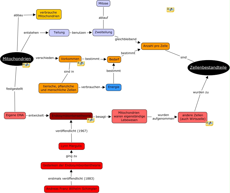 This Concept Map, created with IHMC CmapTools, has information related to: Mitochondrien, Endosymbiontensetheorie besagt Mitochondrien waren eigenständige Lebewesen, Mitochondrien verschieden Vorkommen, Anzahl pro Zelle sind Zellenbestandteile, Mitose ablauf Zweiteilung, Eigene DNA entwickelt Endosymbiontensetheorie, Mitochondrien abbau verbrauche Mitochondrien, Mitochondrien entstehen Teilung, tierische, pflanzliche und menschliche Zellen verbrauchen Energie, andere Zellen (auch Wirtszelle) wurden zu Zellenbestandteile, Bedarf bestimmt Anzahl pro Zelle, Mitochondrien waren eigenständige Lebewesen wurden aufgenommen andere Zellen (auch Wirtszelle), Gedanken der Endosymbiontentheorie ging zu Lynn Margulis, Lynn Margulis veröffendlicht (1967) Endosymbiontensetheorie, Teilung benutzen Zweiteilung, Vorkommen bestimmt Bedarf, Energie bestimmt Bedarf, Vorkommen sind in tierische, pflanzliche und menschliche Zellen, Mitochondrien festgestellt Eigene DNA, Andreas Franz Wilhelm Schimpler erstmals veröffendlicht (1883) Gedanken der Endosymbiontentheorie, Zweiteilung gleichbleibend Anzahl pro Zelle