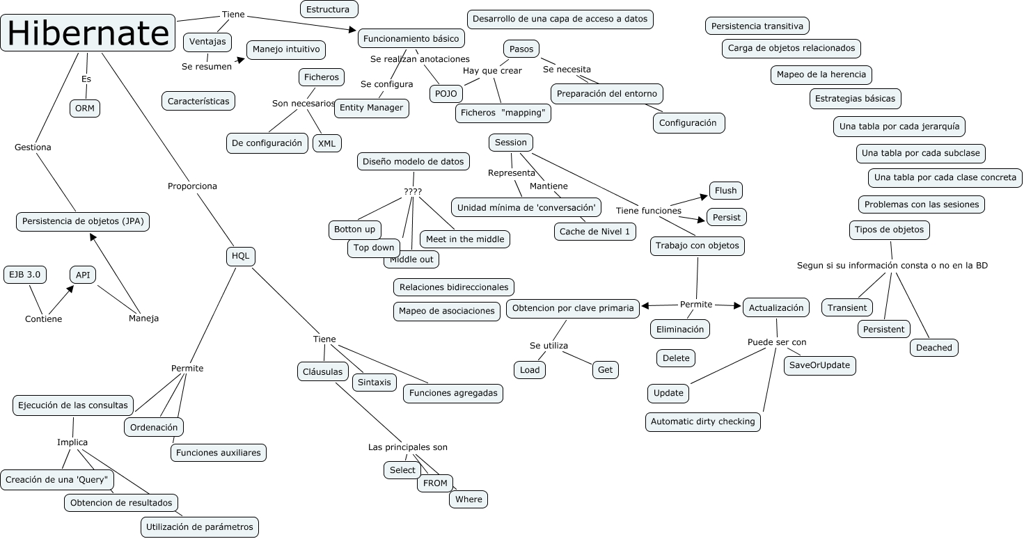 Este mapa conceptual tiene información relacionada a: map031207, Ejecución de las consultas Implica Creación de una 'Query", Trabajo con objetos Permite Actualización, Tipos de objetos Segun si su información consta o no en la BD Transient, Ficheros Son necesarios De configuración, Ficheros Son necesarios XML, Trabajo con objetos Permite Obtencion por clave primaria, Session Tiene funciones Persist, Ejecución de las consultas Implica Obtencion de resultados, Session Tiene funciones Flush, HQL Tiene Cláusulas