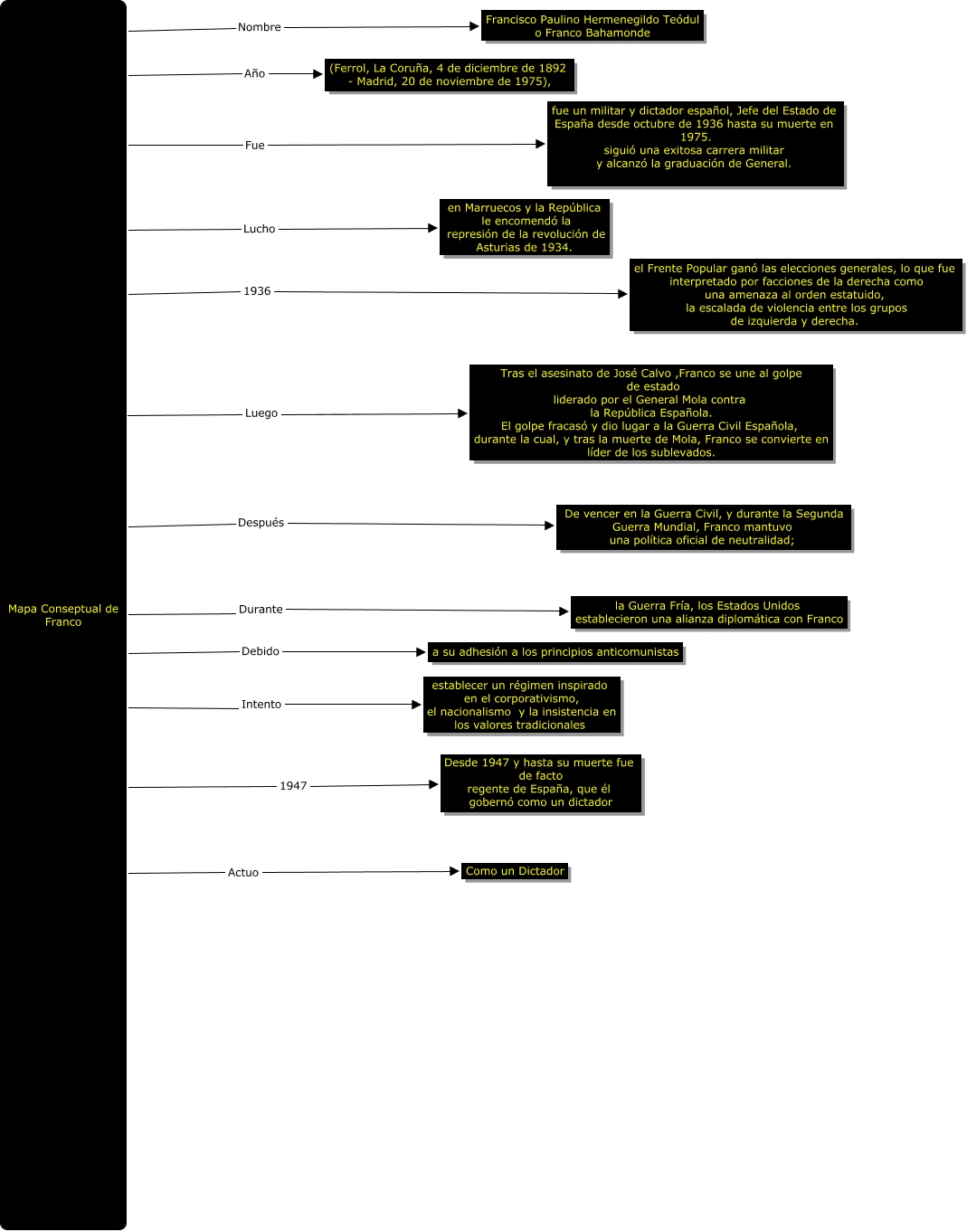 Este mapa conceptual tiene información relacionada a: 13.Daniela moran olvera. franco, Mapa Conseptual de Franco Actuo Como un Dictador, Mapa Conseptual de Franco Durante la Guerra Fría, los Estados Unidos establecieron una alianza diplomática con Franco, Mapa Conseptual de Franco Debido a su adhesión a los principios anticomunistas, Mapa Conseptual de Franco Después De vencer en la Guerra Civil, y durante la Segunda Guerra Mundial, Franco mantuvo una política oficial de neutralidad;, Mapa Conseptual de Franco Fue fue un militar y dictador español, Jefe del Estado de España desde octubre de 1936 hasta su muerte en 1975. siguió una exitosa carrera militar y alcanzó la graduación de General., Mapa Conseptual de Franco Intento establecer un régimen inspirado en el corporativismo, el nacionalismo y la insistencia en los valores tradicionales, Mapa Conseptual de Franco Año (Ferrol, La Coruña, 4 de diciembre de 1892 - Madrid, 20 de noviembre de 1975),, Mapa Conseptual de Franco 1936 el Frente Popular ganó las elecciones generales, lo que fue interpretado por facciones de la derecha como una amenaza al orden estatuido, la escalada de violencia entre los grupos de izquierda y derecha., Mapa Conseptual de Franco Lucho en Marruecos y la República le encomendó la represión de la revolución de Asturias de 1934., Mapa Conseptual de Franco Luego Tras el asesinato de José Calvo ,Franco se une al golpe de estado liderado por el General Mola contra la República Española. El golpe fracasó y dio lugar a la Guerra Civil Española, durante la cual, y tras la muerte de Mola, Franco se convierte en líder de los sublevados.