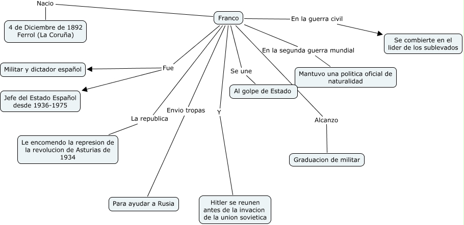 Este mapa conceptual tiene información relacionada a: 13.Carmelo Forenell Diaz.Franco, Franco Fue Militar y dictador español, Franco Alcanzo Graduacion de militar, Franco Fue Jefe del Estado Español desde 1936-1975, Franco En la segunda guerra mundial Mantuvo una politica oficial de naturalidad, Franco Y Hitler se reunen antes de la invacion de la union sovietica, Franco Se une Al golpe de Estado, Franco Nacio 4 de Diciembre de 1892 Ferrol (La Coruña), Franco Envio tropas Para ayudar a Rusia, Franco En la guerra civil Se combierte en el lider de los sublevados, Franco La republica Le encomendo la represion de la revolucion de Asturias de 1934