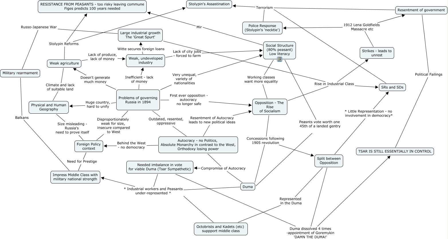 This Concept Map has information related to: map10December, Social Structure (80% peasant) Low literacy Working classes want more equality Opposition - The Rise of Socialism, Problems of governing Russia in 1894 Inefficient - lack of money Weak, undeveloped industry, Weak agriculture Stolypin Reforms RESISTANCE FROM PEASANTS - too risky leaving commune Figes predicts 100 years needed, Split between Opposition Duma dissolved 4 times -appointment of Goremykin 'DAMN THE DUMA!' TSAR IS STILL ESSENTIALLY IN CONTROL, Opposition - The Rise of Socialism Concessions following 1905 revolution Split between Opposition, Weak agriculture Stolypin Reforms Stolypin's Assastination, Opposition - The Rise of Socialism Rise in Industrial Class Strikes - leads to unrest, Weak, undeveloped industry Witte secures foreign loans Large industrial growth The 'Great Spurt', SRs and SDs Terrorism Police Response (Stolypin's 'necktie'), Autocracy - no Politics, Absolute Monarchy in contrast to the West, Orthodoxy losing power Compromise of Autocracy Duma