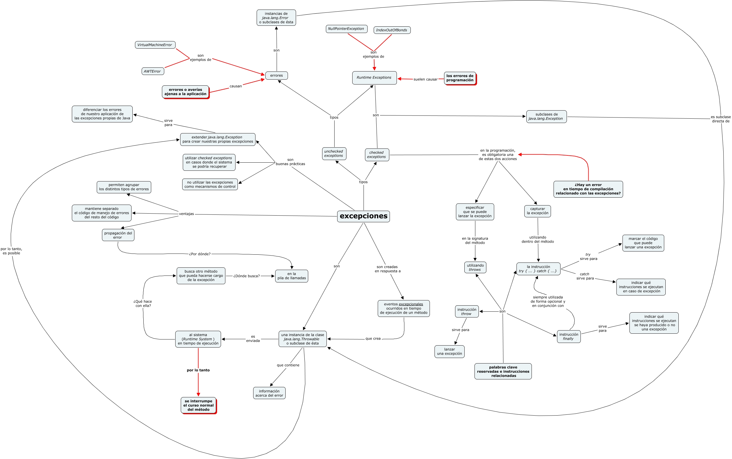 Este mapa conceptual tiene información relacionada a: excepciones, ¿Hay un error en tiempo de compilación relacionado con las excepciones? en la programación, es obligatoria una de estas dos acciones especificar que se puede lanzar la excepción, una instancia de la clase java.lang.Throwable o subclase de ésta que contiene información acerca del error, instancias de java.lang.Error o subclases de ésta es subclase directa de una instancia de la clase java.lang.Throwable o subclase de ésta, excepciones son buenas prácticas extender java.lang.Exception para crear nuestras propias excepciones, los errores de programación suelen causar Runtime Exceptions, excepciones ventajas permiten agrupar los distintos tipos de errores, AWTError son ejemplos de errores, al sistema (Runtime System) en tiempo de ejecución ¿Qué hace con ella? busca otro método que pueda hacerse cargo de la excepción, palabras clave reservadas e instrucciones relacionadas son utilizando throws, unchecked exceptions tipos errores