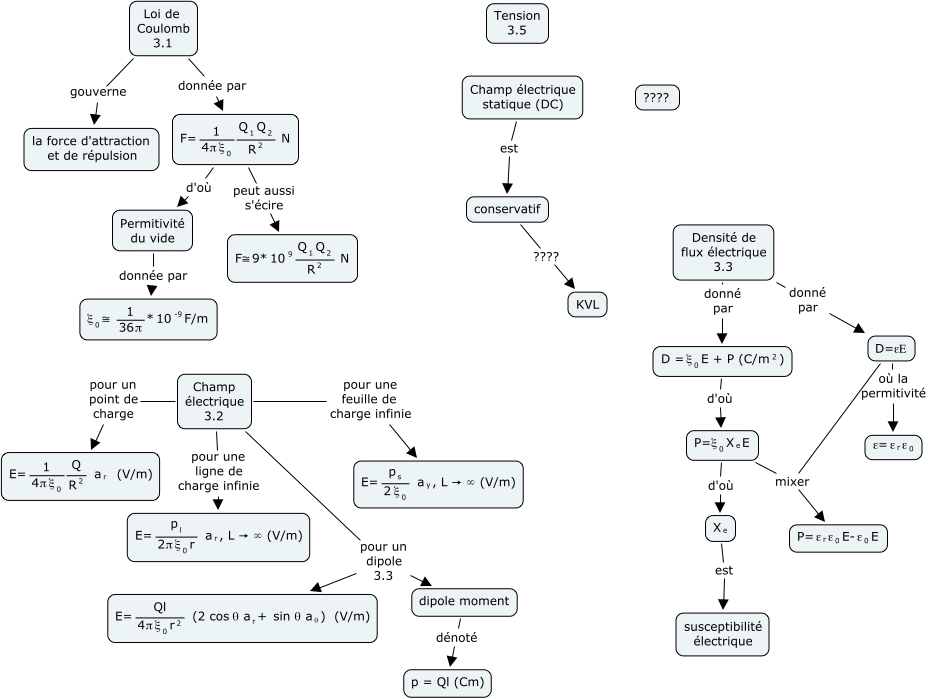 This Concept Map, created with IHMC CmapTools, has information related to: EM_Chap03, <math xmlns="http://www.w3.org/1998/Math/MathML"> <mmultiscripts> <mrow> <mtext> D = </mtext> <mtext> ξ </mtext> </mrow> <mtext> 0 </mtext> <none/> </mmultiscripts> <mtext> E + P (C/ </mtext> <mmultiscripts> <mtext> m </mtext> <none/> <mtext> 2 </mtext> </mmultiscripts> <mtext> ) </mtext> </math> d'où <math xmlns="http://www.w3.org/1998/Math/MathML"> <mrow> <mmultiscripts> <mtext> P=ξ </mtext> <mtext> 0 </mtext> <none/> </mmultiscripts> <mmultiscripts> <mtext> X </mtext> <mtext> e </mtext> <none/> </mmultiscripts> <mtext> E </mtext> </mrow> </math>, Champ électrique 3.2 pour un dipole 3.3 dipole moment, Densité de flux électrique 3.3 donné par <math xmlns="http://www.w3.org/1998/Math/MathML"> <mmultiscripts> <mrow> <mtext> D = </mtext> <mtext> ξ </mtext> </mrow> <mtext> 0 </mtext> <none/> </mmultiscripts> <mtext> E + P (C/ </mtext> <mmultiscripts> <mtext> m </mtext> <none/> <mtext> 2 </mtext> </mmultiscripts> <mtext> ) </mtext> </math>, <math xmlns="http://www.w3.org/1998/Math/MathML"> <mrow> <mmultiscripts> <mtext> P=ξ </mtext> <mtext> 0 </mtext> <none/> </mmultiscripts> <mmultiscripts> <mtext> X </mtext> <mtext> e </mtext> <none/> </mmultiscripts> <mtext> E </mtext> </mrow> </math> mixer <math xmlns="http://www.w3.org/1998/Math/MathML"> <mrow> <mtext> P= </mtext> <mmultiscripts> <mtext> ε </mtext> <mtext> r </mtext> <none/> </mmultiscripts> <mrow> <mmultiscripts> <mtext> ε </mtext> <mtext> 0 </mtext> <none/> </mmultiscripts> <mtext> E- </mtext> <mrow> <mmultiscripts> <mtext> ε </mtext> <mtext> 0 </mtext> <none/> </mmultiscripts> <mtext> E </mtext> </mrow> </mrow> </mrow> </math>, Champ électrique statique (DC) est conservatif, <math xmlns="http://www.w3.org/1998/Math/MathML"> <mrow> <mmultiscripts> <mtext> P=ξ </mtext> <mtext> 0 </mtext> <none/> </mmultiscripts> <mmultiscripts> <mtext> X </mtext> <mtext> e </mtext> <none/> </mmultiscripts> <mtext> E </mtext> </mrow> </math> d'où <math xmlns="http://www.w3.org/1998/Math/MathML"> <mrow> <mmultiscripts> <mtext> X </mtext> <mtext> e </mtext> <none/> </mmultiscripts> </mrow> </math>, D=εE mixer <math xmlns="http://www.w3.org/1998/Math/MathML"> <mrow> <mtext> P= </mtext> <mmultiscripts> <mtext> ε </mtext> <mtext> r </mtext> <none/> </mmultiscripts> <mrow> <mmultiscripts> <mtext> ε </mtext> <mtext> 0 </mtext> <none/> </mmultiscripts> <mtext> E- </mtext> <mrow> <mmultiscripts> <mtext> ε </mtext> <mtext> 0 </mtext> <none/> </mmultiscripts> <mtext> E </mtext> </mrow> </mrow> </mrow> </math>, D=εE où la permitivité <math xmlns="http://www.w3.org/1998/Math/MathML"> <mrow> <mtext> ε= </mtext> <mmultiscripts> <mtext> ε </mtext> <mtext> r </mtext> <none/> </mmultiscripts> <mrow> <mmultiscripts> <mtext> ε </mtext> <mtext> 0 </mtext> <none/> </mmultiscripts> </mrow> </mrow> </math>, Champ électrique 3.2 pour une ligne de charge infinie <math xmlns="http://www.w3.org/1998/Math/MathML"> <mrow> <mtext> E= </mtext> <mfrac> <mmultiscripts> <mtext> p </mtext> <mtext> l </mtext> <none/> </mmultiscripts> <mrow> <mtext> 2π </mtext> <mmultiscripts> <mtext> ξ </mtext> <mtext> 0 </mtext> <none/> </mmultiscripts> <mtext> r </mtext> </mrow> </mfrac> <mtext> </mtext> <mmultiscripts> <mtext> a </mtext> <mtext> r </mtext> <none/> </mmultiscripts> <mtext> , L → ∞ (V/m) </mtext> </mrow> </math>, <math xmlns="http://www.w3.org/1998/Math/MathML"> <mrow> <mtext> F= </mtext> <mfrac> <mtext> 1 </mtext> <mrow> <mtext> 4π </mtext> <mmultiscripts> <mtext> ξ </mtext> <mtext> 0 </mtext> <none/> </mmultiscripts> </mrow> </mfrac> <mfrac> <mrow> <mmultiscripts> <mtext> Q </mtext> <mtext> 1 </mtext> <none/> </mmultiscripts> <mmultiscripts> <mtext> Q </mtext> <mtext> 2 </mtext> <none/> </mmultiscripts> </mrow> <mmultiscripts> <mtext> R </mtext> <none/> <mtext> 2 </mtext> </mmultiscripts> </mfrac> <mtext> N </mtext> </mrow> </math> d'où Permitivité du vide, Densité de flux électrique 3.3 donné par D=εE, Loi de Coulomb 3.1 gouverne la force d'attraction et de répulsion, dipole moment dénoté p = Ql (Cm), Loi de Coulomb 3.1 donnée par <math xmlns="http://www.w3.org/1998/Math/MathML"> <mrow> <mtext> F= </mtext> <mfrac> <mtext> 1 </mtext> <mrow> <mtext> 4π </mtext> <mmultiscripts> <mtext> ξ </mtext> <mtext> 0 </mtext> <none/> </mmultiscripts> </mrow> </mfrac> <mfrac> <mrow> <mmultiscripts> <mtext> Q </mtext> <mtext> 1 </mtext> <none/> </mmultiscripts> <mmultiscripts> <mtext> Q </mtext> <mtext> 2 </mtext> <none/> </mmultiscripts> </mrow> <mmultiscripts> <mtext> R </mtext> <none/> <mtext> 2 </mtext> </mmultiscripts> </mfrac> <mtext> N </mtext> </mrow> </math>, <math xmlns="http://www.w3.org/1998/Math/MathML"> <mrow> <mtext> F= </mtext> <mfrac> <mtext> 1 </mtext> <mrow> <mtext> 4π </mtext> <mmultiscripts> <mtext> ξ </mtext> <mtext> 0 </mtext> <none/> </mmultiscripts> </mrow> </mfrac> <mfrac> <mrow> <mmultiscripts> <mtext> Q </mtext> <mtext> 1 </mtext> <none/> </mmultiscripts> <mmultiscripts> <mtext> Q </mtext> <mtext> 2 </mtext> <none/> </mmultiscripts> </mrow> <mmultiscripts> <mtext> R </mtext> <none/> <mtext> 2 </mtext> </mmultiscripts> </mfrac> <mtext> N </mtext> </mrow> </math> peut aussi s'écire <math xmlns="http://www.w3.org/1998/Math/MathML"> <mrow> <mtext> F≅ </mtext> <mrow> <mtext> 9* </mtext> <mmultiscripts> <mtext> 10 </mtext> <none/> <mtext> 9 </mtext> </mmultiscripts> </mrow> <mfrac> <mrow> <mmultiscripts> <mtext> Q </mtext> <mtext> 1 </mtext> <none/> </mmultiscripts> <mmultiscripts> <mtext> Q </mtext> <mtext> 2 </mtext> <none/> </mmultiscripts> </mrow> <mmultiscripts> <mtext> R </mtext> <none/> <mtext> 2 </mtext> </mmultiscripts> </mfrac> <mtext> N </mtext> </mrow> </math>, <math xmlns="http://www.w3.org/1998/Math/MathML"> <mrow> <mmultiscripts> <mtext> X </mtext> <mtext> e </mtext> <none/> </mmultiscripts> </mrow> </math> est susceptibilité électrique, Permitivité du vide donnée par <math xmlns="http://www.w3.org/1998/Math/MathML"> <mmultisc