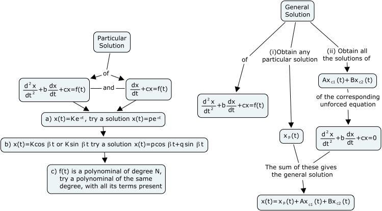 This Concept Map, created with IHMC CmapTools, has information related to: JS_Chap19, <math xmlns="http://www.w3.org/1998/Math/MathML"> <mrow> <mfrac> <mrow> <mmultiscripts> <mtext> d </mtext> <none/> <mtext> 2 </mtext> </mmultiscripts> <mtext> x </mtext> </mrow> <mmultiscripts> <mtext> dt </mtext> <none/> <mtext> 2 </mtext> </mmultiscripts> </mfrac> <mtext> +b </mtext> <mfrac> <mtext> dx </mtext> <mtext> dt </mtext> </mfrac> <mtext> +cx=0 </mtext> </mrow> </math> The sum of these gives the general solution <math xmlns="http://www.w3.org/1998/Math/MathML"> <mrow> <mtext> x(t)= </mtext> <mmultiscripts> <mrow> <mrow> <mmultiscripts> <mtext> x </mtext> <mtext> p </mtext> <none/> </mmultiscripts> <mtext> (t)+ </mtext> </mrow> <mtext> Ax </mtext> </mrow> <mtext> c1 </mtext> <none/> </mmultiscripts> <mtext> (t)+ </mtext> <mrow> <mmultiscripts> <mtext> Bx </mtext> <mtext> c2 </mtext> <none/> </mmultiscripts> <mtext> (t) </mtext> </mrow> </mrow> </math>, General Solution of <math xmlns="http://www.w3.org/1998/Math/MathML"> <mrow> <mfrac> <mrow> <mmultiscripts> <mtext> d </mtext> <none/> <mtext> 2 </mtext> </mmultiscripts> <mtext> x </mtext> </mrow> <mmultiscripts> <mtext> dt </mtext> <none/> <mtext> 2 </mtext> </mmultiscripts> </mfrac> <mtext> +b </mtext> <mfrac> <mtext> dx </mtext> <mtext> dt </mtext> </mfrac> <mtext> +cx=f(t) </mtext> </mrow> </math>, Particular Solution of <math xmlns="http://www.w3.org/1998/Math/MathML"> <mrow> <mfrac> <mtext> dx </mtext> <mtext> dt </mtext> </mfrac> <mtext> +cx=f(t) </mtext> </mrow> </math>, <math xmlns="http://www.w3.org/1998/Math/MathML"> <mrow> <mrow> <mrow> <mtext> a) x(t)=K </mtext> <mmultiscripts> <mtext> e </mtext> <none/> <mtext> αt </mtext> </mmultiscripts> <mrow> <mtext> , try a solution x(t)=p </mtext> <mmultiscripts> <mtext> e </mtext> <none/> <mtext> αt </mtext> </mmultiscripts> </mrow> </mrow> </mrow> </mrow> </math> ???? <math xmlns="http://www.w3.org/1998/Math/MathML"> <mrow> <mrow> <mrow> <mtext> b) x(t)=K </mtext> <mrow> <mtext> cos </mtext> <mtext> β </mtext> <mtext> t or K </mtext> <mtext> sin </mtext> <mtext> β </mtext> <mtext> t try a solution </mtext> <mrow> <mrow> <mrow> <mtext> x(t)=p </mtext> <mrow> <mtext> cos </mtext> <mtext> β </mtext> <mtext> t+q </mtext> <mtext> sin </mtext> <mtext> β </mtext> <mtext> t </mtext> </mrow> </mrow> </mrow> </mrow> </mrow> </mrow> </mrow> </mrow> </math>, <math xmlns="http://www.w3.org/1998/Math/MathML"> <mrow> <mmultiscripts> <mtext> x </mtext> <mtext> p </mtext> <none/> </mmultiscripts> <mtext> (t) </mtext> </mrow> </math> The sum of these gives the general solution <math xmlns="http://www.w3.org/1998/Math/MathML"> <mrow> <mtext> x(t)= </mtext> <mmultiscripts> <mrow> <mrow> <mmultiscripts> <mtext> x </mtext> <mtext> p </mtext> <none/> </mmultiscripts> <mtext> (t)+ </mtext> </mrow> <mtext> Ax </mtext> </mrow> <mtext> c1 </mtext> <none/> </mmultiscripts> <mtext> (t)+ </mtext> <mrow> <mmultiscripts> <mtext> Bx </mtext> <mtext> c2 </mtext> <none/> </mmultiscripts> <mtext> (t) </mtext> </mrow> </mrow> </math>, <math xmlns="http://www.w3.org/1998/Math/MathML"> <mrow> <mfrac> <mtext> dx </mtext> <mtext> dt </mtext> </mfrac> <mtext> +cx=f(t) </mtext> </mrow> </math> ???? <math xmlns="http://www.w3.org/1998/Math/MathML"> <mrow> <mrow> <mrow> <mtext> a) x(t)=K </mtext> <mmultiscripts> <mtext> e </mtext> <none/> <mtext> αt </mtext> </mmultiscripts> <mrow> <mtext> , try a solution x(t)=p </mtext> <mmultiscripts> <mtext> e </mtext> <none/> <mtext> αt </mtext> </mmultiscripts> </mrow> </mrow> </mrow> </mrow> </math>, <math xmlns="http://www.w3.org/1998/Math/MathML"> <mrow> <mmultiscripts> <mtext> Ax </mtext> <mtext> c1 </mtext> <none/> </mmultiscripts> <mtext> (t)+ </mtext> <mrow> <mmultiscripts> <mtext> Bx </mtext> <mtext> c2 </mtext> <none/> </mmultiscripts> <mtext> (t) </mtext> </mrow> </mrow> </math> of the corresponding unforced equation <math xmlns="http://www.w3.org/1998/Math/MathML"> <mrow> <mfrac> <mrow> <mmultiscripts> <mtext> d </mtext> <none/> <mtext> 2 </mtext> </mmultiscripts> <mtext> x </mtext> </mrow> <mmultiscripts> <mtext> dt </mtext> <none/> <mtext> 2 </mtext> </mmultiscripts> </mfrac> <mtext> +b </mtext> <mfrac> <mtext> dx </mtext> <mtext> dt </mtext> </mfrac> <mtext> +cx=0 </mtext> </mrow> </math>, Particular Solution of <math xmlns="http://www.w3.org/1998/Math/MathML"> <mrow> <mfrac> <mrow> <mmultiscripts> <mtext> d </mtext> <none/> <mtext> 2 </mtext> </mmultiscripts> <mtext> x </mtext> </mrow> <mmultiscripts> <mtext> dt </mtext> <none/> <mtext> 2 </mtext> </mmultiscripts> </mfrac> <mtext> +b </mtext> <mfrac> <mtext> dx </mtext> <mtext> dt </mtext> </mfrac> <mtext> +cx=f(t) </mtext> </mrow> </math>, <math xmlns="http://www.w3.org/1998/Math/MathML"> <mrow> <mfrac> <mrow> <mmultiscripts> <mtext> d </mtext> <none/> <mtext> 2 </mtext> </mmultiscripts> <mtext> x </mtext> </mrow> <mmultiscripts> <mtext> dt </mtext> <none/> <mtext> 2 </mtext> </mmultiscripts> </mfrac> <mtext> +b </mtext> <mfrac> <mtext> dx </mtext> <mtext> dt </mtext> </mfrac> <mtext> +cx=f(t) </mtext> </mrow> </math> ???? <math xmlns="http://www.w3.org/1998/Math/MathML"> <mrow> <mrow> <mrow> <mtext> a) x(t)=K </mtext> <mmultiscripts> <mtext> e </mtext> <none/> <mtext> αt </mtext> </mmultiscripts> <mrow> <mtext> , try a solution x(t)=p </mtext> <mmultiscripts> <mtext> e </mtext> <none/> <mtext> αt </mtext> </mmultiscripts> </mrow> </mrow> </mrow> </mrow> </math>, General Solution (ii) Obtain all the solutions of <math xmlns="http://www.w3.org/1998/Math/MathML"> <mrow> <mmultiscripts> <mtext> Ax </mtext> <mtext> c1 </mtext> <none/> </mmultiscripts> <mtext> (t)+ </mtext> <mrow> <mmultiscripts> <mtext> Bx </mtext> <mtext> c2 </mtext> <none/> </mmultiscripts> <mtext> (t) </mtext> </mrow> </mrow> </math>, <math xmlns="http://www.w3.org/1998/Math/MathML"> <mrow> <mrow> <mrow> <mtext> b) x(t)=K </mtext> <mrow> <mtext> cos </mtext> <mtext> β </mtext> <mtext> t or K </mtext> <mtext> sin </mtext> <mtext> β </mtext> <mtext> t t