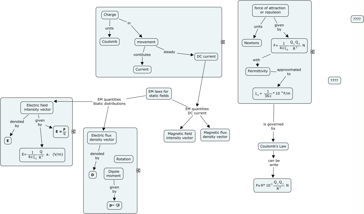 This Concept Map, created with IHMC CmapTools, has information related to: EM_Chap03_1, <math xmlns="http://www.w3.org/1998/Math/MathML"> <mrow> <mtext> F= </mtext> <mfrac> <mtext> 1 </mtext> <mrow> <mtext> 4π </mtext> <mmultiscripts> <mtext> ξ </mtext> <mtext> 0 </mtext> <none/> </mmultiscripts> </mrow> </mfrac> <mfrac> <mrow> <mmultiscripts> <mtext> Q </mtext> <mtext> 1 </mtext> <none/> </mmultiscripts> <mmultiscripts> <mtext> Q </mtext> <mtext> 2 </mtext> <none/> </mmultiscripts> </mrow> <mmultiscripts> <mtext> R </mtext> <none/> <mtext> 2 </mtext> </mmultiscripts> </mfrac> <mtext> N </mtext> </mrow> </math> with Permittivity, Electric field intensity vector given by <math xmlns="http://www.w3.org/1998/Math/MathML"> <mrow> <mtext> E = </mtext> <mfrac> <mtext> F </mtext> <mtext> q </mtext> </mfrac> </mrow> </math>, movement contitutes Current, force of attraction or repulsion given by <math xmlns="http://www.w3.org/1998/Math/MathML"> <mrow> <mtext> F= </mtext> <mfrac> <mtext> 1 </mtext> <mrow> <mtext> 4π </mtext> <mmultiscripts> <mtext> ξ </mtext> <mtext> 0 </mtext> <none/> </mmultiscripts> </mrow> </mfrac> <mfrac> <mrow> <mmultiscripts> <mtext> Q </mtext> <mtext> 1 </mtext> <none/> </mmultiscripts> <mmultiscripts> <mtext> Q </mtext> <mtext> 2 </mtext> <none/> </mmultiscripts> </mrow> <mmultiscripts> <mtext> R </mtext> <none/> <mtext> 2 </mtext> </mmultiscripts> </mfrac> <mtext> N </mtext> </mrow> </math>, DC current EM quantities DC current Magnetic field intensity vector, EM laws for static fields EM quantities DC current Magnetic flux density vector, Electric field intensity vector given by <math xmlns="http://www.w3.org/1998/Math/MathML"> <mrow> <mtext> E= </mtext> <mfrac> <mtext> 1 </mtext> <mrow> <mtext> 4π </mtext> <mmultiscripts> <mtext> ξ </mtext> <mtext> 0 </mtext> <none/> </mmultiscripts> </mrow> </mfrac> <mfrac> <mtext> Q </mtext> <mmultiscripts> <mtext> R </mtext> <none/> <mtext> 2 </mtext> </mmultiscripts> </mfrac> <mtext> </mtext> <mmultiscripts> <mtext> a </mtext> <mtext> r </mtext> <none/> </mmultiscripts> <mtext> (V/m) </mtext> </mrow> </math>, Coulomb's Law can be write <math xmlns="http://www.w3.org/1998/Math/MathML"> <mrow> <mtext> F≅ </mtext> <mrow> <mtext> 9* </mtext> <mmultiscripts> <mtext> 10 </mtext> <none/> <mtext> 9 </mtext> </mmultiscripts> </mrow> <mfrac> <mrow> <mmultiscripts> <mtext> Q </mtext> <mtext> 1 </mtext> <none/> </mmultiscripts> <mmultiscripts> <mtext> Q </mtext> <mtext> 2 </mtext> <none/> </mmultiscripts> </mrow> <mmultiscripts> <mtext> R </mtext> <none/> <mtext> 2 </mtext> </mmultiscripts> </mfrac> <mtext> N </mtext> </mrow> </math>, Electric flux density vector denoted by D, EM laws for static fields EM quantities Static distributions Electric field intensity vector, force of attraction or repulsion units Newtons, movement steady DC current, Charge units Coulomb, DC current EM quantities DC current Magnetic flux density vector, Electric field intensity vector denoted by E, Permittivity approximated to <math xmlns="http://www.w3.org/1998/Math/MathML"> <mmultiscripts> <mtext> ξ </mtext> <mtext> 0 </mtext> <none/> </mmultiscripts> <mtext> = </mtext> <mfrac> <mtext> 1 </mtext> <mrow> <mtext> 36π </mtext> </mrow> </mfrac> <mtext> * </mtext> <mmultiscripts> <mtext> 10 </mtext> <none/> <mtext> -9 </mtext> </mmultiscripts> <mtext> F/m </mtext> </math>, EM laws for static fields EM quantities Static distributions Electric flux density vector, EM laws for static fields EM quantities DC current Magnetic field intensity vector, Dipole moment given by p= Ql, force of attraction or repulsion is governed by Coulomb's Law