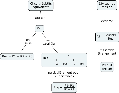 This Concept Map, created with IHMC CmapTools, has information related to: Electrical_engineering_chap2, <math xmlns="http://www.w3.org/1998/Math/MathML"> <mrow> <mtext> Vi = </mtext> <mfrac> <mtext> Vtot*Ri </mtext> <mtext> Req </mtext> </mfrac> </mrow> </math> ressemble étrangement Produit croisé!, Req en série Req = R1 + R2 + R3, Req en parallèle <math xmlns="http://www.w3.org/1998/Math/MathML"> <mrow> <mtext> Req = </mtext> <mfrac> <mtext> 1 </mtext> <mrow> <mtext> </mtext> <mfrac> <mtext> 1 </mtext> <mtext> R1 </mtext> </mfrac> <mtext> + </mtext> <mfrac> <mtext> 1 </mtext> <mtext> R2 </mtext> </mfrac> <mtext> + </mtext> <mfrac> <mtext> 1 </mtext> <mtext> R3 </mtext> </mfrac> <mtext> + </mtext> <mfrac> <mtext> 1 </mtext> <mtext> R4 </mtext> </mfrac> </mrow> </mfrac> </mrow> </math>, Diviseur de tension exprimé <math xmlns="http://www.w3.org/1998/Math/MathML"> <mrow> <mtext> Vi = </mtext> <mfrac> <mtext> Vtot*Ri </mtext> <mtext> Req </mtext> </mfrac> </mrow> </math>, Circuit résistifs équivalents utiliser Req, <math xmlns="http://www.w3.org/1998/Math/MathML"> <mrow> <mtext> Req = </mtext> <mfrac> <mtext> 1 </mtext> <mrow> <mtext> </mtext> <mfrac> <mtext> 1 </mtext> <mtext> R1 </mtext> </mfrac> <mtext> + </mtext> <mfrac> <mtext> 1 </mtext> <mtext> R2 </mtext> </mfrac> <mtext> + </mtext> <mfrac> <mtext> 1 </mtext> <mtext> R3 </mtext> </mfrac> <mtext> + </mtext> <mfrac> <mtext> 1 </mtext> <mtext> R4 </mtext> </mfrac> </mrow> </mfrac> </mrow> </math> particulièrement pour 2 résistances <math xmlns="http://www.w3.org/1998/Math/MathML"> <mrow> <mtext> Req = </mtext> <mfrac> <mtext> R1*R2 </mtext> <mtext> R1+R2 </mtext> </mfrac> </mrow> </math>