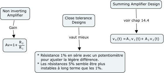 This Concept Map, created with IHMC CmapTools, has information related to: EE_Chap14, Non inverting Amplifier Gain <math xmlns="http://www.w3.org/1998/Math/MathML"> <mrow> <mtext> Av=1+ </mtext> <mfrac> <mmultiscripts> <mtext> R </mtext> <mtext> 2 </mtext> <none/> </mmultiscripts> <mrow> <mmultiscripts> <mtext> R </mtext> <mtext> 1 </mtext> <none/> </mmultiscripts> </mrow> </mfrac> </mrow> </math>, Summing Amplifier Design voir chap 14.4 <math xmlns="http://www.w3.org/1998/Math/MathML"> <mrow> <mmultiscripts> <mtext> v </mtext> <mtext> 0 </mtext> <none/> </mmultiscripts> <mtext> (t) = </mtext> <mrow> <mmultiscripts> <mtext> A </mtext> <mtext> 1 </mtext> <none/> </mmultiscripts> <mrow> <mmultiscripts> <mtext> v </mtext> <mtext> 1 </mtext> <none/> </mmultiscripts> <mtext> (t) </mtext> </mrow> </mrow> <mrow> <mmultiscripts> <mtext> + A </mtext> <mtext> 2 </mtext> <none/> </mmultiscripts> </mrow> <mrow> <mmultiscripts> <mtext> v </mtext> <mtext> 2 </mtext> <none/> </mmultiscripts> <mtext> (t) </mtext> </mrow> <mtext> </mtext> </mrow> </math>, Close tolerance Designs vaut mieux * Résistance 1% en série avec un potentiomètre pour ajuster la légère différence. * Les résistances 5% semble être plus instables à long terme que les 1%.
