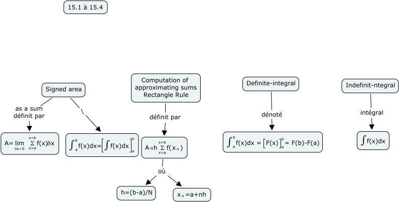 This Concept Map, created with IHMC CmapTools, has information related to: JS_Chap15, Indefinit-ntegral intégral <math xmlns="http://www.w3.org/1998/Math/MathML"> <mrow> <int/> <mtext> f(x)dx </mtext> </mrow> </math>, Signed area as a sum définit par <math xmlns="http://www.w3.org/1998/Math/MathML"> <mrow> <mrow> <mtext> A= </mtext> <munderover> <mtext> lim </mtext> <mtext> δx→0 </mtext> <none/> </munderover> <mtext> </mtext> </mrow> <munderover> <mtext> Σ </mtext> <mtext> x=a </mtext> <mtext> x=b </mtext> </munderover> <mtext> f(x)δx </mtext> </mrow> </math>, Definite-integral dénoté <math xmlns="http://www.w3.org/1998/Math/MathML"> <mrow> <mrow> <mmultiscripts> <int/> <mtext> a </mtext> <mtext> b </mtext> </mmultiscripts> <mtext> f(x)dx = </mtext> </mrow> <mmultiscripts> <mfenced open="[" close="]"> <mtext> F(x) </mtext> </mfenced> <mtext> a </mtext> <mtext> b </mtext> </mmultiscripts> <mtext> = F(b)-F(a) </mtext> </mrow> </math>, Signed area \ <math xmlns="http://www.w3.org/1998/Math/MathML"> <mrow> <mmultiscripts> <int/> <mtext> a </mtext> <mtext> b </mtext> </mmultiscripts> <mtext> f(x)dx= </mtext> <mmultiscripts> <mfenced open="[" close="]"> <mrow> <int/> <mtext> f(x)dx </mtext> </mrow> </mfenced> <mtext> a </mtext> <mtext> b </mtext> </mmultiscripts> </mrow> </math>, Computation of approximating sums Rectangle Rule définit par <math xmlns="http://www.w3.org/1998/Math/MathML"> <mrow> <mrow> <mtext> A </mtext> <mtext> ≈h </mtext> </mrow> <munderover> <mtext> Σ </mtext> <mtext> x=a </mtext> <mtext> x=b </mtext> </munderover> <mtext> f( </mtext> <mrow> <mmultiscripts> <mtext> x </mtext> <mtext> n </mtext> <none/> </mmultiscripts> </mrow> <mtext> ) </mtext> </mrow> </math>, <math xmlns="http://www.w3.org/1998/Math/MathML"> <mrow> <mrow> <mtext> A </mtext> <mtext> ≈h </mtext> </mrow> <munderover> <mtext> Σ </mtext> <mtext> x=a </mtext> <mtext> x=b </mtext> </munderover> <mtext> f( </mtext> <mrow> <mmultiscripts> <mtext> x </mtext> <mtext> n </mtext> <none/> </mmultiscripts> </mrow> <mtext> ) </mtext> </mrow> </math> où <math xmlns="http://www.w3.org/1998/Math/MathML"> <mrow> <mmultiscripts> <mtext> x </mtext> <mtext> n </mtext> <none/> </mmultiscripts> <mtext> =a+nh </mtext> </mrow> </math>, <math xmlns="http://www.w3.org/1998/Math/MathML"> <mrow> <mrow> <mtext> A </mtext> <mtext> ≈h </mtext> </mrow> <munderover> <mtext> Σ </mtext> <mtext> x=a </mtext> <mtext> x=b </mtext> </munderover> <mtext> f( </mtext> <mrow> <mmultiscripts> <mtext> x </mtext> <mtext> n </mtext> <none/> </mmultiscripts> </mrow> <mtext> ) </mtext> </mrow> </math> où h=(b-a)/N