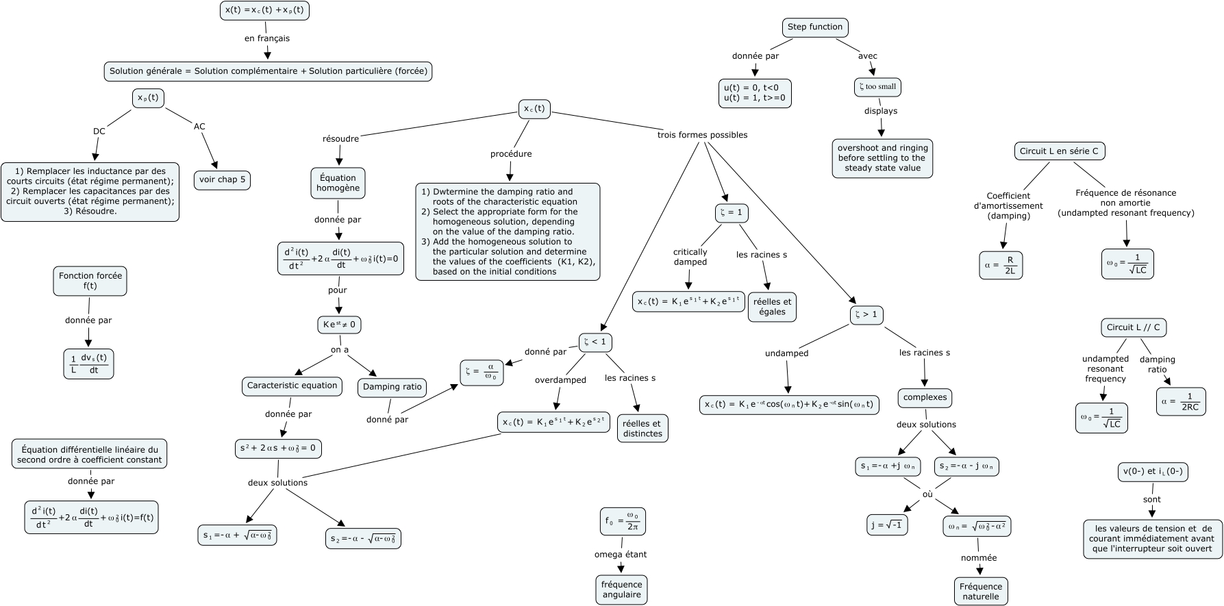 This Concept Map, created with IHMC CmapTools, has information related to: EE_Chap04, <math xmlns="http://www.w3.org/1998/Math/MathML"> <mrow> <mmultiscripts> <mtext> x </mtext> <mtext> p </mtext> <none/> </mmultiscripts> <mtext> (t) </mtext> </mrow> </math> DC 1) Remplacer les inductance par des courts circuits (état régime permanent); 2) Remplacer les capacitances par des circuit ouverts (état régime permanent); 3) Résoudre., <math xmlns="http://www.w3.org/1998/Math/MathML"> <mtext> ζ = 1 </mtext> </math> critically damped <math xmlns="http://www.w3.org/1998/Math/MathML"> <mrow> <mmultiscripts> <mtext> x </mtext> <mtext> c </mtext> <none/> </mmultiscripts> <mtext> (t) = </mtext> <mrow> <mmultiscripts> <mtext> K </mtext> <mtext> 1 </mtext> <none/> </mmultiscripts> <mmultiscripts> <mtext> e </mtext> <none/> <mrow> <mmultiscripts> <mtext> s </mtext> <mtext> 1 </mtext> <none/> </mmultiscripts> <mtext> t </mtext> </mrow> </mmultiscripts> <mtext> + </mtext> <mrow> <mmultiscripts> <mtext> K </mtext> <mtext> 2 </mtext> <none/> </mmultiscripts> <mmultiscripts> <mtext> e </mtext> <none/> <mrow> <mmultiscripts> <mtext> s </mtext> <mtext> 1 </mtext> <none/> </mmultiscripts> <mtext> t </mtext> </mrow> </mmultiscripts> </mrow> </mrow> </mrow> </math>, Step function avec ζ too small, <math xmlns="http://www.w3.org/1998/Math/MathML"> <mtext> ζ < 1 </mtext> </math> donné par <math xmlns="http://www.w3.org/1998/Math/MathML"> <mrow> <mtext> ζ = </mtext> <mfrac> <mtext> α </mtext> <mmultiscripts> <mtext> ω </mtext> <mtext> 0 </mtext> <none/> </mmultiscripts> </mfrac> </mrow> </math>, <math xmlns="http://www.w3.org/1998/Math/MathML"> <mrow> <mmultiscripts> <mtext> s </mtext> <mtext> 2 </mtext> <none/> </mmultiscripts> <mtext> =- </mtext> <mtext> α - j </mtext> <mmultiscripts> <mtext> ω </mtext> <mtext> n </mtext> <none/> </mmultiscripts> </mrow> </math> où <math xmlns="http://www.w3.org/1998/Math/MathML"> <mrow> <mmultiscripts> <mtext> ω </mtext> <mtext> n </mtext> <none/> </mmultiscripts> <mtext> = </mtext> <mrow> <msqrt> <mrow> <mmultiscripts> <mtext> ω </mtext> <mtext> 0 </mtext> <mtext> 2 </mtext> </mmultiscripts> <mtext> - </mtext> <mmultiscripts> <mtext> α </mtext> <none/> <mtext> 2 </mtext> </mmultiscripts> </mrow> </msqrt> </mrow> </mrow> </math>, <math xmlns="http://www.w3.org/1998/Math/MathML"> <mrow> <mmultiscripts> <mtext> s </mtext> <mtext> 1 </mtext> <none/> </mmultiscripts> <mtext> =- </mtext> <mtext> α +j </mtext> <mmultiscripts> <mtext> ω </mtext> <mtext> n </mtext> <none/> </mmultiscripts> </mrow> </math> où <math xmlns="http://www.w3.org/1998/Math/MathML"> <mrow> <mtext> j = </mtext> <msqrt> <mtext> -1 </mtext> </msqrt> </mrow> </math>, complexes deux solutions <math xmlns="http://www.w3.org/1998/Math/MathML"> <mrow> <mmultiscripts> <mtext> s </mtext> <mtext> 2 </mtext> <none/> </mmultiscripts> <mtext> =- </mtext> <mtext> α - j </mtext> <mmultiscripts> <mtext> ω </mtext> <mtext> n </mtext> <none/> </mmultiscripts> </mrow> </math>, <math xmlns="http://www.w3.org/1998/Math/MathML"> <mtext> ζ > 1 </mtext> </math> undamped <math xmlns="http://www.w3.org/1998/Math/MathML"> <mrow> <mmultiscripts> <mtext> x </mtext> <mtext> c </mtext> <none/> </mmultiscripts> <mtext> (t) = </mtext> <mrow> <mmultiscripts> <mtext> K </mtext> <mtext> 1 </mtext> <none/> </mmultiscripts> <mmultiscripts> <mtext> e </mtext> <none/> <mrow> <mtext> - </mtext> <mtext> αt </mtext> </mrow> </mmultiscripts> <mtext> cos( </mtext> <mmultiscripts> <mtext> ω </mtext> <mtext> n </mtext> <none/> </mmultiscripts> <mtext> t)+ </mtext> <mrow> <mmultiscripts> <mtext> K </mtext> <mtext> 2 </mtext> <none/> </mmultiscripts> <mmultiscripts> <mtext> e </mtext> <none/> <mtext> -αt </mtext> </mmultiscripts> <mrow> <mtext> sin( </mtext> <mmultiscripts> <mtext> ω </mtext> <mtext> n </mtext> <none/> </mmultiscripts> <mtext> t) </mtext> </mrow> </mrow> </mrow> </mrow> </math>, Caracteristic equation donnée par <math xmlns="http://www.w3.org/1998/Math/MathML"> <mrow> <mmultiscripts> <mtext> s </mtext> <none/> <mtext> 2 </mtext> </mmultiscripts> <mtext> + 2 </mtext> <mtext> α </mtext> <mtext> s + </mtext> <mmultiscripts> <mtext> ω </mtext> <mtext> 0 </mtext> <mtext> 2 </mtext> </mmultiscripts> <mtext> = 0 </mtext> </mrow> </math>, <math xmlns="http://www.w3.org/1998/Math/MathML"> <mtext> ζ < 1 </mtext> </math> les racines s réelles et distinctes, complexes deux solutions <math xmlns="http://www.w3.org/1998/Math/MathML"> <mrow> <mmultiscripts> <mtext> s </mtext> <mtext> 1 </mtext> <none/> </mmultiscripts> <mtext> =- </mtext> <mtext> α +j </mtext> <mmultiscripts> <mtext> ω </mtext> <mtext> n </mtext> <none/> </mmultiscripts> </mrow> </math>, <math xmlns="http://www.w3.org/1998/Math/MathML"> <mrow> <mmultiscripts> <mtext> s </mtext> <mtext> 2 </mtext> <none/> </mmultiscripts> <mtext> =- </mtext> <mtext> α - j </mtext> <mmultiscripts> <mtext> ω </mtext> <mtext> n </mtext> <none/> </mmultiscripts> </mrow> </math> où <math xmlns="http://www.w3.org/1998/Math/MathML"> <mrow> <mtext> j = </mtext> <msqrt> <mtext> -1 </mtext> </msqrt> </mrow> </math>, ζ too small displays overshoot and ringing before settling to the steady state value, <math xmlns="http://www.w3.org/1998/Math/MathML"> <mmultiscripts> <mtext> f </mtext> <mtext> 0 </mtext> <none/> </mmultiscripts> <mtext> = </mtext> <mrow> <mfrac> <mmultiscripts> <mtext> ω </mtext> <mtext> 0 </mtext> <none/> </mmultiscripts> <mtext> 2π </mtext> </mfrac> </mrow> </math> omega étant fréquence angulaire, <math xmlns="http://www.w3.org/1998/Math/MathML"> <mrow> <mmultiscripts> <mtext> s </mtext> <none/> <mtext> 2 </mtext> </mmultiscripts> <mtext> + 2 </mtext> <mtext> α </mtext> <mtext> s + </mtext> <mmultiscripts> <mtext> ω </mtext> <mtext> 0 </mtext> <mtext> 2 </mtext> </mmultiscripts> <mtext> = 0 </mtext> </mrow> </math> deux solutions <math xmlns="http://www.w3.org/1998/Math/MathML"> <mrow> <mmultiscripts> <mtext> s </mtext> <mtext> 1 </mtext> <none/> </mmultiscript