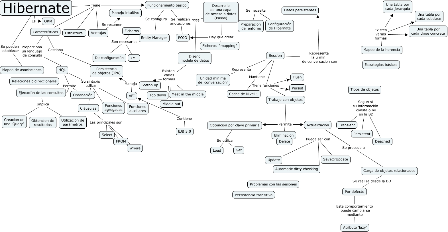 Este mapa conceptual tiene información relacionada a: mapHIBERNATE, Trabajo con objetos Permite Obtencion por clave primaria, Cláusulas Las principales son Where, Trabajo con objetos Permite Actualización, Diseño modelo de datos Existen varias formas Middle out, Session Mantiene Cache de Nivel 1, Desarrollo de una capa de acceso a datos (Pasos) Hay que crear Ficheros "mapping", Ficheros Son necesarios De configuración, Session Tiene funciones Flush, Trabajo con objetos Permite Eliminación, Carga de objetos relacionados Se realiza desde la BD Por defecto